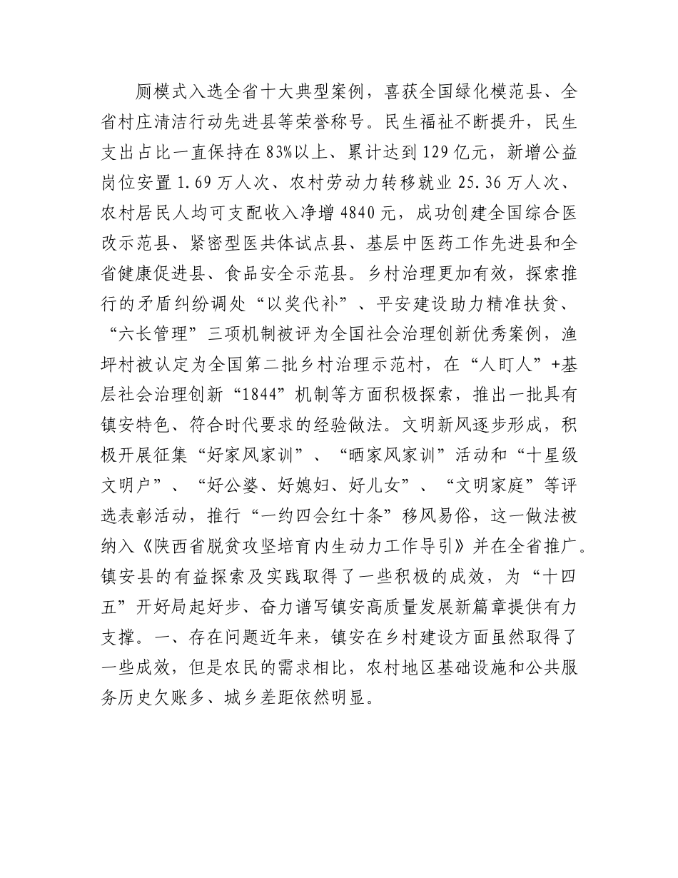 在浦东干部学院培训学习交流研讨材料实施乡村建设行动是党的十九届五中全会作出的重大部署是推进农业农村现代化的重要抓手。习近平总书记强调,要实施乡村建设行动,继续把公共基础设施建设的重点放在农村,在推进城乡基本公共服务均等化上持续发力,注重加强普惠性、兜底性、基础性民生建设。这为乡村建设指明了方向、提供了根本遵循。乡村要全面振兴,乡村建设是重点,必须要摆在重要位置,突出重点、强化举措,为加快推进农业农村现代化奠定坚实基础。“十三五”期间,镇安县下好脱贫攻坚成果巩固“先手棋”,打好农村人居环境“主动仗”,做好农业农村优先发展“大文章”,大力实施乡村建设行动,让乡村面貌有了显著变化。基础设施得到提升,建成集中安置点59个、搬迁群众8043户,累计建成饮水工程3000多处,改造提升高低压输电线路510千米,新建改造乡村公路2470公里,实施危房、民居改造1.79万户,实现所有农户安全饮水达标、安全住房保障、生活用电通达及所有行政村通动力电、通硬化路“五个全覆盖”。乡村环境明显改善,不断深化农村人居环境综合整治,创建省级生态镇8个、生态村5个,桃园、西川两村被评为全省美丽宜居示范村,丰收村荣膺“全国文明村”;我县“335”农村改厕模式入选全省十大典型案例,喜获全国绿化模范县、全省村庄清洁行动先进县等荣誉称号。民生福祉不断提升,民生支出占比一直保持在83%以上、累计达到129亿元,新增公益岗位安置1.69万人次、农村劳动力转移就业25.36万人次、农村居民人均可支配收入净增4840元,成功创建全国综合医改示范县、紧密型医共体试点县、基层中医药工作先进县和全省健康促进县、食品安全示范县。乡村治理更加有效,探索推行的矛盾纠纷调处“以奖代补”、平安建设助力精准扶贫、“六长管理”三项机制被评为全国社会治理创新优秀案例,渔坪村被认定为全国第二批乡村治理示范村,在“人盯人”+基层社会治理创新“1844”机制等方面积极探索,推出一批具有镇安特色、符合时代要求的经验做法。文明新风逐步形成,积极开展征集“好家风家训”、“晒家风家训”活动和“十星级文明户”、“好公婆、好媳妇、好儿女”、“文明家庭”等评选表彰活动,推行“一约四会红十条”移风易俗,这一做法被纳入《陕西省脱贫攻坚培育内生动力工作导引》并在全省推广。镇安县的有益探索及实践取得了一些积极的成效,为“十四五”开好局起好步、奋力谱写镇安高质量发展新篇章提供有力支撑。一、存在问题近年来,镇安在乡村建设方面虽然取得了一些成效,但是农民的需求相比,农村地区基础设施和公共服务历史欠账多、城乡差距依然明显。(一)村庄规划比较滞后。面对各村的情况千差万别等新形势、新需求,村庄规划编制的一些新问题也随之而来。一是科学性不足,原有规划普遍偏重于村庄内各类建设用地的布局,一味强调村庄的“发展”,对资源环境保护方面研究较弱,对“一户一宅”政策落实、农村闲置废弃集体建设用地流转盘活办法不多、破解无术,不能满足生态集约发展与土地精准利用的要求。二是参与度不高,在编制村庄规划过程中没有真正深入一线了解村情民意,一些村庄规划成果重“符合规范要求”、轻实际需要,落入“学究化”的窠臼,导致规划不接地气难以落地。三是风貌特色不明显,对“一方水土养一方人”的村庄个体遗传密码没有进行有效破解,对特有的乡风民俗、文化底蕴挖掘不够,导致产业谋划千篇一律、建筑引导万村同貌,村庄辨识度极低。(二)基础设施欠账较大。“十三五”期间,农村基础设施得到改善,但欠账依然较大。一是资金投入明显不足,县级财政困难,每年地方财力收入不足2亿元,对农业农村投入能力有限;大农业生产投资大、见效慢、回报率低,对工商资本和社会资金吸引力不够;新型经营主体缺少有效抵押物,贷款难、融资贵等问题突出。二是农业设施相对薄弱,高标准粮田建设和中低产田改造工程等相对滞后,农田水利设施十分缺乏,很难对农业生产提供持续的保障和促进作用,农业抵御自然灾害的能力不强。三是基础设施建设滞后,水、电、路、网、讯、仓储物流等设施相对较差,特别是山区农村通组路、产业路建设问题突出,还存在断头路...