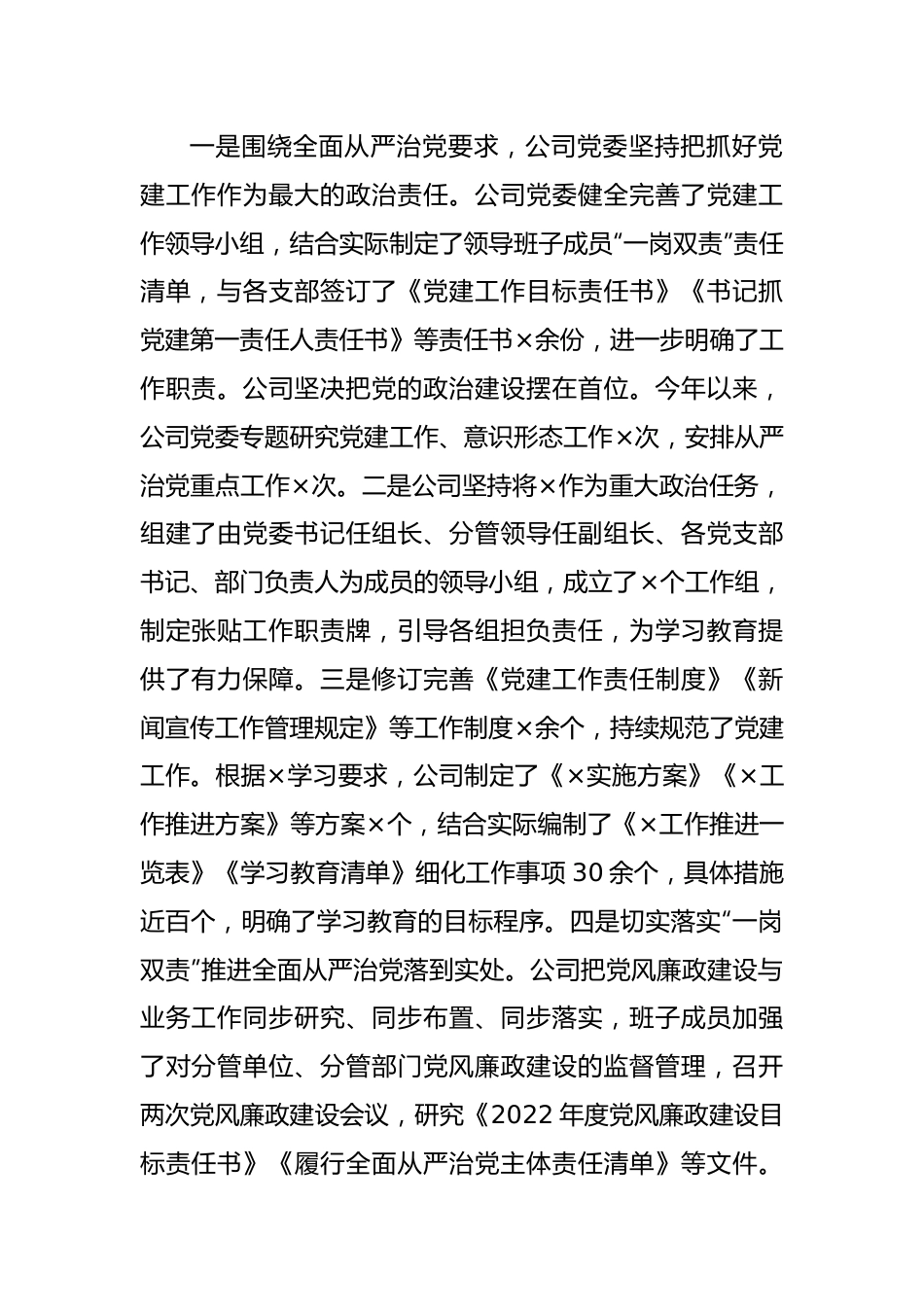 国企公司2022年上半年党建工作总结2022年上半年,在×党委的正确领导下,×公司扎实开展党建工作,切实发挥了基层党组织的战斗堡垒作用,为经济发展奠定了坚实基础。现将工作情况简要汇报如下:一、主要工作(一)筑牢责任担当,切实履行管党职责。一是围绕全面从严治党要求,公司党委坚持把抓好党建工作作为最大的政治责任。公司党委健全完善了党建工作领导小组,结合实际制定了领导班子成员“一岗双责”责任清单,与各支部签订了《党建工作目标责任书》《书记抓党建第一责任人责任书》等责任书×余份,进一步明确了工作职责。公司坚决把党的政治建设摆在首位。今年以来,公司党委专题研究党建工作、意识形态工作×次,安排从严治党重点工作×次。二是公司坚持将×作为重大政治任务,组建了由党委书记任组长、分管领导任副组长、各党支部书记、部门负责人为成员的领导小组,成立了×个工作组,制定张贴工作职责牌,引导各组担负责任,为学习教育提供了有力保障。三是修订完善《党建工作责任制度》《新闻宣传工作管理规定》等工作制度×余个,持续规范了党建工作。根据×学习要求,公司制定了《×实施方案》《×工作推进方案》等方案×个,结合实际编制了《×工作推进一览表》《学习教育清单》细化工作事项30余个,具体措施近百个,明确了学习教育的目标程序。四是切实落实“一岗双责”推进全面从严治党落到实处。公司把党风廉政建设与业务工作同步研究、同步布置、同步落实,班子成员加强了对分管单位、分管部门党风廉政建设的监督管理,召开两次党风廉政建设会议,研究《2022年度党风廉政建设目标责任书》《履行全面从严治党主体责任清单》等文件。领导干部利用各类学习,组织观看廉政教育警示片×次,受教育人数×人次。开展廉政谈话×场次×余人次。公司持之以恒改进工作作风。紧盯清明、“五一”、端午等重要时间节点,开展廉洁教育×场次,受教育×人次。通过多种措施,领导干部高效落实了“一岗双责”责任。(二)加强星级考评,正确引领企业发展方向。一是持续抓好“三大指数”星级考评工作。今年以来,×公司围绕“三大指数”星级评定考核方案,年初组织专题学习培训×场次,参加学习×人次。进一步规范强化了考评管理工作。按照方案程序规范,上半年组织对×余名党员进行了半年亮绩考核,对照考核亮绩标准,从×个方面进行了成绩记录,对照加分、扣分指数进行了加减分,按程序进行了公示。二是积极开展好“三亮三比三评”活动。结合×,对照党员的先锋指数标准,上半年根据工作实绩对工作清单、重点工作和工作成绩×余项内容进行了公示。结合×,×余名党员结合实际工作进行了微承诺、微分享,涉及内容×余项。三是坚持抓好干部职工思想教育。按照×的安排要求和计划,公司党委组织中心组学习×次,其中专题学习×知识专题学习×次,领导专题读书班学习×天,各党支部坚持每周半天学习,并按要求组织×次×专题学习,开展集中学习×余场次,组织交流研讨近×次,覆盖职工近千人次。四是不断丰富学习载体。公司各党支部充分运用网络平台开展“×故事我来讲”“诵读红色经典”等线上学习,党员职工讲述×故事、诵读经典×余个,各党支部组织党员观看红色电影×场次,参观×纪念馆等红色教育基地×余场次,参与党员职工×人次,通过多种形式强化了党员职工群众的思想教育和舆论引导。(三)以强基提质为根本,夯实组织工作基础。一是加强规范党建工作基础。持续规范完善发展党员、收缴党费、党务公开等工作程序。公司所属各党支部严格执行“三会一课”制度,按时召开支委会、党员大会等,认真讨论党建工作,保证党支部工作正常开展,上半年对收缴党费、干部选拔考察、学习体会等公开×余次,涉及内容×余项。二是严格执行发展党员工作规范,严把发展党员关坚持成熟一个发展一个的原则,组织吸引各类先进优秀青年加入党组织。上半年确定入党积极分子×人,发展对象×人,接收预备党员×人。三是强化党费管理。公司党委规范党费管理和使用,党员自觉按月足额缴纳党费,上半年收缴党费×元,慰问生活困难党员、先进模范等×人次,并发放了慰问金。(四)规范人才建设制度,加强...