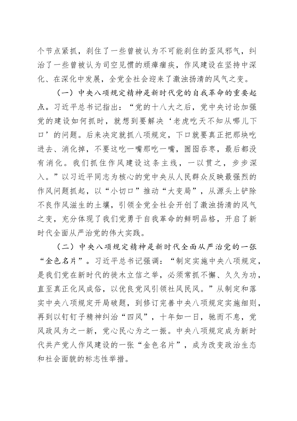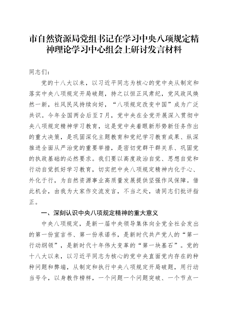 市自然资源局党组书记在学习xxx精神理论学习中心组会上研讨发言材料同志们:党的十八大以来,以习近平同志为核心的党中央从制定和落实xxx开局破题,持之以恒正风肃纪,党风政风焕然一新,社风民风持续向好,“八项规定改变中国”成为广泛共识。今年全国两会后至7月,党中央在全党开展深入贯彻xxx精神学习教育,这是党中央着眼新形势新任务作出的重大决策,是巩固深化主题教育和党纪学习教育成果、纵深推进全面从严治党的重要举措,是密切党群干群关系、巩固党的执政基础的必然要求。我们要以高度政治自觉、思想自觉和行动自觉抓好学习教育,切实把xxx精神内化于心、外化于行,为自然资源事业高质量发展提供坚强作风保障。借此机会,由我为大家作交流发言,不当之处,请同志们批评指正。一、深刻认识xxx精神的重大意义xxx,是新一届中央领导集体向全党全社会发出的第一份宣言书、第一份承诺书,是新时代共产党人的“第一行动纲领”,是新时代十年伟大变革的“第一块基石”。党的十八大以来,以习近平同志为核心的党中央直面党内存在的种种问题和弊端,从制定和执行xxx开局破题,用行动当号令,以身教作榜样,一个问题一个问题突破、一个节点一个节点紧抓,刹住了一些曾被认为不可能刹住的歪风邪气,纠治了一些曾被认为司空见惯的顽瘴痼疾,作风建设在坚持中深化、在深化中发展,全党全社会迎来了激浊扬清的风气之变。(一)xxx精神是新时代党的自我革命的重要起点。习近平总书记指出:“党的十八大之后,党中央讨论加强党的建设如何抓时,就想到要解决‘老虎吃天不知从哪儿下口’的问题。后来决定就抓八项规定,下口就要真正把那块吃进去、消化掉,不要这吃一嘴那吃一嘴,囫囵吞枣,最后都没有消化。我们抓住作风建设这条主线,一以贯之,步步深入。”以习近平同志为核心的党中央从人民群众反映最强烈的作风问题抓起,以“小切口”推动“大变局”,从源头上铲除不良作风滋生的土壤,引领全党全社会开创了激浊扬清的风气之变,充分体现了我们党勇于自我革命的鲜明品格,开启了新时代全面从严治党的伟大实践。(二)xxx精神是新时代全面从严治党的一张“金色名片”。习近平总书记强调:“制定实施xxx,是我们党在新时代的徙木立信之举,必须常抓不懈、久久为功,直至真正化风成俗,以优良党风引领社风民风。”从制定和落实xxx开局破题,到修订完善xxx实施细则,再到以钉钉子精神纠治“四风”,十年如一日,驰而不息,党风政风为之一新,党心民心为之一振。xxx成为新时代共产党人作风建设的一张“金色名片”,成为改变政治生态和社会面貌的标志性举措。(三)xxx精神是推进中国式现代化的有力保障习近平总书记指出:“中国式现代化是中国共产党和中国人民长期实践探索的成果,是一项伟大而艰巨的事业。”推进中国式现代化,是一项前无古人的开创性事业,必然会遇到各种可以预料和难以预料的风险挑战、艰难险阻甚至惊涛骇浪。只有持之以恒贯彻落实xxx精神,坚持不懈改作风转作风,始终保持同人民群众的血肉联系,始终同人民同呼吸、共命运、心连心,才能凝聚起推进中国式现代化的磅礴力量。二、准确把握xxx精神的核心要义习近平总书记关于加强党的作风建设的重要论述,深刻回答了新时代作风建设怎么看、怎么抓等一系列重大理论和实践问题,丰富和发展了马克思主义建党学说,为持之以恒落实xxx精神、深化作风建设提供了根本遵循。我们要深入学习领会,准确把握xxx精神的核心要义,切实增强贯彻落实的思想自觉、政治自觉和行动自觉。(一)坚持以人民为中心的根本立场。习近平总书记强调:“我们党来自人民、植根人民、服务人民,一旦脱离群众,就会失去生命力。”xxx从调查研究、密切联系群众等具体问题抓起,充分体现了我们党坚持以人民为中心的根本立场,彰显了我们党全心全意为人民服务的根本宗旨。我们要始终牢记党的根本宗旨,坚持人民至上,把人民对美好生活的向往作为奋斗目标,想群众之所想、急...