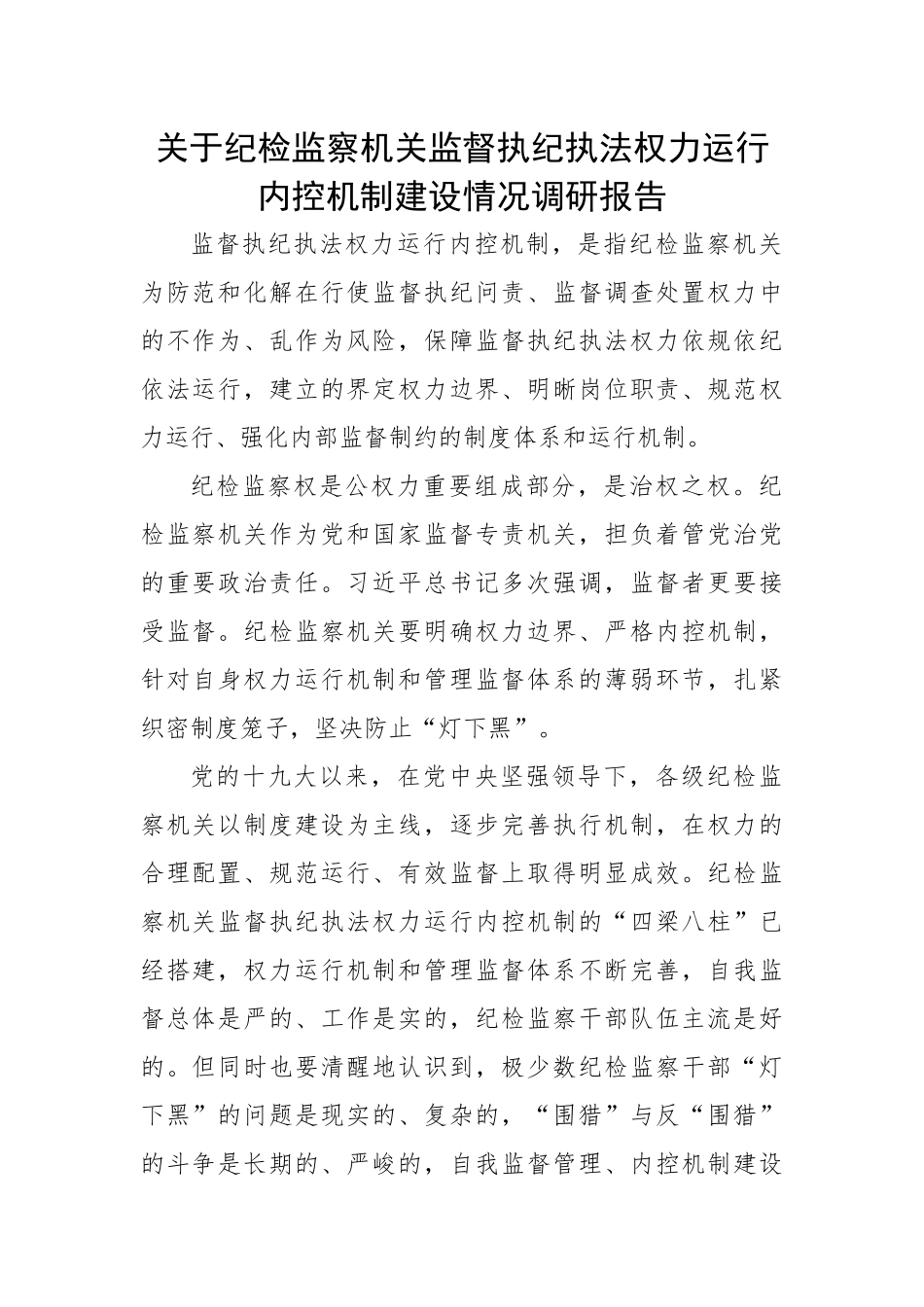 关于纪检监察机关监督执纪执法权力运行内控机制建设情况调研报告监督执纪执法权力运行内控机制,是指纪检监察机关为防范和化解在行使监督执纪问责、监督调查处置权力中的不作为、乱作为风险,保障监督执纪执法权力依规依纪依法运行,建立的界定权力边界、明晰岗位职责、规范权力运行、强化内部监督制约的制度体系和运行机制。纪检监察权是公权力重要组成部分,是治权之权。纪检监察机关作为党和国家监督专责机关,担负着管党治党的重要政治责任。习近平总书记多次强调,监督者更要接受监督。纪检监察机关要明确权力边界、严格内控机制,针对自身权力运行机制和管理监督体系的薄弱环节,扎紧织密制度笼子,坚决防止“灯下黑”。党的十九大以来,在党中央坚强领导下,各级纪检监察机关以制度建设为主线,逐步完善执行机制,在权力的合理配置、规范运行、有效监督上取得明显成效。纪检监察机关监督执纪执法权力运行内控机制的“四梁八柱”已经搭建,权力运行机制和管理监督体系不断完善,自我监督总体是严的、工作是实的,纪检监察干部队伍主流是好的。但同时也要清醒地认识到,极少数纪检监察干部“灯下黑”的问题是现实的、复杂的,“围猎”与反“围猎”的斗争是长期的、严峻的,自我监督管理、内控机制建设永远在路上,丝毫不能懈怠。党的十九届六中全会全面总结党的百年奋斗重大成就和历史经验,为深入推进新时代党的自我革命、全面从严治党指明了前进方向。纪检监察机关是党内监督和国家监察专责机关,要深刻认识“明确权力边界、严格内控机制”是实现纪检监察工作高质量发展的现实需要,也是不敢腐、不能腐、不想腐一体化推进取得更多制度性成果和更大治理成效的前提条件。建立健全内控机制,要始终坚持党对纪检监察工作的领导,紧扣高质量发展的主题主线,坚持目标导向与问题导向统一、赋权与控权并重、控权与效率兼顾、系统集成与及时管用融合的原则,围绕管住人、管住事、管住权,针对发现的问题和风险,坚定稳妥、突出重点、分类施策、稳步推进。1.完善内控机制,解决制度“够用”问题士在行使监督权方面。要进一步明确权力边界、履责标准,压缩自由裁量空间,规范监督权力行使。规范线索管理监督等工作,形成管理闭环。进一步明确派驻机构履行职责的内容、标准、程序和要求,规范派驻机构权力,特别是监督权的行使。指导推进基层监督信息化建设,切实提升基层监督实效。研究制定具有可操作性的日常监督工作指南,指导全系统做细做实日常监督工作,找准找实监督的切入点、关键点,切实增强监督的自觉性、精准性。切实加强政治生态研判,完善党风廉政意见回复工作的制度机制,提高回复意见的精准性和及时性。从制度机制层面统筹考虑推动解决派驻机构、基层纪委监委内部监督力量不足的问题。在行使审查调查权方面。要进一步健全完善有关制度,督促制度执行,强化责任追究,确保审查调查权力不被滥用。制定全系统适用的审查调查措施使用、涉案财物管理等相关规定,作为监察法实施条例的配套制度,做到各类措施依法使用、从严慎用。推进受贿行贿一起查,规范对行贿人的处理,建立行贿人“黑名单”制度,综合运用纪律、法律、行政、经济等多种手段惩戒教育行贿人。规范纪律检查建议书和监察建议书的运用,以问题推动查补漏洞、以案件促进整改整治,提升以案促改、以案促治的质量和水平。制定适用全系统的违纪违法犯罪案件证据标准,出台规范性指导意见。在行使处置处分权方面。运用“四种形态”要发挥组织作用、组织优势,坚持民主集中制,集体研究、集体决策,严格组织程序,听取党委(党组)和有关方面意见。深入调研“四种形态”适用情形,总结研究“四种形态”运用典型案例,加强系统指导,努力做到每一种形态的适用都精准、规范。做好案件审理审核把关,加强与组织部门和执法司法机关的衔接配合,切实强化对运用“四种形态”的监督制约。建立健全错案责任追究制度,完善申诉复查制度。制定处分执行相关配套制度,确保处置处分权得到精准有效行使。在权力监督管理方面。要建立健全权力运行管理监督的制度体系,加强政策法规解读,开展全员专题培训,加深理解和掌握,促进规范...