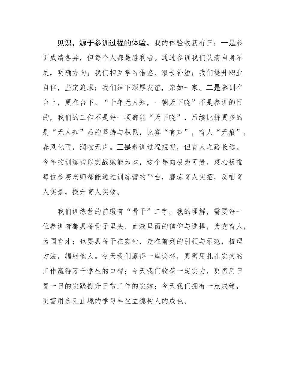 在2024年全国高校辅导员素质能力提升骨干训练营结营仪式上的发言各位领导、各位参训老师:大家下午好!我是第X届参训选手X,来自X。非常荣幸能够作为往届参训选手代表在这里发言,话成长、谈收获、展未来。训练营是检验辅导员工作能力、交流工作心得的大舞台,体现了教育部对高校辅导员队伍建设的高度重视。和今天所有的选手一样,我们每一名往届生也都倍加珍惜这难得的学习提高机会,实训赋能,开阔眼界,努力提升自身的专业素质和职业能力。这些滋养,受益终身。xxxx年,作为一名工作已满xx个年头,放弃专业教师身份留在学生教育管理工作岗位上的老辅导员,我面临职业发展的瓶颈与突破。训练营给我打开了一扇窗,远山石径,通往白云深处,也通往知识、素养和能力的高峰。我想看看外面的风景有多美,也想试试自己可以走多远。这条路充满挑战的艰辛,更有收获的惊喜。2014年备训,2015年全程参与,除了成绩,我更收获了胆识、知识和见识的成长。胆识,源于参训过程的淬炼。毫无疑问,比拼是有压力的,这种压力来自自我的期许和外界的期盼。但正视和战胜了这些压力,每个人都收获满满。我的体会是,经历过大赛训练营,我的胆子更大了,心理素质变得更好,工作中的抗压性变得更强;但我的胆子也更小了,从“谈话谁不会”的无知无畏到“谈心有方法”的实践反思,从“我有丰富经验”的感性偏差到“我有能力短板”的理性回归。在累积与释放压力的过程中,在无畏与敬畏心理的交织中,实现了胆识的提升与蝶变。知识,源于参训过程的积累。这份收获,相信每位参训老师都感同身受。通过研读文件、学习讲话,提升了政治素养,让我们对当前思想政治教育工作的重点难点热点问题有了更清晰的认识;通过学情分析、研判案例,提升了工作能力,让我们对辅导员运用思想政治教育及相关学科知识解决学生疑难问题有了更多元的思考;通过谈心谈话、思路梳理,提升了说理能力和语言水平,让我们对辅导员“人生导师”“知心朋友”的工作定位有了更深刻的体悟。见识,源于参训过程的体验。我的体验收获有三:一是参训成绩各异,但每个人都是胜利者。通过参训我们认清自身不足,明确方向;我们相互学习借鉴、取长补短;我们提升职业自信,坚定追求;我们结下深厚友谊,亲如一家。二是参训在台上,更在台下。“十年无人知,一朝天下晓”不是参训的目的,我们的工作不是每一项都能“天下晓”,后续比拼更多的是“无人知”后的坚持与积累,比赛“有声”,育人“无痕”,春风化雨,润物无声。三是参训过程短暂,但育人之路长远。今年的训练营以实战赋能为本,这个导向极为可贵,衷心祝福每位参赛老师都能通过训练营的平台,磨炼育人实招,反哺育人实景,提升育人实效。我们训练营的前缀有“骨干”二字。我的理解,需要每一位参训者都具备骨子里头、血液里面的信仰与选择,为党育人,为国育才;也要具备干在实处、走在前列的引领与示范,梳理方法,辐射他人。今天我们赢得一座奖杯,更需用扎扎实实的工作赢得万千学生的口碑;今天我们收获一定实力,更需用日复一日的实践提升日常工作的实效;今天我们拥有一点成绩,更需用永无止境的学习丰盈立德树人的成色。种桃种李种春风,亦师亦友亦真情,高校辅导员工作,责任重大,使命光荣。参训有结果,结营后分离,但立德树人的赛场,我们不分胜负,从未分开,比学赶超,接续奋斗。感谢思政司和研究会搭建平台,感谢训练营带给我们的成长和收获,更要祝贺每一位胆识、知识、见识过人的你们。谢谢大家。