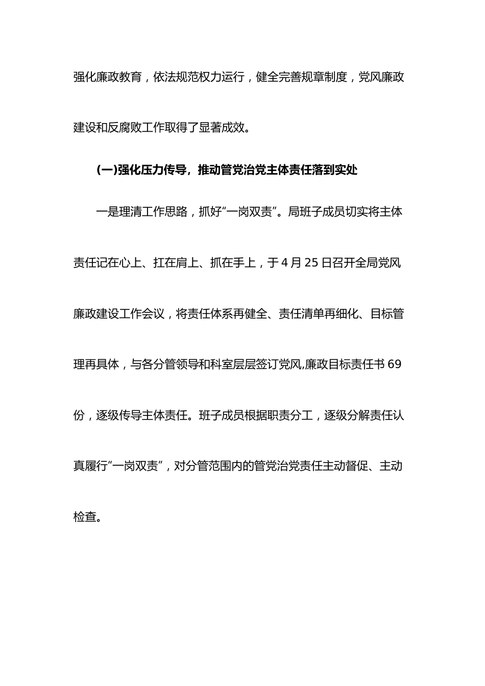 2022年党风廉政建设工作总结(6篇)2022年党风廉政建设工作总结1今年以来,市人社局在市委、市纪委的正确领导下,在市纪委第二派驻纪检组的指导下,认真贯彻十一届市纪委全会精神,深入落实“两个责任”,扎实推进党风廉政重点任务,持之以恒遵守中央各项规定精神,紧紧围绕年度党风廉政建设工作任务,坚定不移地筑牢党风廉政建设防线,做好廉政风险防控工作,为推动人社事业发展提供了有利的纪律保障。现将20__年上半年工作汇报如下:一、履职尽责,党风廉政建设工作稳步推进局党组始终坚持把落实全面从严治党主体责任作为首要政治任务,深入贯彻落实“3783”主体责任体系、“866”衡量检验标尺和“111”督查落实细则,全面落实党组党风廉政建设主体责任,不断强化廉政教育,依法规范权力运行,健全完善规章制度,党风廉政建设和反腐败工作取得了显著成效。(一)强化压力传导,推动管党治党主体责任落到实处一是理清工作思路,抓好“一岗双责”。局班子成员切实将主体责任记在心上、扛在肩上、抓在手上,于4月25日召开全局党风廉政建设工作会议,将责任体系再健全、责任清单再细化、目标管理再具体,与各分管领导和科室层层签订党风,廉政目标责任书69份,逐级传导主体责任。班子成员根据职责分工,逐级分解责任认真履行“一岗双责”,对分管范围内的管党治党责任主动督促、主动检查。二是扎实开展思想教育,筑牢廉政思想防线。在每月党组中心组学习会上,认真学习党的十八届六次全会、习近平总书记系列重要讲话及上级部门重要文件精神,重点学习了《党章》、《准则》和《条例》等新颁布党纪党规,不断强化理想信念教育,牢固树立并不断强化“四个意识”,有效提升领导班子成员党性修养。组织领导班子成员及全局干部职工手抄“十严禁”、“十不准”纪律要求,做到了牢记于心,外化于行,筑牢反腐守廉和遵规守纪的思想防线。三是严肃党内政治生活,增强党组织的战斗力。自觉把讲政治贯穿于党性锻炼和业务工作的全过程,全面落实“三会一课”、民主生活会、组织生活会、民主评议党员、谈心谈话和双重组织生活等制度,认真召开了年度局党组“两学一做”民主生活会和三个党支部组织生活会,做到了准备充分、程序严格、剖析深刻、批评严肃,达到了团结一批评一团结的目的。四是认真落实党内监督,强化执纪问责。加大对重大节假日期间的监督检查力度,在春节、清明、五一等节假日前,召开专题会议,组织全体干部集体学习中央和纪委重要会议精神和纪律规定,进一步强化大局意识、担当意识和权责意识。7名班子成员均能严格执行党员领导干部个人事项报告的有关要求,如实上报个人事项。根据市纪委开展“述责述廉”工作的要求,围绕推进党风廉洁建设和反腐败工作等重点工作任务,下发了市人社局党组《关于印发开展_年度述责述廉工作通知》,安排全体科级干部分别于6月和12月开展“两述”工作,不断推动党员领导干部规范用权、廉洁履职。年以来,处理市纪委转办的有关信访问题线索6件,市委组织部函询1件,12345热线转办的投诉2起;对省审计厅审计发现问题涉及的7名同志和涉及经商办企业的2名同志进行了提醒谈话,对纪委进行纪律审查的1名同志进行了诫勉谈话。开展了_年纪委转办交办案件整理工作,共梳理出案件11件,整理完善档案卷宗6件。(二)强化作风建设,促进各项权力规范运行一是深入开展党风廉政建设,增强党员干部廉政意识。健全完善党风廉政工作月安排部署、党组中心组学习、“三会一课”、机关学习例会等制度,充分运用“在线学习”、“网络学习”、专题培训、党支部书记上党课等形式,开展党员理想信念、党性党风党纪教育,提升党员党性修养。共传达中央、省委和市委重要会议精神7次,学习各级纪委相关文件和作风纪律有关规定6次,开展学习宣讲6次,召开支部书记党课2次。组织全局干部职工手抄“十严禁”、“十不准”纪律要求,做到了牢记于心,外化于行,不断增强党员干部的廉政意识和法制意识,始终拧紧廉洁从政的螺丝钉,筑牢反腐守廉和遵规守纪的思想防线。二是坚持依法决策,规范权力运行。严格执行民主集中制,落实“三重一大”集体决策、一把手“五不直接分管”和“末位表态”制度...