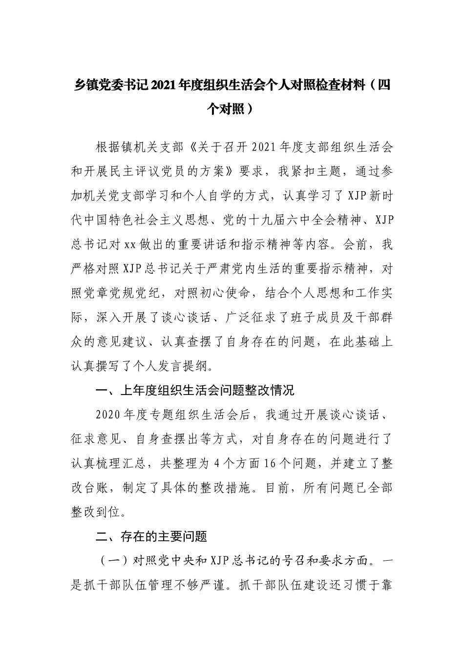 乡镇党委书记2021年度组织生活会个人对照检查材料(四个对照)根据镇机关支部《关于召开2021年度支部组织生活会和开展民主评议党员的方案》要求,我紧扣主题,通过参加机关党支部学习和个人自学的方式,认真学习了XJP新时代中国特色社会主义思想、党的十九届六中全会精神、XJP总书记对xx做出的重要讲话和指示精神等内容。会前,我严格对照XJP总书记关于严肃党内生活的重要指示精神,对照党章党规党纪,对照初心使命,结合个人思想和工作实际,深入开展了谈心谈话、广泛征求了班子成员及干部群众的意见建议、认真查摆了自身存在的问题,在此基础上认真撰写了个人发言提纲。一、上年度组织生活会问题整改情况2020年度专题组织生活会后,我通过开展谈心谈话、征求意见、自身查摆出等方式,对自身存在的问题进行了认真梳理汇总,共整理为4个方面16个问题,并建立了整改台账,制定了具体的整改措施。目前,所有问题已全部整改到位。二、存在的主要问题(一)对照党中央和XJP总书记的号召和要求方面。一是抓干部队伍管理不够严谨。抓干部队伍建设还习惯于靠行政手段、个人威信,靠思想交流进行沟通,凝聚人心做的还不够。比如,虽然制定了有效的管理制度,但以制度约束人、以机制激励人、以表率带动人、以真诚感召人的氛围还不够浓厚,针对个别同志工作中存在的工作拖拉、效率低下的问题未能及时给予批评教育或严肃处理。二是从严治党责任落实还不到位。由于日常工作繁琐、任务繁重、业务工作量大,往往把人员和主要精力都放在了单位中心工作上,有时把主体责任安排给副职落实,亲自抓执行还不够。比如,对于各支部书记抓党建、严肃党内生活等方面要求不够严格,个别支部党内组织生活制度落实不规范对党员教育管理重形式轻内容,对个别党员违纪违法问题未及早发现并及时处理。三是民主集中制落实的还不够好落实民主议事制度不够严格,有时组织召开会议时未能充分征求班子成员的意见。比如,有时在班子成员对相关议题还未充分酝酿的情况下,就组织召开会议,导致部分问题决策不够科学、合理。(二)对照新时代合格党员标准方面。一是宗旨意识淡化的问题没有彻底解决。为群众解决急难愁盼问题的办法不多,对群众反映的一些问题,调查研究不够深入,听取意见建议不够广泛。比如,在平时工作中,将大部分精力都投放在了对建档立卡贫困户群众的关心关注上,对一般户的情况过问得比较少。对于一些长期遗留的问题、一些缠访的群众,设身处地帮助解决他们问题还不够。二是反对“四风”措施不力。在平时工作中对于听到或发觉的一些涉及“四风”方面的苗头性、倾向性问题,存在心慈手软、查处不力的问题,导致党员干部违纪案件时有发生。比如,在低保评议工作中,个别村党组织负责人不认真履职、不严格按照程序开展低保评议,导致错保漏保的问题时有发生,每年都会出现个别村干部因低保评定不准而被组织问责的问题。(三)对照入党誓词方面。一是抓落实、解难题的魄力还不够大。对于一些常年积累的矛盾和问题、群众反响强烈的突出问题,还未能及时采取有效措施加以解决,导致一些矛盾久拖不决、甚至出现越级上访的问题。比如,面对xx村个别搬迁户房屋裂缝、个别村农业用水紧张或不均衡、项目资金落实不到位等问题,没有及时采取切实可行的措施加以解决,导致群众上访件、信箱留言不断,甚至还出现了群众到政府上访的情况;再如,在易地扶贫搬迁工作中,对如何发展后续产业,虽然提出了一些思路,.网整理采取了一定措施,但是距离“搬得出、稳得住、能发展、可致富”的目标,还存在一定差距。二是调查研究不够深入。在农村一线工作,面临的问题都是特别现实和具体的,开展调查研究就显得十分必要而迫切。但是,由于平时工作琐碎繁杂,每次深入村社农户开展调研时,存在针对性不强、了解情况不具体、调查对象不广泛等问题调研结束后,也很少进行深入思考、总结提炼,不能有效指导实践工作的开展。比如,每周都会拿出一定的时间到各村开展工作督查和调研,探索提出一些有效做法,但是未能形成可复制可推广的经验,用于推动全镇工作的落实。(四)对照革命先辈和先进典型方面。标准要求与实际工作还存在...