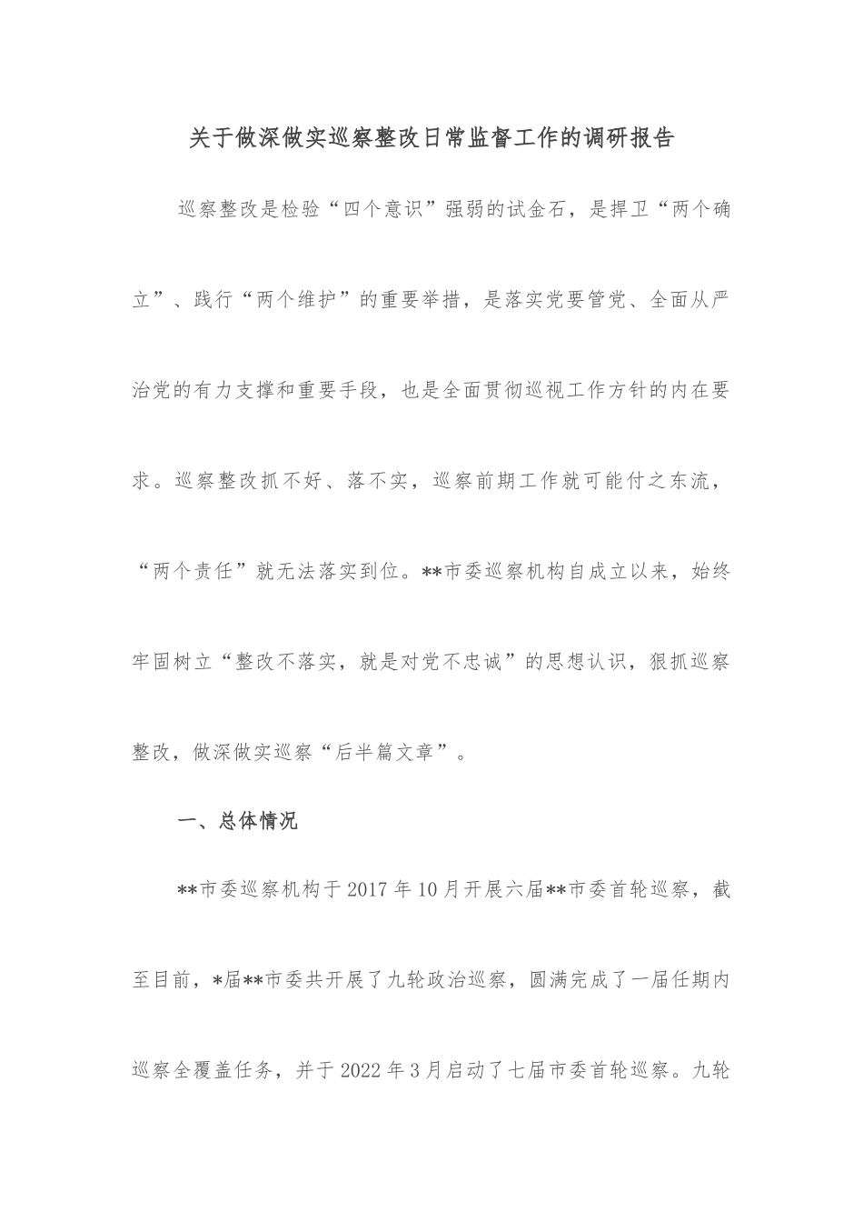 关于做深做实巡察整改日常监督工作的调研报告巡察整改是检验“四个意识”强弱的试金石,是捍卫“两个确立”、践行“两个维护”的重要举措,是落实党要管党、全面从严治党的有力支撑和重要手段,也是全面贯彻巡视工作方针的内在要求。巡察整改抓不好、落不实,巡察前期工作就可能付之东流,“两个责任”就无法落实到位。**市委巡察机构自成立以来,始终牢固树立“整改不落实,就是对党不忠诚”的思想认识,狠抓巡察整改,做深做实巡察“后半篇文章”。一、总体情况**市委巡察机构于2017年10月开展六届**市委首轮巡察,截至目前,*届**市委共开展了九轮政治巡察,圆满完成了一届任期内巡察全覆盖任务,并于2022年3月启动了七届市委首轮巡察。九轮常规巡察共计发现问题2933个,移交问题线索285件,立案114件,给予党纪政务处分112人。二、巡察整改存在的主要问题在工作中,我们发现个别被巡察单位在落实整改工作要求上还存在着一些问题和不足,主要体现在:一是治本作用发挥不够充分。个别单位就整改而整改,简单“就事论事”,举一反三意识不强,整改措施缺乏延伸性和拓展性,由点及面、制度治本作用发挥不够充分。二是集中整改与日常监督不连贯。前期巡察整改主要是2至3个月的集中整改,集中整改期结束后,有的被巡察单位就“无人问津”了,一些问题没有整改到位。由于日常监督不够,一些历史遗留、复杂问题,没人愿意牵头,容易造成“新官不理旧账”。三是巡察整改的刚性约束不够。对整改措施是否对应反馈的问题,整改推进的实际成效等缺乏科学合理的判断依据。三、强化整改和成果运用的探索与实践近年来,**市委巡察机构坚决贯彻落实中央、省市关于巡视巡察整改工作的部署要求,着力从做好巡察“双反馈”、加强整改制度建设、压实整改主体责任、完善日常监督机制,强化督办检查等方面入手,不断强化巡察整改刚性约束。一是做好“双反馈”文章。为从一开始就释放强化整改鲜明信号,我们将巡察发现的问题向被巡察单位党组织反馈的同时,向分管的市委、市政府领导进行反馈,形成分管市级领导、巡察办、巡察组、被巡察单位党组织对巡察巡察发现问题齐抓共管,多方面督促整改的局面。对干部群众反映强烈、明显违反规定并且能够马上解决的问题,及时下发立巡立改通知书,督促被巡察单位限时整改、限时反馈。将巡察发现的问题原汁原味地向被巡察单位进行“双反馈”,要求被巡察党组织对反馈问题即知即改、立巡立改。对共性和倾向性问题,加强归纳提炼,推动被巡察党组织和相关部门加强监管、堵塞漏洞、完善制度,构筑起健全的治理体系,进一步提升治理能力。二是加强整改制度建设。“无规矩不成方圆”,在深入总结前几轮巡察整改工作经验的基础上,结合**巡察工作实际,先后制定出台了《**市委巡察反馈问题整改实施方案(试行)》《关于进一步加强巡察整改督查工作的实施意见》《**市委巡察整改日常监督工作流程》《**市委巡察整改年度评估指标》等一系列涉及巡察整改的工作制度,以制度保障巡察整改扎实有效。三是压实整改主体责任。主体责任能否落实,是巡察整改的关键。**市委巡察办要求被巡察党组织要提高思想认识,从落实“两个维护”的政治高度,切实担起整改主体责任,对巡察反馈的每一个问题,都要持续跟踪、推动解决,做到件件有着落、事事见成效。同时要求党委(党组)书记要担起第一责任人职责,真正把巡察整改作为分内之事、应尽之责,直接抓、抓具体、抓到底,通过层层落实整改责任,形成全部门动手一起抓整改的良好局面。四是完善日常监督机制。以**市委巡察整改日常监督工作流程为参考,结合我市实际,制定了《**市委巡察整改日常监督工作流程》,规范了巡察整改日常监督“谁来领导、谁来实施、监督什么、如何监督”的问题,细化了市委巡察机构、市纪委监委、组织部门、宣传部门等日常监督部门需要承担的日常监督任务,明确了整改不同阶段、关键节点的日常监督时间表,清晰呈现了巡察反馈、巡察移交、集中整改、监督检查、整改公开、持续整改、报告报备、成果运用8个巡察整改阶段的日常监督步骤,规范工作流程,厘清环节流转,有效促进巡察工作程序化、标准化、规范化开展...