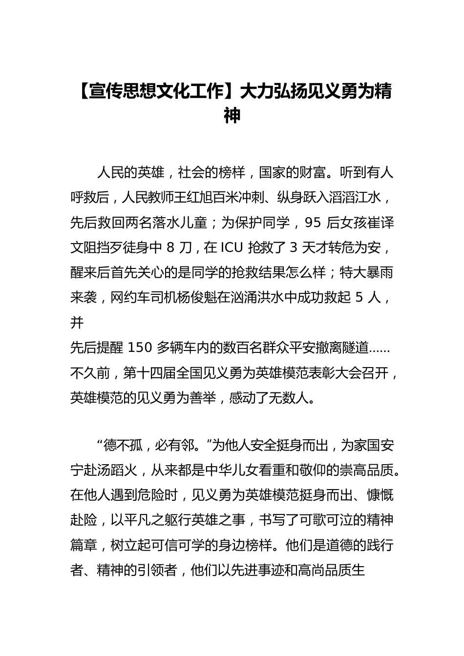 【宣传思想文化工作】大力弘扬见义勇为精神人民的英雄,社会的榜样,国家的财富。听到有人呼救后,人民教师王红旭百米冲刺、纵身跃入滔滔江水,先后救回两名落水儿童;为保护同学,95后女孩崔译文阻挡歹徒身中8刀,在ICU抢救了3天才转危为安,醒来后首先关心的是同学的抢救结果怎么样;特大暴雨来袭,网约车司机杨俊魁在汹涌洪水中成功救起5人,并先后提醒150多辆车内的数百名群众平安撤离隧道……不久前,第十四届全国见义勇为英雄模范表彰大会召开,英雄模范的见义勇为善举,感动了无数人。“德不孤,必有邻。”为他人安全挺身而出,为家国安宁赴汤蹈火,从来都是中华儿女看重和敬仰的崇高品质。在他人遇到危险时,见义勇为英雄模范挺身而出、慷慨赴险,以平凡之躯行英雄之事,书写了可歌可泣的精神篇章,树立起可信可学的身边榜样。他们是道德的践行者、精神的引领者,他们以先进事迹和高尚品质生动诠释了社会主义核心价值观的丰富内涵。高规格表彰见义勇为英雄模范,为的就是在全社会大力弘扬他们身上展现的英勇无畏、匡扶正义的鲜明品格,营造崇尚英雄、学习英雄、关爱英雄的浓氛围,努力使见义勇为♘成为人民群众的道德准则、行为原则、自发选择。“一人兴善,万人可激”。崇尚英雄才会产生英雄,争做英雄才能英雄辈出。党的十八大以来,各地各有关部门大力弘扬见义勇为精神,全面加强宣传引导、评选表彰、权益保障等工作,见义勇为事业取得长足进步。人民尚正义,社会有正气,民族才会生生不息,国家才会兴旺发达。在新时代新征程上,必须充分利用多平台、多途径、多方式褒奖、宣传见义勇为英雄事迹,让更多的人见贤思齐,更加坚定对见义勇为者的认同,从而积极主动加入见义勇为的行列之中。同时,我们也要深入弘扬见义勇为英雄事迹集中体现出的中华美德和社会主义核心价值观,不断激发全社会明德惟馨、崇德向善的内生动力,让凡人善举成为时代风景,让美德浸润社会每个角落。弘扬见义勇为精神,离不开持续有效筑牢法治基石、增强制度保障。在突发紧急条件下,特别是救助者自身都面临危险的情况下,见义勇为往往意味着要承担高风险。道不可坐论,德不能空谈。只有健全见义勇为权益保障制度机制,加强政策支持、优待帮扶和执法司法保障,才能消除见义勇为者的后顾之忧,推动形成崇尚、支持、敢于见义勇为的良好社会风尚。伟大的事业呼唤伟大的精神,崇高的梦想呼唤崇高的品德。习近平总书记深刻指出:“新时代是需要英雄并一定能够产生英雄的时代。”新时代新征程,更需要榜样的力量、榜样的激励。充分发挥见义勇为表彰奖励的精神引领、典型示范作用,以英雄模范影响人、感召人、带动人,必将推动形成好人好事层出不穷、善行义举不断涌现的生动局面,为建设更高水平的平安中国、法治中国汇聚强大正能量。