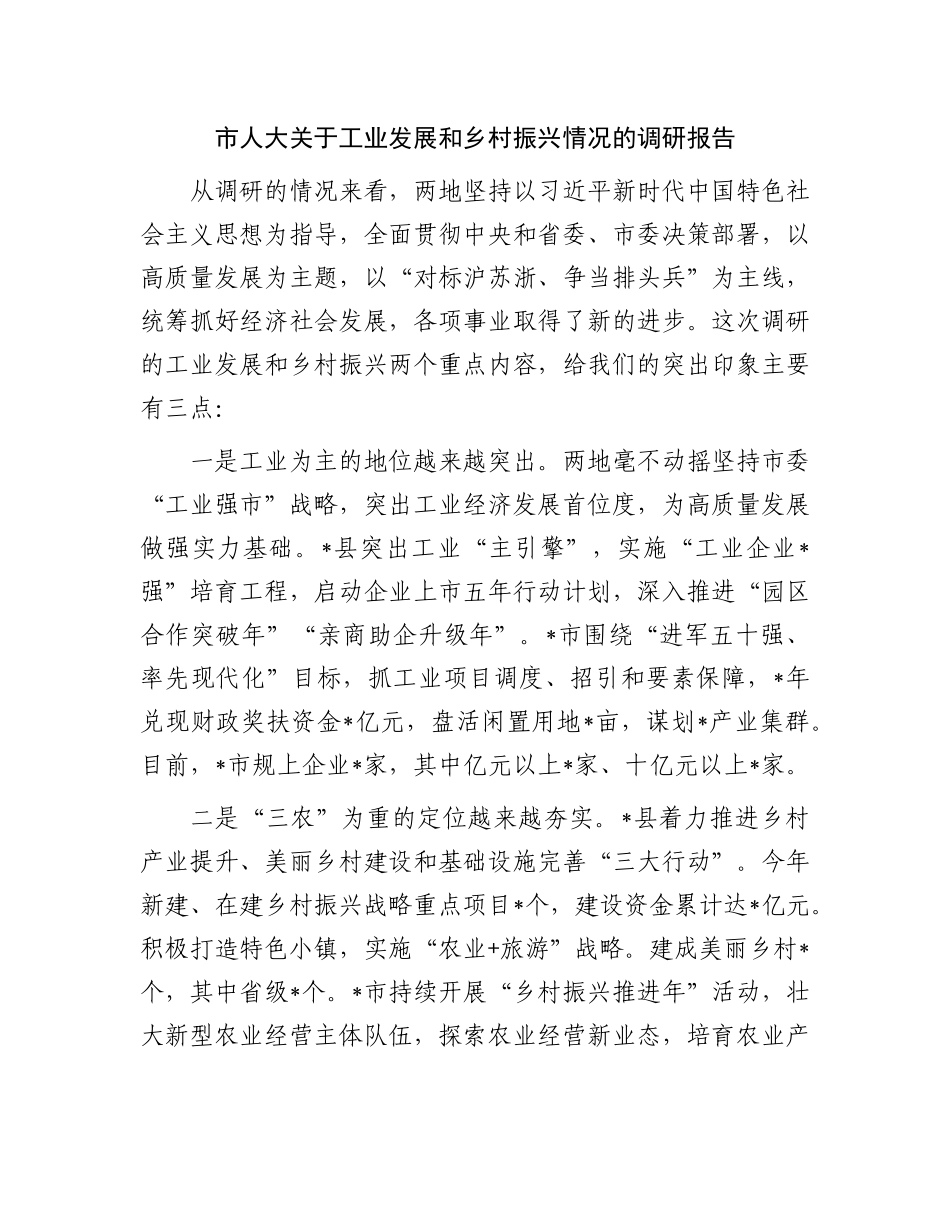 市人大关于工业发展和乡村振兴情况的调研报告从调研的情况来看,两地坚持以习近平新时代中国特色社会主义思想为指导,全面贯彻中央和省委、市委决策部署,以高质量发展为主题,以“对标沪苏浙、争当排头兵”为主线,统筹抓好经济社会发展,各项事业取得了新的进步。这次调研的工业发展和乡村振兴两个重点内容,给我们的突出印象主要有三点:一是工业为主的地位越来越突出。两地毫不动摇坚持市委“工业强市”战略,突出工业经济发展首位度,为高质量发展做强实力基础。*县突出工业“主引擎”,实施“工业企业*强”培育工程,启动企业上市五年行动计划,深入推进“园区合作突破年”“亲商助企升级年”。*市围绕“进军五十强、率先现代化”目标,抓工业项目调度、招引和要素保障,*年兑现财政奖扶资金*亿元,盘活闲置用地*亩,谋划*产业集群。目前,*市规上企业*家,其中亿元以上*家、十亿元以上*家。二是“三农”为重的定位越来越夯实。*县着力推进乡村产业提升、美丽乡村建设和基础设施完善“三大行动”。今年新建、在建乡村振兴战略重点项目*个,建设资金累计达*亿元。积极打造特色小镇,实施“农业+旅游”战略。建成美丽乡村*个,其中省级*个。*市持续开展“乡村振兴推进年”活动,壮大新型农业经营主体队伍,探索农业经营新业态,培育农业产业化龙头企业*家、农民专业合作社*家、省级示范家庭农场*家,获评全国首批农村创业创新典型县范例。三是真抓实干的作风越来越鲜明。在两地调研中,通过企业家和基层群众的了解,县、乡、村各级干部贯彻落实市委“四个聚焦”要求,以强烈的发展意识、担当意识、服务意识,创优“四最”营商环境,帮助企业和基层群众解决实际困难和问题。对定下来的事情,能够以“钉钉子”“马上办”“办到底”的工作作风抓好落实。积极构建“亲清”新型政商关系•,在守住底线的前提下与企业家真心实意地打交道,做到“清”上加“亲”“清”上有为。在调研中,两地也反映出在工业发展和乡村振兴战略实施中存在一些困难,比较突出的有用地、人才、金融等要素保障不足等,需要各级用创新的办法、务实的举措,攻坚克难,有效解决。当前,我市经济社会发展正面临历史性机遇,进入了发展的黄金期。结合调研中各方面了解到的情况和我们老同志的一些思考,提出以下四条建议,仅供参考。一、着眼一体化,在区域合作中主动作为打破行政区划壁垒,推进区域合作发展,是新时代经济社会发展的重要特征。我市位于*苏浙三省交汇区域,具有独特的区位优势。当前,*区域一体化发展上升为国家战略,中央审议了《*区域一体化发展规划纲要》。我市作为*城市群、*城市经济协调会、*科创走廊、南京都市圈的重要一员,迎来了前所未有的历史性机遇。在机遇面前,只有抓住机遇、主动作为,才会真正把发展机遇转化为发展成果。我们建议:一要强化主动对接。充分利用*一体化各种平台和议事机制,以更加积极主动的姿态,加强党政领导、业务部门、企业群体等各个层面的互通信息、互动交流、对接合作。对一体化发展中,交通互联互通“断头路”等突出问题,重点用力推进解决。二要强化规划协同。超前对接谋划“十四五”总体规划和专项规划。站在*一体化高质量发展的宏观背景下,进一步精准把握我市的发展优势、发展方向和重大举措,在总体规划和专项规划各层面,推进与*地区的规划衔接。二、立足高质量,在统筹发展中做强工业工业是一个地方经济社会发展的支柱性产业,也是提升竞争力的关键。在调研中了解到,全市上下全面贯彻市委关于始终坚持工业强市战略不动摇的工作方针,把工业放在更加突出的位置,形成了集中精力抓工业的良好氛围。我们建议:一要保持抓工业的恒心。工业基础薄弱是我市的弱项,而且抓工业是一个长期的过程,不可能一蹴而就,立马见效。这就需要我们各级干部始终按照市委工业强市的战略部署,始终保持抓工业的恒心和韧劲,以“功成不必在我、功成必定有我”的境界,把工业放在突出位置,研究解决工业发展中新情况新问题,保持方针不移、力度不减、工作不断,做大做强工业,增强经济实力。二要保持高质量的准心。始终坚持高质量发展的总要求,在工业发展上处理好扩大总...