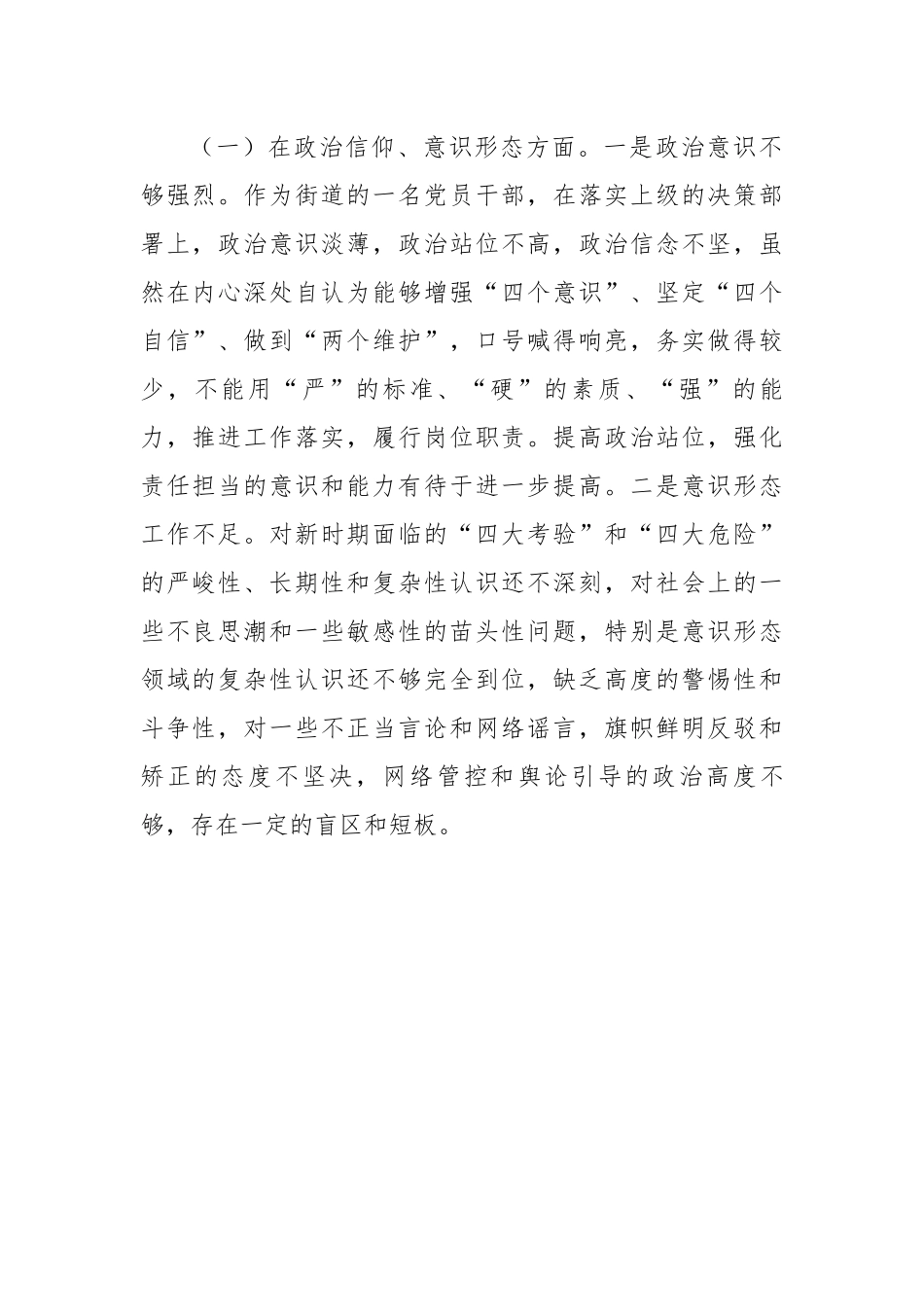某街道机关党支部党员2022年度组织生活会个人对照检查材料按照XX街道关于召开2022年度组织生活会的通知要求和总体部署,我紧扣本次组织生活会的主题,在深入学习党的二十大报告、习近平新时代中国特色社会主义思想、习近平总书记系列重要讲话精神等基础上,结合自身实际和工作情况,对照“五个方面”内容,深入查找存在问题,深刻剖析问题根源,提出了今后的努力方向和整改措施。现将本人对照检查情况汇报如下:一、2021年度组织生活会查摆问题整改情况2021年度XX街道机关支部组织生活会上,通过个人查摆和开展批评,共梳理归纳出X个方面X条问题,全面进行了整改落实。通过一年的努力,目前已经按照即知即改、立行立改的要求,全部整改完成。二、检视查找的问题和不足(一)在政治信仰、意识形态方面。一是政治意识不够强烈。作为街道的一名党员干部,在落实上级的决策部署上,政治意识淡薄,政治站位不高,政治信念不坚,虽然在内心深处自认为能够增强“四个意识”、坚定“四个自信”、做到“两个维护”,口号喊得响亮,务实做得较少,不能用“严”的标准、“硬”的素质、“强”的能力,推进工作落实,履行岗位职责。提高政治站位,强化责任担当的意识和能力有待于进一步提高。二是意识形态工作不足。对新时期面临的“四大考验”和“四大危险”的严峻性、长期性和复杂性认识还不深刻,对社会上的一些不良思潮和一些敏感性的苗头性问题,特别是意识形态领域的复杂性认识还不够完全到位,缺乏高度的警惕性和斗争性,对一些不正当言论和网络谣言,旗帜鲜明反驳和矫正的态度不坚决,网络管控和舆论引导的政治高度不够,存在一定的盲区和短板。(二)在理论学习、政治素质方面。一是学深悟透抓学习的动力不强。虽然能够利用街道集中学习和培训的机会,学习习近平新时代中国特色社会主义思想,但主动学习思考的意识不强,积极性不高,学习缺乏系统性、全面性和深入性,一定程度上存在突击学、片面学、笼统学、以干代学的现象,带着问题学、深入思考学、联系实际学、拓展延伸学做得还不够,缺乏持之以恒的精神和水滴石穿的韧劲。二是持之以恒抓学习的标准不高。习惯于把工作的重心偏向于抓具体工作,抓好理论学习缺乏常态化的学习机制,学习态度敷衍,随心所欲,往往是根据时间、精力进行安排和调整,学习寻章断句、点圈勾画、摘摘抄抄,沉浸在浮光掠影、走马观花的节奏中,导致对习近平新时代中国特色社会主义思想把握不全、理解不深、分析不准,理论素养的提升未能上升到凝心铸魂的境界。三是学用结合重实效的力度不大。政治理论学习满足于记住一些基本概念和理论观点,掌握重点内容,了解基本梗概,在内化于心、外化于行上主动作为不够,在融会贯通和举一反三上精准发力不强,导致一些新理论、新思想、新论断推动街道政务服务中心工作工作存在一定的短板和差距,致使政治站位不高,政治能力不强,加强党性修养、坚定理想信念、提高政治素质的能力有待于进一步加强。(三)在党员意识、作用发挥方面。一是党员意识欠缺。虽然能够不断增强党员意识,严格按照党章党规规范自己的言行举止,但党员意识的锤炼打磨和持续加压不够,对自己的标准和要求降低,接地气地入户调查、走访群众少了,与群众之间的沟通交流频次降低了。开展政务服务、三维数字平台办件服务、政务公开、经济发展,缺乏党员意识的融入和贯通,没有完全站在群众的立场和观点看问题、做决策和办事情,站在全局和战略的高度思考问题不够,致使工作推进思路狭窄、谋划不远,落实不力,未能达到理想的效果。二是作用发挥不够。能主动担当,积极作为,发挥党员的表率作用,但工作按部就班,方法老套,思维不活,对新政策和新问题缺少深刻的思考和分析,满足于不出错,过得去,一定程度上存在经验主义和实用主义的倾向。特别是在面对繁重的工作任务时,心里容易产生急躁情绪,奋发有为和承压奋进的动力不足,察民意、解民情、解民忧、紓民怨的意识逐渐淡化,破瓶颈、强服务、解民忧的能力有待于进一步提高。(四)在能力本领、履职尽责方面。一是为民服务的能力水平不强。在整合社会各类资源,集咨询受理、分级办理、便民服务、...