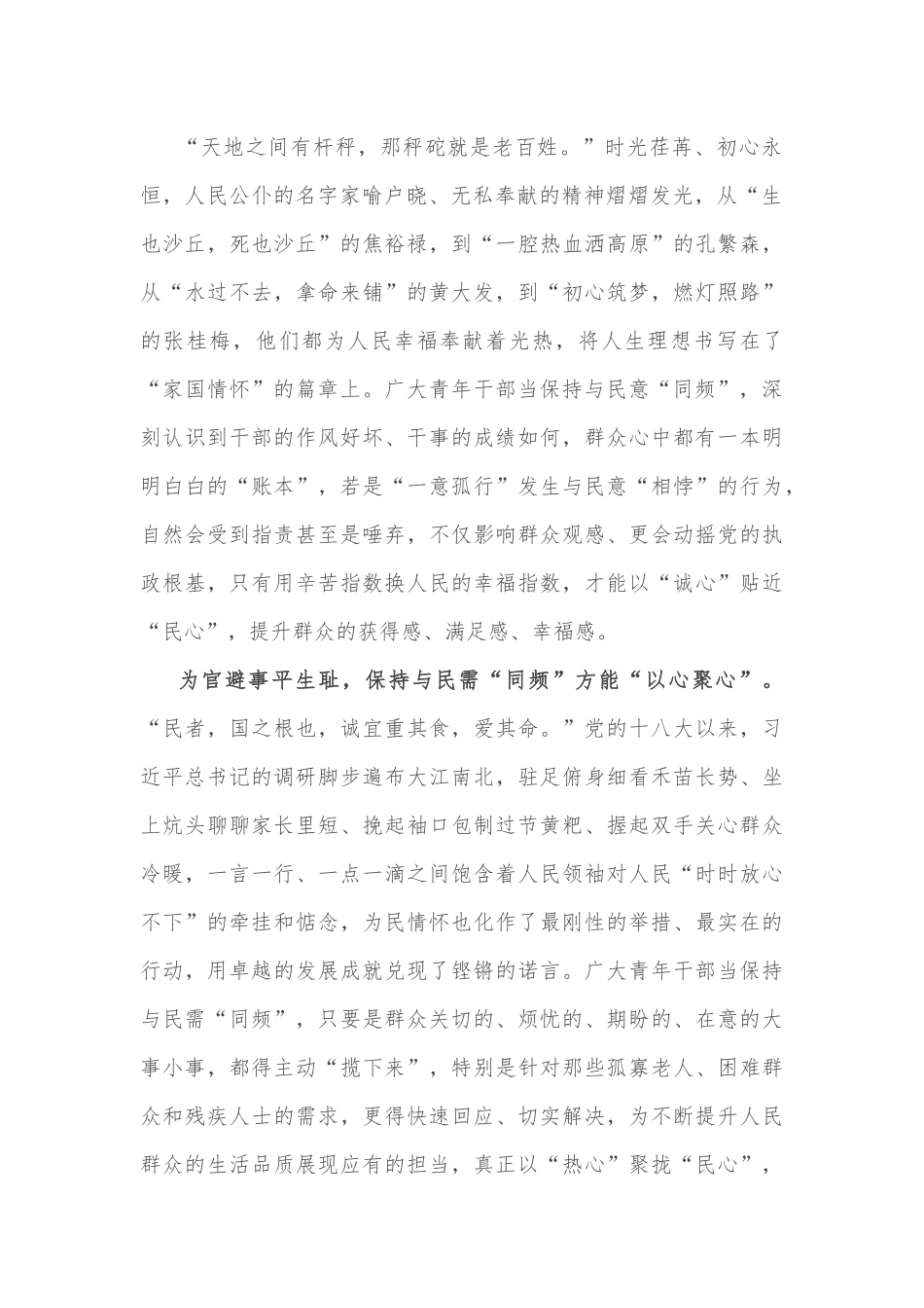 学习在省部级专题研讨班上讲话的心得体会:与民心、民意、民需“同频近日,习近平总书记在省部级主要领导干部“学习习近平总书记重要讲话精神,迎接党的二十大”专题研讨班上发表重要讲话强调,“从群众中来、到群众中去,始终保持同人民群众的血肉联系,始终接受人民批评和监督,始终同人民同呼吸、共命运、心连心。”时代是出卷人、我们是答卷人、人民是阅卷人。广大青年干部当做到与民心、民意、民需“同频”,才能以担当、实干和成绩赢得人民的“心”。一枝一叶总关情,保持与民心“同频”方能“以心暖心”。“人民对美好生活的向往,就是我们的奋斗目标。”从石库门到天安门、从兴业路到复兴路,百年风雨兼程,我们党干革命、搞建设、抓改革,所付出的一切努力、一切牺牲都是为了守住“人民的心”。锚定着“为人民谋幸福”的价值坐标,一代代共产党人舍生取义以争之、艰苦奋斗以成之,用一张张非凡的答卷赢得了群众认可和支持。习近平总书记曾用一句:“我将无我,不负人民”来表达自己的为民情怀和从政理念,真正展现了人民领袖的风范和境界。广大青年干部当保持与民心“同频”,把“人民利益”作为工作的出发点和落脚点,在风雨同舟、同甘共苦中凝聚干群深情,真正用“真心”温暖“民心”,答好最大的“政治题”。俯首甘为孺子牛,保持与民意“同频”方能“以心贴心”。“天地之间有杆秤,那秤砣就是老百姓。”时光荏苒、初心永恒,人民公仆的名字家喻户晓、无私奉献的精神熠熠发光,从“生也沙丘,死也沙丘”的焦裕禄,到“一腔热血洒高原”的孔繁森,从“水过不去,拿命来铺”的黄大发,到“初心筑梦,燃灯照路”的张桂梅,他们都为人民幸福奉献着光热,将人生理想书写在了“家国情怀”的篇章上。广大青年干部当保持与民意“同频”,深刻认识到干部的作风好坏、干事的成绩如何,群众心中都有一本明明白白的“账本”,若是“一意孤行”发生与民意“相悖”的行为,自然会受到指责甚至是唾弃,不仅影响群众观感、更会动摇党的执政根基,只有用辛苦指数换人民的幸福指数,才能以“诚心”贴近“民心”,提升群众的获得感、满足感、幸福感。为官避事平生耻,保持与民需“同频”方能“以心聚心”。“民者,国之根也,诚宜重其食,爱其命。”党的十八大以来,习近平总书记的调研脚步遍布大江南北,驻足俯身细看禾苗长势、坐上炕头聊聊家长里短、挽起袖口包制过节黄粑、握起双手关心群众冷暖,一言一行、一点一滴之间饱含着人民领袖对人民“时时放心不下”的牵挂和惦念,为民情怀也化作了最刚性的举措、最实在的行动,用卓越的发展成就兑现了铿锵的诺言。广大青年干部当保持与民需“同频”,只要是群众关切的、烦忧的、期盼的、在意的大事小事,都得主动“揽下来”,特别是针对那些孤寡老人、困难群众和残疾人士的需求,更得快速回应、切实解决,为不断提升人民群众的生活品质展现应有的担当,真正以“热心”聚拢“民心”,解决好群众的烦心事、揪心事、糟心事,汇聚成为奔赴新征程的磅礴合力。