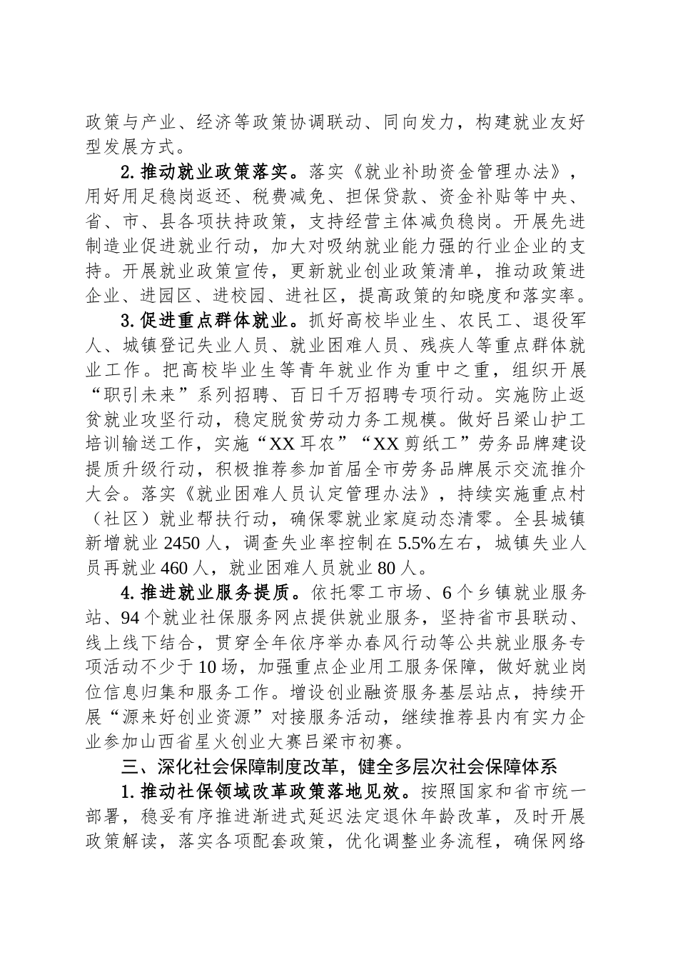 2025年XX县人力资源和社会保障工作要点2025年XX县人力资源和社会保障的总体要求:以习近平新时代中国特色社会主义思想为指导,深入学习贯彻党的二十大和二十届二中、三中全会精神,全面落实习近平总书记关于人社工作的重要讲话重要指示精神,按照市人社工作会议和县委经济工作会议精神,全面加强党的建设,坚定不移全面从严治党,全力推动高质量充分就业,构建更加完善的社会保障体系,强化现代化建设人才支撑,促进城镇居民收入增长,构建和谐劳动关系,为实现XX经济社会高质量发展贡献人社力量。一、全面加强党的建设,引领人社重点工作顺利推进强化政治机关意识,彰显人社机关的政治属性,不断提高政治判断力、政治领悟力、政治执行力,始终在思想上政治上行动上同党中央保持高度一致。认真执行“第一议题”制度,深入学习领会党的二十届三中全会精神,坚持用习近平新时代中国特色社会主义思想凝心铸魂。增强人社部门党组织政治功能和组织功能,以党建促进业务工作提质增效。以集中开展作风纪律整顿活动为抓手深化党风廉政建设,严格执行民主集中制、“三重一大”决策制度,突出用制度管人管事,锲而不舍落实中央八项规定精神,持续深化纠治“四风”,建设高效服务、担当作为的人社干部队伍,为高质量完成全年人社重点工作任务保驾护航。二、健全就业政策服务体系,全力完成就业目标任务1.强先导向。落实落细就业优先政策,深入落实《中共中央关于实施就业优先战略促进高质量充分就业的意见》以及全国人社系统高质量充分就业工作推进会提出的“三个转变、四个聚焦、四个全力”要求,进一步健全就业促进机制,强化重大政策、重大项目、重大生产力布局对就业的带动,推动就业政策与产业、经济等政策协调联动、同向发力,构建就业友好型发展方式。2.推动就业政策落实。落实《就业补助资金管理办法》,用好用足稳岗返还、税费减免、担保贷款、资金补贴等中央、省、市、县各项扶持政策,支持经营主体减负稳岗。开展先进制造业促进就业行动,加大对吸纳就业能力强的行业企业的支持。开展就业政策宣传,更新就业创业政策清单,推动政策进企业、进园区、进校园、进社区,提高政策的知晓度和落实率。3.促进重点群体就业。抓好高校毕业生、农民工、退役军人、城镇登记失业人员、就业困难人员、残疾人等重点群体就业工作。把高校毕业生等青年就业作为重中之重,组织开展“职引未来”系列招聘、百日千万招聘专项行动。实施防止返贫就业攻坚行动,稳定脱贫劳动力务工规模。做好吕梁山护工培训输送工作,实施“XX耳农”“XX剪纸工”劳务品牌建设提质升级行动,积极推荐参加首届全市劳务品牌展示交流推介大会。落实《就业困难人员认定管理办法》,持续实施重点村(社区)就业帮扶行动,确保零就业家庭动态清零。全县城镇新增就业2450人,调查失业率控制在5.5%左右,城镇失业人员再就业460人,就业困难人员就业80人。4.推进就业服务提质。依托零工市场、6个乡镇就业服务站、94个就业社保服务网点提供就业服务,坚持省市县联动、线上线下结合,贯穿全年依序举办春风行动等公共就业服务专项活动不少于10场,加强重点企业用工服务保障,做好就业岗位信息归集和服务工作。增设创业融资服务基层站点,持续开展“源来好创业资源”对接服务活动,继续推荐县内有实力企业参加山西省星火创业大赛吕梁市初赛。三、深化社会保障制度改革,健全多层次社会保障体系1.推动社保领域改革政策落地见效。按照国家和省市统一部署,稳妥有序推进渐进式延迟法定退休年龄改革,及时开展政策解读,落实各项配套政策,优化调整业务流程,确保网络畅通、数据安全、系统稳定运行和经办服务顺畅高效,保障改革平稳实施。做好机关事业单位养老保险制度改革过渡期结束后待遇衔接工作。进一步规范特殊工种提前退休审批,特殊工种提前退休坚持按月审批,严格使用全国特殊工种岗位人员信息库进行信息报送审核,严格执行原劳动部和有关行业主管部门批准公布的特殊工种名录。落实企业职工养老保险全国统筹制度,规范执行养老保险缴费和待遇政策,做好养老保险考核相关工作。发展多层次、多支柱养老保险体系。持续推进企业年金扩面,...