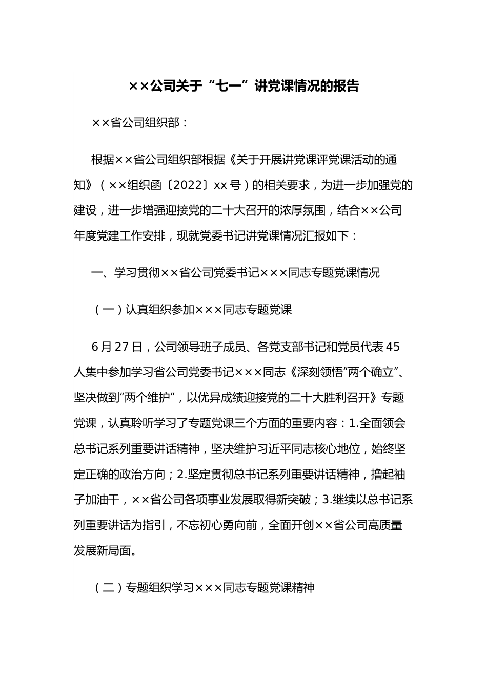 ××公司关于“七一”讲党课情况的报告××省公司组织部:根据××省公司组织部根据《关于开展讲党课评党课活动的通知》(××组织函〔2022〕xx号)的相关要求,为进一步加强党的建设,进一步增强迎接党的二十大召开的浓厚氛围,结合××公司年度党建工作安排,现就党委书记讲党课情况汇报如下:一、学习贯彻××省公司党委书记×××同志专题党课情况(一)认真组织参加×××同志专题党课6月27日,公司领导班子成员、各党支部书记和党员代表45人集中参加学习省公司党委书记×××同志《深刻领悟“两个确立”、坚决做到“两个维护”,以优异成绩迎接党的二十大胜利召开》专题党课,认真聆听学习了专题党课三个方面的重要内容:1.全面领会总书记系列重要讲话精神,坚决维护习近平同志核心地位,始终坚定正确的政治方向;2.坚定贯彻总书记系列重要讲话精神,撸起袖子加油干,××省公司各项事业发展取得新突破;3.继续以总书记系列重要讲话为指引,不忘初心勇向前,全面开创××省公司高质量发展新局面。(二)专题组织学习×××同志专题党课精神6月28日,公司党委组织部将27日××省公司党委书记×××同志主讲的“深刻领悟‘两个确立’、坚决做到‘两个维护’,以优异成绩迎接党的二十大”课件电子版下发到公司所属各党支部,要求各支部开展专题学习。公司党委书记×××同志批示,要求全体党员始终念好“干、实、严”的“三字经”,坚定不移听党话、跟党走,自觉提升政治领悟力、政治判断力、政治执行力,将奋斗精神铭刻在脑海里、落实在岗位中、体现在作风上,继续保持艰苦奋斗的精神、昂扬向上的斗志、苦干实干的作风,一张蓝图绘到底,一茬接着一茬干,不断凝聚干事创业的强大力量,为××省公司开创高质量发展新局面作出应有贡献。二、本单位讲党课的情况为进一步推进讲党课评党课活动深入开展,公司党委组织部于5月底发布《关于开展“七一”讲党课评党课活动的通知》,对开展讲党课活动的时间和内容等作出具体规定,对评选标准、评选方式等明确具体要求。要求公司各级党组织书记在“七一”前开展讲党课活动,切实把讲党课评党课作为落实“三会一课”制度、严肃党的组织生活的重要内容,作为推动推进党史学习教育常态化长效化的具体举措,作为深化岗位实践活动的有效载体,认真组织,扎实推进。(一)公司班子成员讲党课6月29日,公司党委书记×××同志带头讲《增强历史自觉,保持战略定力,有效激发高质量发展新动能》党课,公司领导班子、各党支部支部书记、党员代表共122人参加。×××同志在党课中指出:要深刻领会、准确把握中国共产党成立100周年取得的“四个伟大成就”,增强历史自觉,保持战略定力;要深刻领会、准确把握中国共产党百年奋斗的历史意义,从党的百年奋斗中汲取前进力量,始终沿着总书记指引的方向阔步前行;要深刻领会、准确把握我们为什么能够成功、未来我们怎样才能继续成功这个问题,增强“四个意识”,坚定“四个自信”,做到“两个维护”,切实用党的百年历史经验引领企业各项工作,完整、准确、全面贯彻新发展理念,主动服务和融入新发展格局,全面推进××公司高质量发展,以实际行动迎接党的二十大胜利召开。公司其他班子成员结合学习体会、结合分管工作到所在党支部讲专题党课。总经理、党委副书记××同志向市场营销党支部讲《坚持提质增效稳增长,在第二个百年奋斗目标新的赶考路上创造新的业绩》专题党课,党委副书记、纪委书记向党建纪检党支部讲《常抓不懈,久久为功,纵深推进全面从严治党》专题党课,其他班子成员精心准备、统筹安排,均在6月30日前完成了讲党课工作。(二)基层党支部书记讲党课按照要求,公司所属17个党支部在各支部全体党员中全面开展党支部书记讲党课活动。党课内容围绕本支部在开展党史学习教育、岗位实践活动以及党建引领生产经营中形成的特色经验做法、涌现出的先进事迹、形成的优秀案例。紧密结合实际工作,联系党员思想、工作、生活和作风实际,联系身边人、具体事。公司各支部认真落实讲党课,涌现出一批先进榜样。机关党支部书记×××同志以《传承红色基因,感应时代脉搏,在踔厉奋发、勇毅前进中争做...