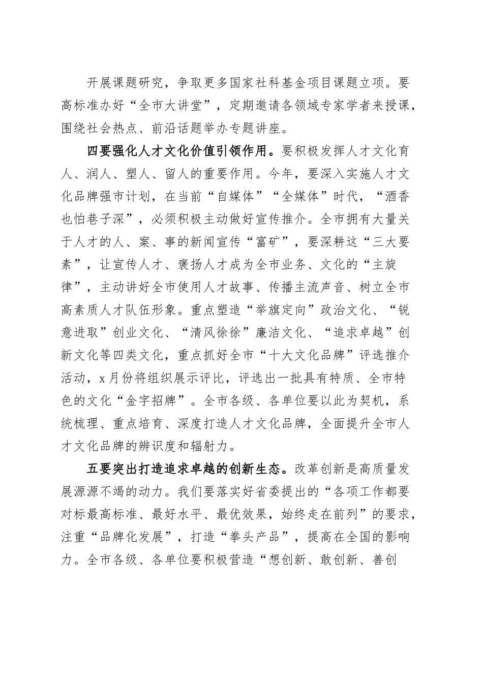 全市人才队伍建设工作部署会议讲话范文同志们:党的二十大强调,人才是第一资源,对实施人才强国战略从更高起点、更高层次、更高目标作出系统部署,凸显了人才的基础性、战略性地位。新征程上,要树牢“人才为本”意识,“全流程”打造人才高地高峰,为服务保障全市工作现代化建设,实现高质量发展提供人才支撑。一要构建“一体两翼”人才工作格局。“一体两翼”就是,以打造高素质人才队伍为主体,以培养“专家型”领军人才和“实务型”业务人才为两翼,配套实施领军人才“高峰计划”和业务人才“高地计划”。市委已经提出了“到2025年,全市各条线要培育并保持国家级、市级领军人才x名,业务人才x名”的具体指标。全市各级党组要坚持“一把手”带头抓“第一资源”,理顺人才选拔、评价、激励、保障、辐射全流程工作机制,补足人才工作短板弱项。去年,我们围绕领军人才建设,制定了“两个配套实施方案”(领军人才培养方案、专家(骨干)评选方案),开展了业务专家、骨干评选,初步构建形成了“金字塔型”专家型人才梯队。今年,主要聚焦“实务型”业务人才培养,制定全市业务标兵、能手管理办法及评选方案,高规格评选全市业务标兵、业务能手,建立各类业务人才库,为全市各条线各领域工作提供专业化人才支撑。二要推进强基增能“护根培土”。教育培训是“根”,人才培养是“果”,教育培训的目的是提升素能、培养人才。没有教育培训,人才培养就成了无源之水。全市各级、各单位要把教育培训与人才培养紧密结合起来,一方面,要突出实战实用实效开展岗位练兵,紧贴各类人员岗位需求,组织开展新一轮实务培训,灵活推行案例教学、现场教学、网络教学等培训模式,加大专业化业务培训力度。另一方面,要发挥领军人才、业务标兵的辐射效应,强化人才的“领头羊”作用,鼓励各层次人才带头办理新类型案件、疑难复杂案件,通过撰写工作指南、承担和参与重大课题研究等途径,聚焦工作中的重点、热点、难点问题,提供高质量的专业指导意见。同时,要通过打造领军人才工作室、攻坚团队,探索对业务标兵实施导师制、带教制等,推动各类人才带教培养全面落实落地。三要全面深化院校合作。科研教育与工作实践密不可分。我们全市有x多所高校科研院所,有着丰富的教育资源和人才资源,要充分借力高校资源推动队伍建设,实现合作共赢。要主动和高校科研院所对接,承担起人才培养的共同主体责任,创新人才共育机制。经过前期紧锣密鼓的联系对接,全市将与x所高校和科研机构建立战略合作关系,并举办“院校合作启动会暨院校合作共育高素质人才队伍座谈会”。根据与各大院校的《战略合作协议》,重点推进x个重点专业学生到全市x个单位顶岗实习,深化理论研究、互聘互派、教育培训、实践教学等四大领域十个项目合作。推动全市人才与外界专家合作开展课题研究,争取更多国家社科基金项目课题立项。要高标准办好“全市大讲堂”,定期邀请各领域专家学者来授课,围绕社会热点、前沿话题举办专题讲座。四要强化人才文化价值引领作用。要积极发挥人才文化育人、润人、塑人、留人的重要作用。今年,要深入实施人才文化品牌强市计划,在当前“自媒体”“全媒体”时代,“酒香也怕巷子深”,必须积极主动做好宣传推介。全市拥有大量关于人才的人、案、事的新闻宣传“富矿”,要深耕这“三大要素”,让宣传人才、褒扬人才成为全市业务、文化的“主旋律”,主动讲好全市使用人才故事、传播主流声音、树立全市高素质人才队伍形象。重点塑造“举旗定向”政治文化、“锐意进取”创业文化、“清风徐徐”廉洁文化、“追求卓越”创新文化等四类文化,重点抓好全市“十大文化品牌”评选推介活动,x月份将组织展示评比,评选出一批具有特质、全市特色的文化“金字招牌”。全市各级、各单位要以此为契机,系统梳理、重点培育、深度打造人才文化品牌,全面提升全市人才文化品牌的辨识度和辐射力。五要突出打造追求卓越的创新生态。改革创新是高质量发展源源不竭的动力。我们要落实好省委提出的“各项工作都要对标最高标准、最好水平、最优效果,始终走在前列”的要求,注重“品牌化发展”,打造“拳头产品”,提高在全...
