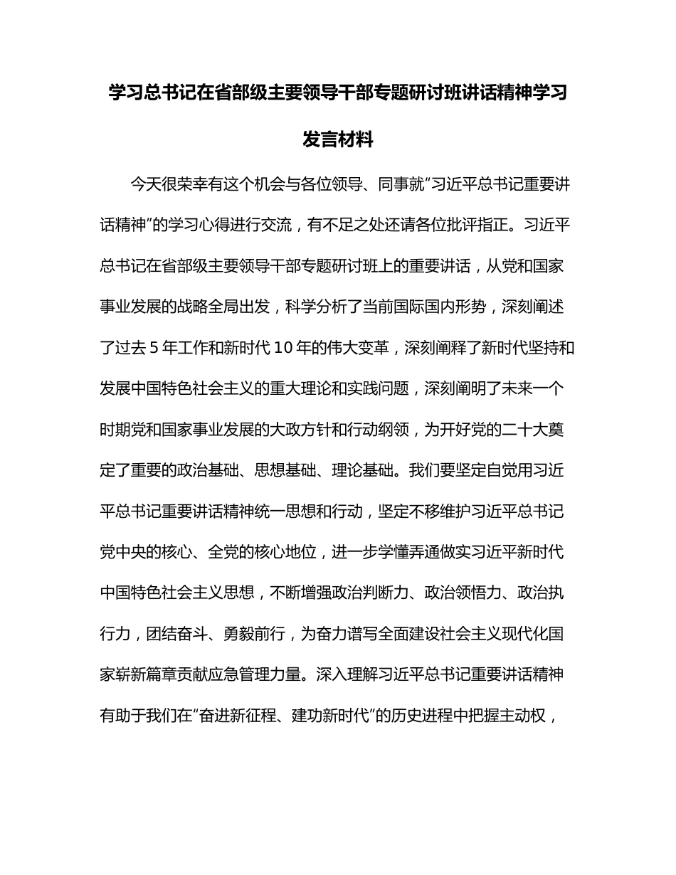 学习习近平总书记在省部级主要领导干部专题研讨班讲话精神学习发言材料.docx_第1页