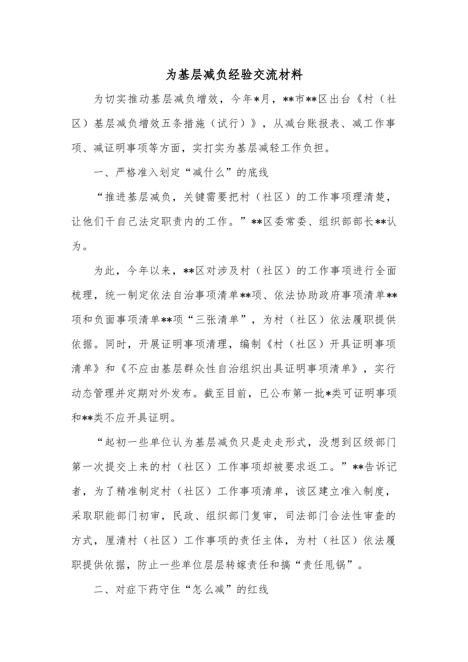 为基层减负经验交流材料为切实推动基层减负增效,今年*月,**市**区出台《村(社区)基层减负增效五条措施(试行)》,从减台账报表、减工作事项、减证明事项等方面,实打实为基层减轻工作负担。一、严格准入划定“减什么”的底线“推进基层减负,关键需要把村(社区)的工作事项理清楚,让他们干自己法定职责内的工作。”**区委常委、组织部部长**认为。为此,今年以来,**区对涉及村(社区)的工作事项进行全面梳理,统一制定依法自治事项清单**项、依法协助政府事项清单**项和负面事项清单**项“三张清单”,为村(社区)依法履职提供依据。同时,开展证明事项清理,编制《村(社区)开具证明事项清单》和《不应由基层群众性自治组织出具证明事项清单》,实行动态管理并定期对外发布。截至目前,已公布第一批*类可证明事项和**类不应开具证明。“起初一些单位认为基层减负只是走走形式,没想到区级部门第一次提交上来的村(社区)工作事项却被要求返工。”**告诉记者,为了精准制定村(社区)工作事项清单,该区建立准入制度,采取职能部门初审,民政、组织部门复审,司法部门合法性审查的方式,厘清村(社区)工作事项的责任主体,为村(社区)依法履职提供依据,防止一些单位层层转嫁责任和搞“责任甩锅”。二、对症下药守住“怎么减”的红线村(社区)的工作职责理清楚了,如何做到让基层干自己该干的工作?**区把严控报表台账填报作为基层减负的首要任务,按照“一个口子管报表”,明确由区城乡基层治理促进中心统筹把关区级部门台账、报表下发工作。全面落实“一表三审”制度,对拟下发的台账报表进行严格审核,动真碰硬解决基层反复、多头报表等各类形式主义问题,今年*月以来,全区仅下发报表台账*张。同时,该区“比选”*个有代表性的村(社区)作为“哨点”单位,通过“哨点”单位每月收集分析“填报表格台账”“开具证明事项”等具体情况,准确掌握基层减负落实情况。对基层反映强烈的台账报表、工作事项等,该区还定期召开组织、司法、民政、当事方单位以及村(社区)的“五方会议”,以“三张清单”为依据,从合法性、合规性开展评审,厘清事权关系,进一步整顿基层过多承担行政事务的问题。“现在区上开展基层减负,再也不能像以往那样随意下发表格给基层增加负担了。”**区人社局副局长**告诉记者,为切实做到基层减负,区人社局对管理服务对象进行了认真梳理,逐一建立了业务数据库并做到定期更新,“这样不仅提高了自身工作效率,也避免了以往反复要求基层填报数据问题的发生。”三、轻松上阵拉升“减出效”的高线今年以来,**区**个村(社区)把发展集体经济、改善基础设施、保障民生作为工作的重点。据初步测算,今年全区**个村中,集体经济年收入**万元的将达到**个以上。“通过基层减负,村(社区)的工作负担得到了减轻,但原来由村(社区)承担的工作却没有因为减负而被减掉。”**区委组织部副部长***告诉记者,一方面,该区积极引导区级部门践行“一线工作法”,通过定期深入基层了解情况,为开展工作收集一手信息,使出台的相关政策更加接地气;另一方面,健全政府购买服务制度,制定《**区乡镇政府向社会力量购买服务实施方案》,仅今年区财政就拿出***万元资金,将职业农民培育、特殊人群关爱等*大类**项民生服务纳入政府购买范畴,通过购买社会服务,让社会组织参与政府管理,转变政府职能。