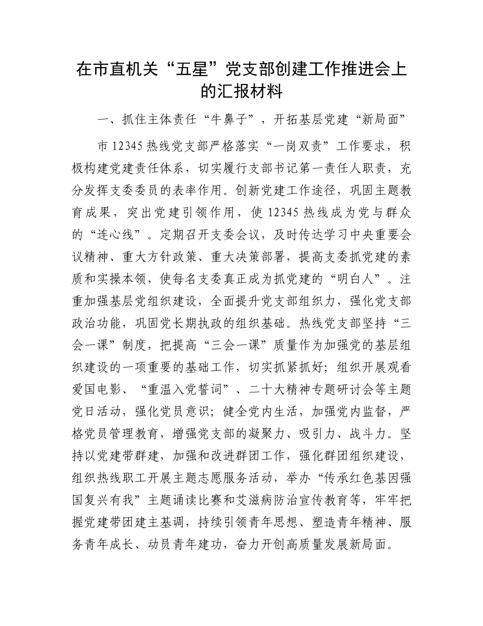 在市直机关“五星”党支部创建工作推进会上的汇报材料一、抓住主体责任“牛鼻子”,开拓基层党建“新局面”市12345热线党支部严格落实“一岗双责”工作要求,积极构建党建责任体系,切实履行支部书记第一责任人职责,充分发挥支委委员的表率作用。创新党建工作途径,巩固主题教育成果,突出党建引领作用,使12345热线成为党与群众的“连心线”。定期召开支委会议,及时传达学习中央重要会议精神、重大方针政策、重大决策部署,提高支委抓党建的素质和实操本领,使每名支委真正成为抓党建的“明白人”。注重加强基层党组织建设,全面提升党支部组织力,强化党支部政治功能,巩固党长期执政的组织基础。热线党支部坚持“三会一课”制度,把提高“三会一课”质量作为加强党的基层组织建设的一项重要的基础工作,切实抓紧抓好;组织开展观看爱国电影、“重温入党誓词”、二十大精神专题研讨会等主题党日活动,强化党员意识;健全党内生活,加强党内监督,严格党员管理教育,增强党支部的凝聚力、吸引力、战斗力。坚持以党建带群建,加强和改进群团工作,强化群团组织建设,组织热线职工开展主题志愿服务活动,举办“传承红色基因强国复兴有我”主题诵读比赛和艾滋病防治宣传教育等,牢牢把握党建带团建主基调,持续引领青年思想、塑造青年精神、服务青年成长、动员青年建功,奋力开创高质量发展新局面。二、打好廉政建设“组合拳”,打造作风建设“新高地”支部书记带头签订党风廉政建设责任书,层层落实党风廉政建设责任,把管党治党和业务工作同部署、同落实;开展廉政风险排查,规范从政行为,完善防控措施,跟进风险防控,逐步压实责任,营造人按原则干、事按制度办的廉政氛围,确保业务工作落地落实见成效;开展集中学习、观看警示教育片,引导党员知敬畏、存戒惧、守底线,将纪律教育、法治教育、警示教育做深做透。加强理想信念教育,开设“12345热线党建活动室”,宣传党建知识,将思想政治建设融入到意识形态领域。深入开展能力作风建设年活动,切实解决“中梗阻”问题,在****年市直单位重点科室(关键岗位)能力作风建设民主评议中排名第一。三、坚持为民服务“总路线”,注入党建引领“新动力”12345热线日常工作就是多渠道受理群众诉求,通过直办、转办、督办的方式,解决好群众的急难愁办问题,让每一个诉求都能做到“件件有回音事事有落实”。特别是疫情防控期间,“12345”作为老百姓不出门联系政府的主渠道,疫情防控期间日均受理疫情防控类工单****余件,发挥了特殊时期群众的“定心丸”和社会的“稳持续推进“党建+12345+网格化”基层社会治理试点工作,热线以全市基层办事处网格化管理为切入点,充分利用办事处辖区内社区网格、小区网格、党员先锋岗,将党员群众“网”进党组织管理,构建“四级网络”体系,充分发挥网格员一线督导的作用,主动发现问题,主动解决问题,把问题解决在基层,让群众足不出户就能提出诉求、解决问题,提高办事单位效能,加快社会治理实现实时化、数字化、迅捷化,全面打通联系服务群众的“最后一米”。热线党支部以强烈的政治担当、严明的纪律规矩、管用的机制措施,努力将热线党支部建设成为党领导的坚强战斗堡垒。为此,热线党支部先后被授予“**省先进基层党组织”、“**市先进基层党组织”等荣誉称号。今后,市12345热线党支部将深入学习贯彻习近平新时代中国特色社会主义思想和党的二十大精神,持续推动党建与业务深度融合,切实深化“五星”支部创建成果,为服务**经济发展大局、谱写新时代中原绚丽篇章贡献热线力量。