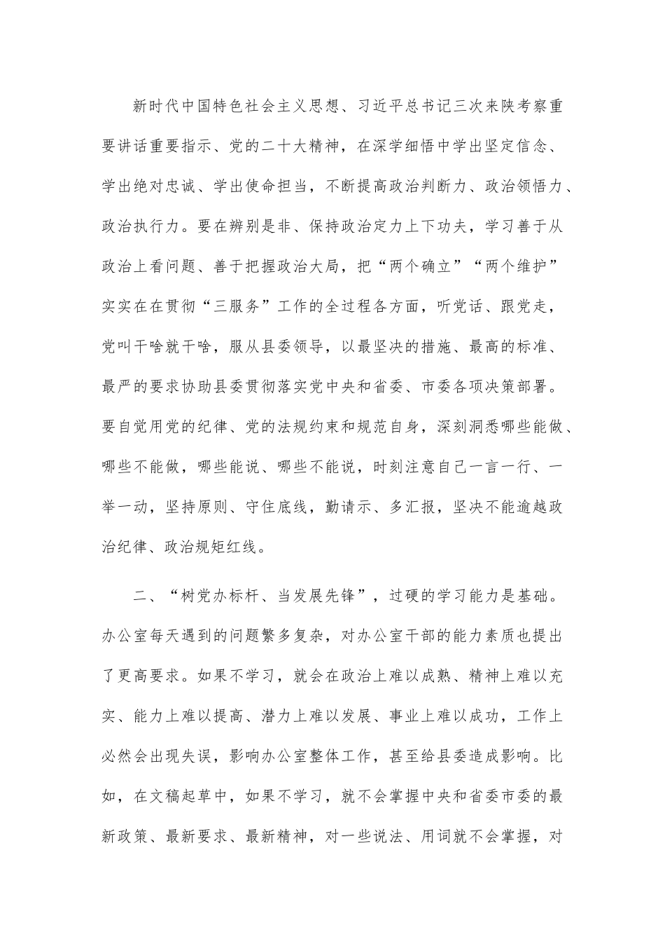 县委书记在县委办公室党支部2022年专题组织生活会上的讲话同志们:今天,非常高兴来参加办公室党支部专题组织生活会。一年来,和办公室干部接触最多。大家每天为了办文办会、保障县委高效运转,兢兢业业,付出了大量的辛勤劳动。大家的工作成绩有目共睹、值得肯定,我看在眼里、记在心上。同志们的工作效率、工作作风在全县起到了带头作用,在县委办公室班子的带领下,出色地完成了县委交办的各项任务。实践证明,县委办公室的干部素质好、觉悟高、能力强,是一支值得信赖、能征善战、能打硬仗的队伍。刚才,同志代表支部委员会作了对照检查,班子成员也逐一作了对照检查,大家站在相互帮助、相互提醒、相互提高的角度,开展了批评和自我批评,自我批评见事见心,相互批评客观中肯,问题讲的都很实在,达到了凝聚共识、增进团结、共同提高的目标。一会儿,王**还要讲话,大家要认真学习,深刻领会。首先,我围绕“树党办标杆、当发展先锋”,谈5点意见,与大家交流。一、“树党办标杆、当发展先锋”,过硬的政治能力是前提。党办姓党,旗帜鲜明讲政治是党办干部的第一要求,必须在党爱党、在党言党、在党为党。作为办公室干部,一定要时刻把政治能力摆在第一位,在埋头于日常工作的同时,把政治理论学习作为内在要求和自觉行动,全面系统、及时跟进、笃信笃行学习习近平新时代中国特色社会主义思想、习近平总书记三次来陕考察重要讲话重要指示、党的二十大精神,在深学细悟中学出坚定信念、学出绝对忠诚、学出使命担当,不断提高政治判断力、政治领悟力、政治执行力。要在辨别是非、保持政治定力上下功夫,学习善于从政治上看问题、善于把握政治大局,把“两个确立”“两个维护”实实在在贯彻“三服务”工作的全过程各方面,听党话、跟党走,党叫干啥就干啥,服从县委领导,以最坚决的措施、最高的标准、最严的要求协助县委贯彻落实党中央和省委、市委各项决策部署。要自觉用党的纪律、党的法规约束和规范自身,深刻洞悉哪些能做、哪些不能做,哪些能说、哪些不能说,时刻注意自己一言一行、一举一动,坚持原则、守住底线,勤请示、多汇报,坚决不能逾越政治纪律、政治规矩红线。二、“树党办标杆、当发展先锋”,过硬的学习能力是基础。办公室每天遇到的问题繁多复杂,对办公室干部的能力素质也提出了更高要求。如果不学习,就会在政治上难以成熟、精神上难以充实、能力上难以提高、潜力上难以发展、事业上难以成功,工作上必然会出现失误,影响办公室整体工作,甚至给县委造成影响。比如,在文稿起草中,如果不学习,就不会掌握中央和省委市委的最新政策、最新要求、最新精神,对一些说法、用词就不会掌握,对文稿中的错误说法就不能及时修改。作为办公室干部,面对新时代、新形势、新任务、新要求,要坚持终身学习、科学学习、超前学习、实践学习,把学习作为解决工作遇到问题的首要方法,在干中学、学中干,学习业务、钻研业务、精通业务,明确上级要求,明确政策规定,明确工作路径,解决业务学习不够、业务不清、程序不熟悉等问题,不断掌握新的工作方法,增强业务本领,做问题的解决者、工作的推进者。三、“树党办标杆、当发展先锋”,过硬的协调能力是关键。办公室居于承上启下、协调左右的中枢位置,接触面广、接触人多,协调沟通是各项工作开展的基础,县委政策的落实和实施、工作效率的提高、工作情况的顺利进行都离不开较好的协调能力。作为办公室干部,必须具备沟通、交流、协调的能力,能够准确把握领导意图,抓住重点,分清轻重缓急,把需要协调的事弄清楚、搞明白,对基层、对部门多理解、多沟通、多商议,不能机械地交代任务,从而把事情“传偏”,做到把县委的决策沟通下去,把基层的情况协调上来。要善于合各部门之力、借群众之智、汇集多方力量,协调和处理好各部门之间的关系,多做“穿针引线”的动作,多搞“铺路架桥”的服务,把全县各级各部门团结起来、凝聚起来,形成协同配合、同频共振、共谋发展的局面。四、“树党办标杆、当发展先锋”,过硬的担当能力是根本。办公室突发情况、突发事件多,很多工作无法事先预知,比如在开会时有群众上访,比如领导...