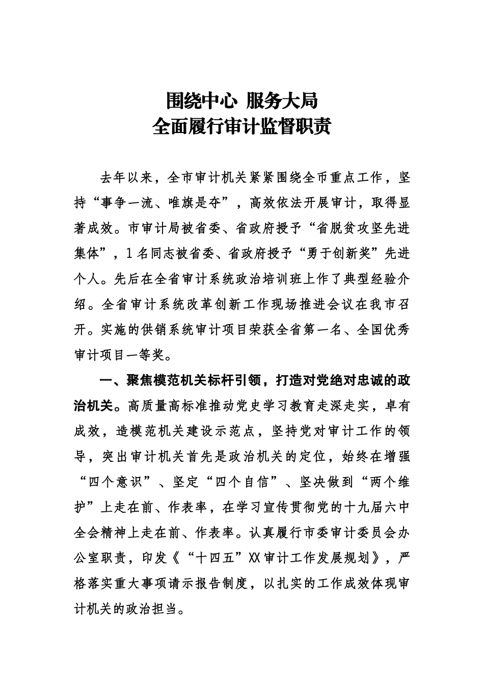 围绕中心服务大局全面履行审计监督职责去年以来,全市审计机关紧紧围绕全币重点工作,坚持“事争一流、唯旗是夺”,高效依法开展审计,取得显著成效。市审计局被省委、省政府授予“省脱贫攻坚先进集体”,1名同志被省委、省政府授予“勇于创新奖”先进个人。先后在全省审计系统政治培训班上作了典型经验介绍。全省审计系统改革创新工作现场推进会议在我市召开。实施的供销系统审计项目荣获全省第一名、全国优秀审计项目一等奖。一、聚焦模范机关标杆引领,打造对党绝对忠诚的政治机关。高质量高标准推动党史学习教育走深走实,卓有成效,造模范机关建设示范点,坚持党对审计工作的领导,突出审计机关首先是政治机关的定位,始终在增强“四个意识”、坚定“四个自信”、坚决做到“两个维护”上走在前、作表率,在学习宣传贯彻党的十九届六中全会精神上走在前、作表率。认真履行市委审计委员会办公室职责,印发《“十四五”XX审计工作发展规划》,严格落实重大事项请示报告制度,以扎实的工作成效体现审计机关的政治担当。二、聚焦服务全市中心大局,充分发挥审计“经济体检”作用。聚焦重大政策措施贯彻落实,当好政策落实的“督察员”。组织开展我市促进就业、减税降费、耕地保护和土地利用情况等XX项重大政策措施落实情况跟踪审计,找准阻碍政策落实的堵点、难点与痛点,及时提出审计建议,推动政策措施向治理效能转化。聚焦规范领导干部权力运行,当好权力运行的“监督者”。出台《XX市管党政主要领导干部和国有企事业单位主要领导人员任期经济责任以及自然资源资产管理和生态环境保护责任告知暂行办法》《XX市市本级经济责任审计对象分类管理暂行办法》等文件,突出任中审计,开展XX名领导干部经济责任和自然资源资产离任审计。聚焦提高财政资金绩效,当好财政资金的“守护者”。贯彻落实“过紧日子”要求,聚焦地方政府债务、财政收人质量等薄弱环节,采取“上审下”“提级审”“大兵团作战”“七统一”审计模式,对市本级、X个功能区及XX个市直部门单位2020年度预算执行和其他财政收支情况进行了审计。提报的《XX市审计局关于20XX年度预算绩效管理审计操作指引》被省审计厅《审计业务动态》第XX期全文刊登,相关经验做法在全省审计系统进行推广。聚焦全市重点建设项目,当好投资项目的“护航者”。加大对项目审批、征地拆迁、工程招投标等方面的审计力度,推进投资审计“全覆盖”。联合市发展改革委、市财政局等部门单位组成督查组,对市本级XX个政府投资项目招投标进度、中标企业税收缴纳及劳务用工等情况进行了专项检查。对XX机场迁建、XX市公共卫生“五大中心”、绕城高架路等XX个政府投资项目进行审计。聚焦补齐民生短板,当好群众利益的“捍卫者”。扎实开展我市就业优先、养老保险和医疗保险、乡村振兴等重点民生资金和项目审计,更加关注民生政策的普惠性、基础性和兜底性。对全市医疗卫生行业综合监管工作进行实地督查,促进全市各相关单位建立严格规范的医疗卫生行业综合监管制度,提高医疗卫生行业综合监管水平。聚焦推动深化改革,当好国有企业改革的“服务者”。对城投控股集团、公交集团等7户国有企业进行资产负债损益审计,对X户国资国企重点改革事项推进情况进行专项审计调查,推进国有企业审计监督“全覆盖”。三、聚焦解放思想改革创新,强力提升审计监督质量和效能。注重改革创新引领。深人开展寻标对标达标创标活动,组织市县审计干部职工到徐州、湖州等地考察学习,对照全国先进找差距,组织开展审计质量提升、“两提升一突破”活动。积极践行科技强审理念。深人践行向信息化要资源、向大数据要效率理念,完成全省金审三期试点工作,加大全市智慧审计建设,举办全市审计系统大数据审计培训班,开展大数据审计实战比武竞赛,提高核查问题、评价判断、宏观分析能力。当好审计“治已病、防未病”的“担当者”。创新实施“执行科+审计组”双督促整改工作模式,用好整改督察、整改约谈、整改问责、整改报告、整改情况公告“五项制度”,召开全市审计查出问题整改工作会议,做到揭示问题、规范管理、促进改革一体推进。市审计局受市政府委托,向市第十七届人大...
