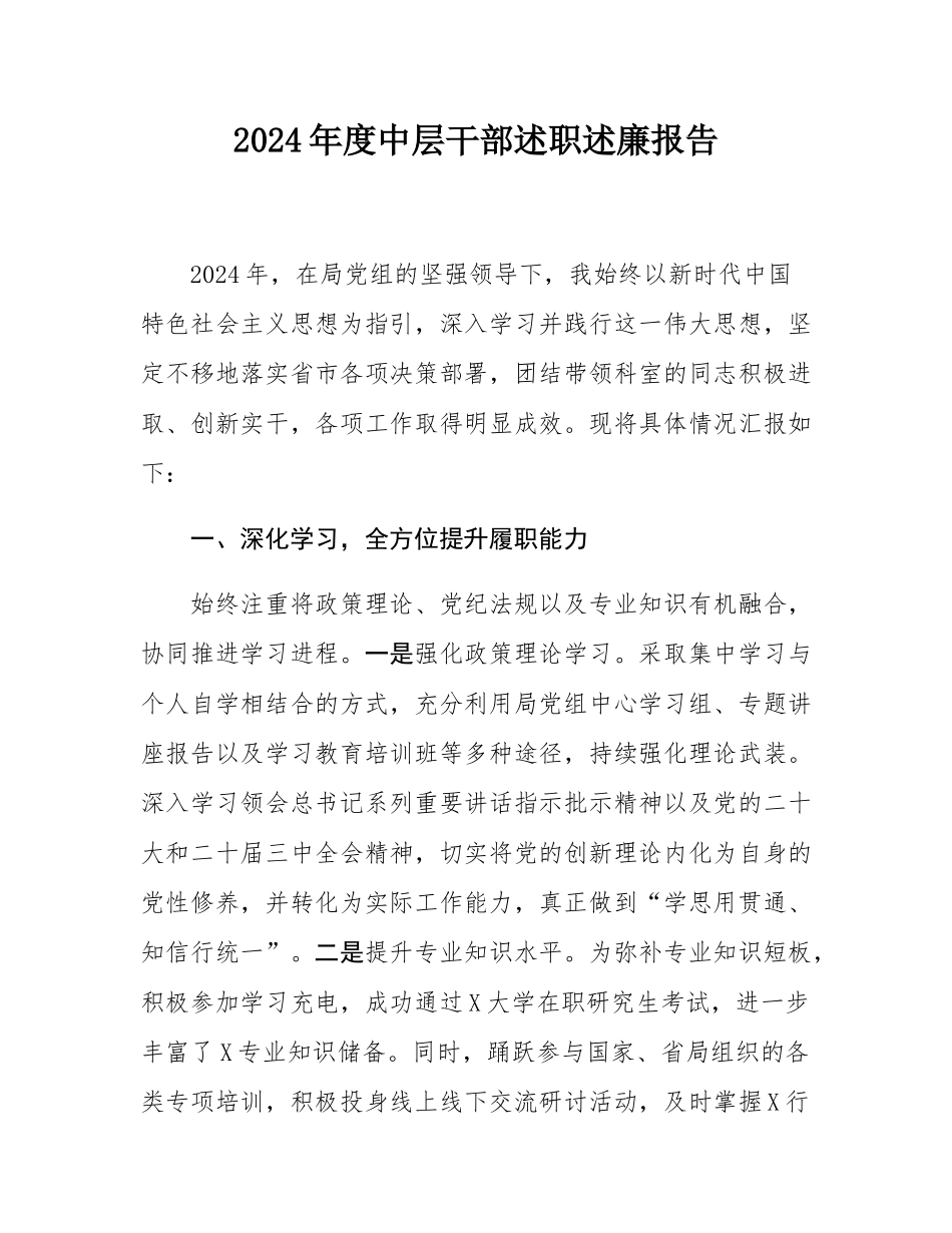 2024年度中层干部述职述廉报告2024年,在局党组的坚强领导下,我始终以新时代中国特色社会主义思想为指引,深入学习并践行这一伟大思想,坚定不移地落实省市各项决策部署,团结带领科室的同志积极进取、创新实干,各项工作取得明显成效。现将具体情况汇报如下:一、深化学习,全方位提升履职能力始终注重将政策理论、党纪法规以及专业知识有机融合,协同推进学习进程。一是强化政策理论学习。采取集中学习与个人自学相结合的方式,充分利用局党组中心学习组、专题讲座报告以及学习教育培训班等多种途径,持续强化理论武装。深入学习领会总书记系列重要讲话指示批示精神以及党的二十大和二十届三中全会精神,切实将党的创新理论内化为自身的党性修养,并转化为实际工作能力,真正做到“学思用贯通、知信行统一”。二是提升专业知识水平。为弥补专业知识短板,积极参加学习充电,成功通过X大学在职研究生考试,进一步丰富了X专业知识储备。同时,踊跃参与国家、省局组织的各类专项培训,积极投身线上线下交流研讨活动,及时掌握X行业最新知识动态,全面提升了“会干事”的业务能力和“干好事”的综合素质。三是注重基层实践学习。秉持在干中学、学中干的理念,熟练运用调查研究“深、实、细、准、效”五字诀深入基层一线。始终坚持问题导向,善于敏锐发现问题,科学严谨分析问题,在“务实、扎实、落实”上下功夫。通过不断适应工作和形势发展的需求,将理论学习成果充分转化为分析和解决实际问题的能力,在工作谋划思路、推进措施以及服务群众成效等方面展现出过硬的履职能力。二、加压奋进,多维度提升履职实效在总结前两年工作经验的基础上,结合今年工作实际,进一步自我加压,全力推动分管各项工作迈向新台阶、实现新突破。一是优化机关内务管理。规范文稿服务:将文稿服务视为机关工作的核心环节,全年累计接收处理各类公文X份,上报政务信息X余条,精心起草汇报、总结等各类文稿X余篇,通过严谨细致的工作,基本实现了零差错目标,确保了文稿服务的高质量。二是加大宣传力度。积极组织机关各科室在X日报、电视台等多个平台开展宣传报道工作,全年宣传报道X次,有力地展示了X工作动态,圆满完成了省局考核指标,进一步提升了工作的影响力和知晓度。三是高效完成任务:高质量完成建议提案年度任务X个,妥善处理各类有效信访件X件,经测评,群众满意度达到xxx%,切实做到了让群众满意、让组织放心。四是强化后勤服务保障:深入推进车辆食堂、后勤保障等内勤工作的规范化管理,常态化开展食堂食材采购安全和生产安全检查工作,全年未发生一起因食材和卫生问题引发的安全事件,为机关工作的顺利开展提供了坚实的后勤保障。五是全面推进各项工作:在乡村振兴、平安建设、信访工作、保密档案等方面均取得了显著进步,各项工作协同发展,共同为单位整体工作的提升做出了积极贡献。三、严以律己,深层次加强自身建设积极投身党纪学习教育活动,对照党纪法规的各项要求,认真开展自查自纠,并进行全面整改,切实加强自身建设。一是坚定政治立场。始终将旗帜鲜明讲政治贯穿于履职尽责的全过程,时刻提醒自己在细微之处保持清醒的政治头脑,不断增强“四个意识”、坚定“四个自信”、做到“两个维护”,坚决抵制“四风”,切实做政治上的“明白人”“老实人”。积极参加党纪学习教育活动,严格遵守各项党纪党规、中央八项规定、省委“九项规定”以及市委“九条规定”,持续提升自身的政治素养和廉洁意识。二是树立良好形象。秉持“欲影正者端其表,欲下廉者先之身”的理念,做到上不索、下不取,功不揽、过不推,踏实做事、正直为人。始终坚守清正廉洁的政治本色,锤炼忠诚干净担当的政治品格,忠于职守、真抓实干、勇于开拓。严格管好工作圈、生活圈、社交圈、朋友圈,筑牢拒腐防变的思想道德防线,强化共产党员的浩然正气,自觉树立良好家风,坚决不踩“红线”、不越“底线”,切实成为为民务实清廉的表率。三是坚持为民服务。深知“脚上沾有多少泥土,心中就有多少深情”的道理,深刻认识到坐在办公室只能看到问题,而深入基层才能找到解决问题的办法。一年来,结合包片蹲点、“三抓三...