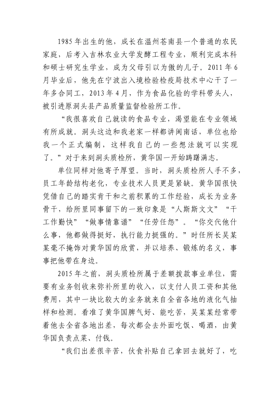 年轻干部违纪违法典型案例汇编(4篇)年轻干部违纪违法典型案例从随波逐流到放任自我——四川省广安鑫鸿文化旅游投资开发有限公司原总经理宋小林违纪违法案剖析“以前我很喜欢听音乐,但是到这里后,却再也不敢听了,害怕勾起过往的回忆。人失去自由以后,家人、孩子一刻都不敢想,一想起来,心里会特别疼,老婆寄过来的信和照片我都不敢看第二遍……”铁窗内,浙江省温州市洞头区产品质量监督检验所原副所长、区食品药品检验检测中心原副主任黄华国懊悔不已。三年前的4月27日,他被洞头区监委带走调查,后因贪污公款锒铛入狱,徒留给同事、亲朋一片震惊与错愕。时至今日,很多人仍想不明白:看起来这么老实、优秀的一个年轻人,怎么会干出违法犯罪的事?“领导说可以,那就可以吧”——无原则顺从让底线在一次次公款吃喝中模糊黄华国是带着光环来到洞头的。1985年出生的他,成长在温州苍南县一个普通的农民家庭,后考入吉林农业大学发酵工程专业,顺利完成本科和硕士研究生学业,成为父母引以为傲的儿子。2011年6月毕业后,他先在宁波出入境检验检疫局技术中心干了一年多合同工,2013年4月,作为食品化验的学科带头人,被引进原洞头县产品质量监督检验所工作。“我很喜欢自己就读的食品专业,渴望能在专业领域有所成就。洞头这边和我老家一样都讲闽南话,单位也给我一个正式编制,这样我自己的一些想法就可以实现了。”对于来到洞头质检所,黄华国一开始踌躇满志。单位同样对他寄予厚望。当时,洞头质检所人手不多,员工年龄结构老化,专业技术人员更是紧缺。黄华国很快凭借自己的踏实肯干和之前积累的工作经验,成长为业务骨干,给所里同事留下的一致印象是“人斯斯文文”“干工作勤快”“做事情靠谱”“任劳任怨”。“你交代他什么事,他都做得挺好,执行能力挺强的。”时任所长吴某某毫不掩饰对黄华国的欣赏,并以培养、锻炼的名义,事事把他带在身边。2015年之前,洞头质检所属于差额拨款事业单位,需要有业务创收来弥补所里的收入,以支付人员工资和其他费用,其中一块比较大的业务就来自全省各地的液化气抽样和检测。看准了黄华国脾气好、能吃苦,吴某某经常带着他去全省各地出差,每次都会去外面吃饭、喝酒,由黄华国负责点菜、付钱。“我们出差很辛苦,伙食补贴自己拿回去就好了,吃饭喝酒的钱就自己虚造点再报呗。”第一次出差回来,当黄华国请示自己垫付的餐费应该怎么报账时,吴某某轻描淡写的一句话,在他当时还是白纸一样的内心里渲染了一笔变相公款吃喝的浓墨重彩。“我是第一次知道,这事还能这么干。”黄华国的口气里充满不可置信。尽管心里并不认可,但犹豫再三后,拒绝的话终究没有说出口,“既然领导说可以,那就可以吧。”有一就有二。虚增出差人员或虚造出差次数,填好差旅报销单,按正常报销程序“一路绿灯”;或者以采购化学药品名义,找有业务联系的化学试剂公司虚开发票,由该公司收到单位财务货款后再转账到自己的支付宝上,这样的操作屡试不爽。黄华国把自己经手的费用情况都一一记录在一本工作笔记本上,报销一笔勾掉一笔。渐渐地,他对这样的违纪行为习以为常,底线意识逐渐模糊。办案人员后来查明,2014年至2017年上半年,黄华国在“前辈”的“指引”下,多次通过虚增出差次数,虚开虚报发票等方式套取单位资金,用于冲抵吃喝费用及接待费超支部分,共计7300余元。“像黄华国一样,一些刚踏入社会不久的年轻人面对领导安排做违纪的事时,往往会因怕被穿小鞋而屈服,这种心理可以理解。但环境是外因,作为独立的个体,还是应该有自己的判断,要懂得拒绝,知道把握度。”办案人员谈道。“只是点小钱,应该不会有人查到”——思想的缺口在一次次“意思意思”中被划开在洞头质检所的其他同龄人看来,黄华国无疑是幸运的。按照《洞头县引进高层次和紧缺人才暂行办法》,他可以享受在当地买房安家一次性补助20万元的优惠政策;单位也对他委以重任,不仅让他担任产品质量检验负责人而且也参与单位仪器设备采购。“我们单位女孩子比较多,黄华国应该算是顶梁柱了。他本身专业能力过硬,但又不单纯做技术,实际上也做很多管理工作。像我们刚来的时候对仪器不...