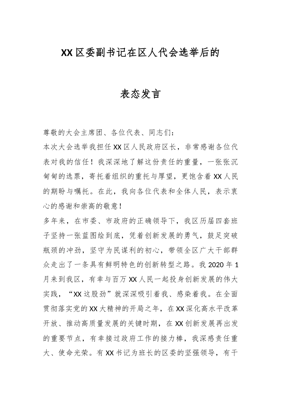 XX区委副书记在区人代会选举后的表态发言尊敬的大会主席团、各位代表、同志们:本次大会选举我担任XX区人民政府区长,非常感谢各位代表对我的信任!我深深地了解这份责任的重量,一张张沉甸甸的选票,寄托着组织的重托与厚望,更饱含着XX人民的期盼与嘱托。在此,我向各位代表和全体人民,表示衷心的感谢和崇高的敬意!多年来,在市委、市政府的正确领导下,我区历届四套班子坚持一张蓝图绘到底,凭着创新发展的勇气,鼓足突破瓶颈的冲劲,坚守为民谋利的初心,带领全区广大干部群众走出了一条具有鲜明特色的创新转型之路。我2020年1月来到我区,有幸与百万XX人民一起投身创新发展的伟大实践,“XX这股劲”就深深吸引着我、感染着我。在全面贯彻落实党的XX大精神的开局之年,在XX深化高水平改革开放、推动高质量发展的关键时期,在XX创新发展再出发的重要节点,有幸接过政府工作的接力棒,我深感责任重大、使命光荣。有XX书记为班长的区委的坚强领导,有干部群众的团结合作,有坚实的发展基础,有在座各位的监督和支持,我对做好工作充满信心。履行新职责,完成新使命,我唯有恪尽职守、接续奋斗,方能不负重托、不负人民。在此,我郑重承诺:面向再出发的新征程,我将始终把“讲政治、铸忠诚”作为第一要求。忠诚拥护“两个确立”、坚决做到“两个维护”,坚持不懈用习近平新时代中国特色社会主义思想武装头脑、指导实践、推动工作。我将牢固树立正确的政绩观,始终坚持将“国之大者”融入到思想里、落实到行动中,不断提高政治判断力、政治领悟力、政治执行力,带头当好中央、市委和区委各项决策部署的执行者、行动派实干家。面向再出发的新征程,我将始终把“抓发展、促创新”作为第一要务。紧紧围绕高质量发展这个首要任务,牢牢把握“四个放在”的站位要求,聚焦XX“五个中心”建设的发展定位,坚持系统谋划、妥善处理发展中的各种重大问题找准切入口、发力点,在大局下发展XX、壮大XX。我将按照区委提出的发展思路,全过程增强科技创新策源力,全方位提升创新产业竞争力,全要素激发创新生态生长力,全领域彰显创新环境吸引力,以排头兵的姿态、先行者的担当,推动XX始终走在创新发展的最前沿。面向再出发的新征程,我将始终把“惠民生、添福祉”作为第一追求。“人民城市人民建,人民城市为人民”,是习近平总书记对XX、对我区的深情寄语。我将努力学深悟透以人民为中心的发展思想,坚持以百姓心为心、以群众事为事、以人民福为福,扎实推进民生实事项目、持续加大基本保障力度,不断优化公共服务供给,更好回应群众的多元诉求努力把“为人民服务”镌刻在城市建设和管理的每个细节中。我将坚持全过程人民民主,始终把人民群众的意见和建议作为推动政府工作的不竭动力,努力建设属于人民、服务人民、成就人民的人民之城。面向再出发的新征程,我将始终把“守纪律、强作风”作为第一标准。始终把纪律和规矩挺在前面,时刻自重自省自警自励,坚决扛起区政府全面从严治党第一责任人职责认真履行“一岗双责”,驰而不息推进党风廉政建设,让秉公廉洁用权、勤勉干净干事在政府系统蔚然成风。我将继承发扬“四敢精神”,自觉践行“一线工作法”,深入实际、深入群众,不断提高高质量发展本领、服务群众本领、防范化解风险本领,推动政府各项决策工作更加符合实际情况、客观规律和人民意愿。各位代表、同志们,在我区创新发展再出发的新征程中,我将在以XX书记为班长的区委坚强领导下,在区人大、区政协和社会各界的监督支持下,团结带领区政府全体同志不忘初心、砥砺前行,以勤劳的汗水写满我区的土地,以实际行动回应XX人民的重托,以实实在在的成果谱写XX创新发展的壮美篇章!