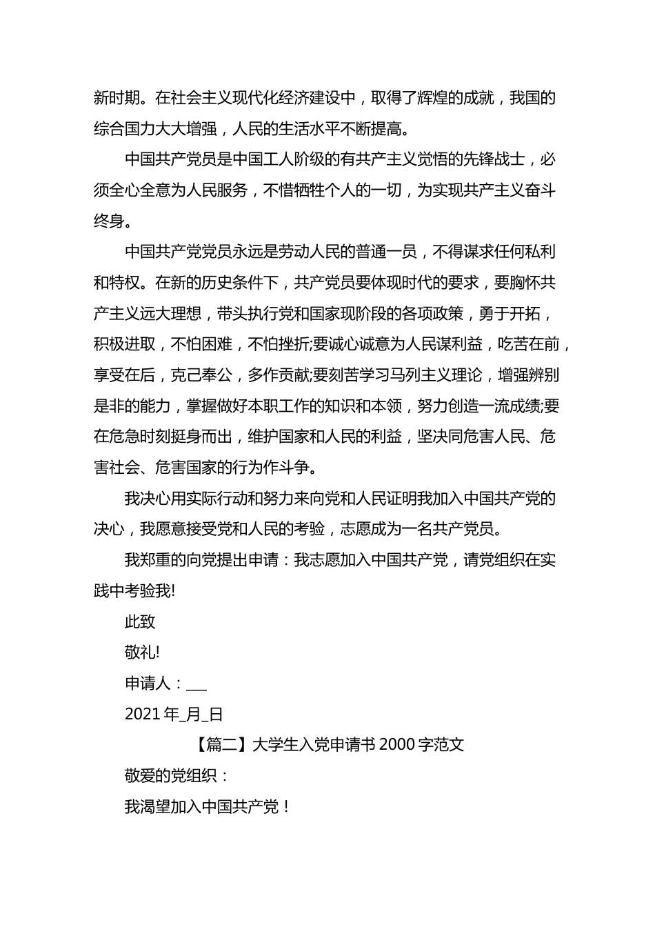 【篇一】大学生入党申请书2000字范文敬爱的党组织:我志愿加入中国共产党,拥护党的纲领,遵守党的章程,履行党员义务,执行党的决定,严守党的纪律,保守党的秘密,对党忠诚,积极工作,为共产主义奋斗终身。我衷心的热爱中国共产党并热切的希望加入中国共产党。上小学时,我成了一名少先队员,戴着红领巾,开始了对共产党了解的第一步,听老师和爸爸讲江姐、刘胡兰、雷锋、焦裕禄、孔繁森等很多共产党员的故事,给了我很多的启迪。他们无论叫什么,却都有一个共同的名字——共产党员,在危机关头,他们总是带领更多的共产党员,冲在最危险的前线,把生的希望和美好的生活留给我们。那时学得最多的词就是助人为乐、无私奉献……老师经常以此来教育我们,那时候我就下定决心,长大后一定要像他们那样,成为一名光荣的共产党员,为人民群众做贡献。为此,我总是好好学习,学习成绩也一直名列前茅,另外,我还努力参加很多课外实践活动,一直在努力着。上中学后,由于成绩优秀、表现突出,我成为了同届第一批共青团员中的一员,对党的认识进一步加强。我虽然在学校没有担任职务,但在班级担任学习委员、英语课代表等职,一直都尽心尽责,将便利带给同学,尽量将自己的职务做好,为同学们减轻学习上的负担,积极地参加学校、班级组织的义务劳动并鼓励大家一起参加,在老师的教育下,通过政治、历史科目的学习,我对共产党有了进一步的了解,同时,也更希望早日加入中国共产党。上高中后,我对党有了更深的认识,中国共产党是中国工人阶级的先锋队,同时是中国人民和中华民族的先锋队,是中国特色社会主义事业的领导核心,是工人阶级及广大劳动群众利益的忠实代表。党的最终目标是实现共产主义的社会制度。现在我是一名年满18周岁的大学生了,我可以加入中国共产党了。中国共产党以马克思列宁主义、毛泽东思想、邓小平理论、“三个代表”重要思想、科学发展观、习近平新时代中国特色社会主义思想作为自己的行动指南。领导和团结全国各族人民,以经济建设为中心,坚持四项基本原则,坚持改革开放,自力更生,艰苦创业,为把我国建设成为富强民主文明和谐的社会主义现代化国家而学习奋斗。中国共产党的成立是曲折的,历经了千辛万苦,她的诞生是近代中国社会政治经济发展的必然结果。1900年,八国联军侵华,辛丑条约的签订,唤起了一部分知识分子为拯救中国而努力。辛亥革命的失败揭示了资产阶级无力领导中国革命,需要新的阶级和政治力量来领导。自建党以来,党领导中国人民,英勇奋斗,不怕牺牲,前赴后继,以毛主席为主要代表的中国共产党人将马克思主义的基本原理与中国革命的具体实践相结合,创立了毛泽东思想,在其指引下,经过长期的反对帝国主义、封建主义、官僚资本主义的革命斗争,取得了新民主主义革命的胜利,建立了人民民主专政的中华人民共和国;建国以后,顺利地进行了社会主义改造,完成了从新民主主义到社会主义的过渡,确立了社会主义制度,发展了社会主义的经济、政治和文化。十一届三中全会以来,以邓小平为主要代表的中国共产党人,总结建国以来正反两方面的经验,解放思想,实事求是,实现全党工作中心向经济建设的转移,实行改革开放,开辟了社会主义事业发展的新时期。在社会主义现代化经济建设中,取得了辉煌的成就,我国的综合国力大大增强,人民的生活水平不断提高。中国共产党员是中国工人阶级的有共产主义觉悟的先锋战士,必须全心全意为人民服务,不惜牺牲个人的一切,为实现共产主义奋斗终身。中国共产党党员永远是劳动人民的普通一员,不得谋求任何私利和特权。在新的历史条件下,共产党员要体现时代的要求,要胸怀共产主义远大理想,带头执行党和国家现阶段的各项政策,勇于开拓,积极进取,不怕困难,不怕挫折;要诚心诚意为人民谋利益,吃苦在前,享受在后,克己奉公,多作贡献;要刻苦学习马列主义理论,增强辨别是非的能力,掌握做好本职工作的知识和本领,努力创造一流成绩;要在危急时刻挺身而出,维护国家和人民的利益,坚决同危害人民、危害社会、危害国家的行为作斗争。我决心用实际行动和努力来向党和人民证明我加入中国共产党的决心,我愿意接受...