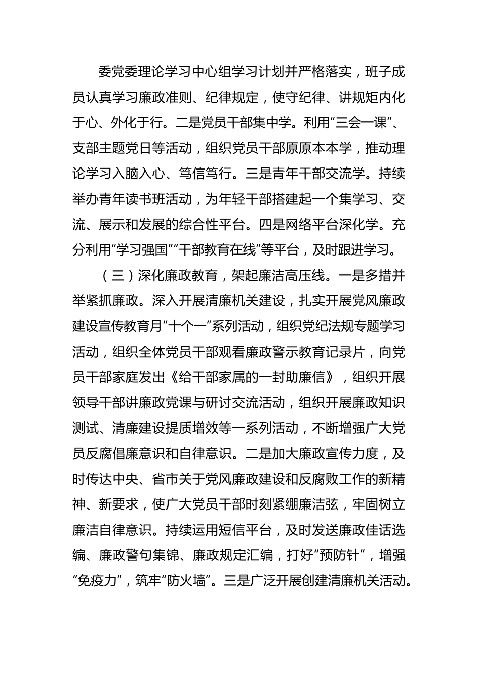 市委推动清廉机关建设工作汇报(2504字)根据有关通知精神,现将市XX委“清廉机关”建设情况汇报如下:一、工作进展及亮点(一)强化政治担当,压实责任求实效。市XX委党委坚持以习近平新时代中国特色社会主义思想为指导,认真执行党内政治生活若干准则,严守政治纪律和政治规矩。牢固树立“抓好党建就是最大政绩”理念,全面落实主体责任。发挥党委总揽全局、协调各方核心领导作用,建立健全层层负责的工作体制和机制,将压力层层传导,把责任压紧压实。明确党委书记为党建工作第一责任人,班子成员抓好分管范围内的党建工作,落实“一岗双责”要求,将党建工作与业务工作同谋划、同部署、同推进,形成齐抓共管的党建工作格局。(二)推进理论学习,筑牢拒腐防火墙。扎实推进“两学一做”学习教育常态化制度化,巩固深化“不忘初心、牢记使命”主题教育和党史学习教育成果,全面学习习近平新时代中国特色社会主义思想,跟进学习习近平总书记系列重要讲话精神,深刻领悟“两个确立”的决定性意义,增强“四个意识”,坚定“四个自信”,做到“两个维护”。一是领导班子带头学。年初制定市XX委党委理论学习中心组学习计划并严格落实,班子成员认真学习廉政准则、纪律规定,使守纪律、讲规矩内化于心、外化于行。二是党员干部集中学。利用“三会一课”、支部主题党日等活动,组织党员干部原原本本学,推动理论学习入脑入心、笃信笃行。三是青年干部交流学。持续举办青年读书班活动,为年轻干部搭建起一个集学习、交流、展示和发展的综合性平台。四是网络平台深化学。充分利用“学习强国”“干部教育在线”等平台,及时跟进学习。(三)深化廉政教育,架起廉洁高压线。一是多措并举紧抓廉政。深入开展清廉机关建设,扎实开展党风廉政建设宣传教育月“十个一”系列活动,组织党纪法规专题学习活动,组织全体党员干部观看廉政警示教育记录片,向党员干部家庭发出《给干部家属的一封助廉信》,组织开展领导干部讲廉政党课与研讨交流活动,组织开展廉政知识测试、清廉建设提质增效等一系列活动,不断增强广大党员反腐倡廉意识和自律意识。二是加大廉政宣传力度,及时传达中央、省市关于党风廉政建设和反腐败工作的新精神、新要求,使广大党员干部时刻紧绷廉洁弦,牢固树立廉洁自律意识。持续运用短信平台,及时发送廉政佳话选编、廉政警句集锦、廉政规定汇编,打好“预防针”,增强“免疫力”,筑牢“防火墙”。三是广泛开展创建清廉机关活动。培育清正廉洁理念,规范权力运行,正肃党风政风,促进党员干部、公职人员秉公用权、廉洁从政,推动全面从严治党向纵深发展,一体推进不敢腐、不能腐、不想腐。(四)加强作风建设,严守纪律正作风。一是落实规矩制度。严格贯彻落实中央八项规定精神,建立廉政风险防控机制,深入查找廉政风险可能存在和发生的环节,建立“谁在岗谁防控、谁主管谁监督、谁监督谁负责”的廉政风险防控监督责任制。落实个人重大事项主动向党委事前报告和事后报备、机关重大开支向派驻纪检监察组事前报告和事后报备制度。二是狠抓工作落实落小。建立责任分解机制,办公室对上级决策部署和党委安排交办的工作,登记建档,生成责任清单,及时交办到相关科室和责任人。严格落实岗位责任制,各科室工作任务将工作具体化、项目化,分解到承办人员。健全监督检查机制,办公室对不能按时保质保量完成的工作建立清单移交到局主责办,机关纪委对查核属实的建立问责工作台账,坚持有责必问、失职必究的原则,严肃追责问责,形成工作闭环。三是做实做细日常监督。严格落实市XX委谈心谈话“八个必谈”(从严治党教育必谈、工作检查考核必谈、干部任用调配必谈、有苗头性问题必谈、重要时间节点必谈、重要风险岗位必谈、个人重要事项必谈、外出学习考察必谈)要求及时了解掌握党员干部的思想、作风和工作情况,及时发现处置苗头性问题,抓早抓小,让咬耳扯袖,红脸出汗成为常态。(五)健全制度建设,完善规范促执行。一是严守纪律规矩。局党委坚持把纪律和规矩挺在前面,有责必履、有错必纠、失责必问。近年来对机关制度进行全面梳理,修订完善《党委会议议事决策规则》等多项制度...