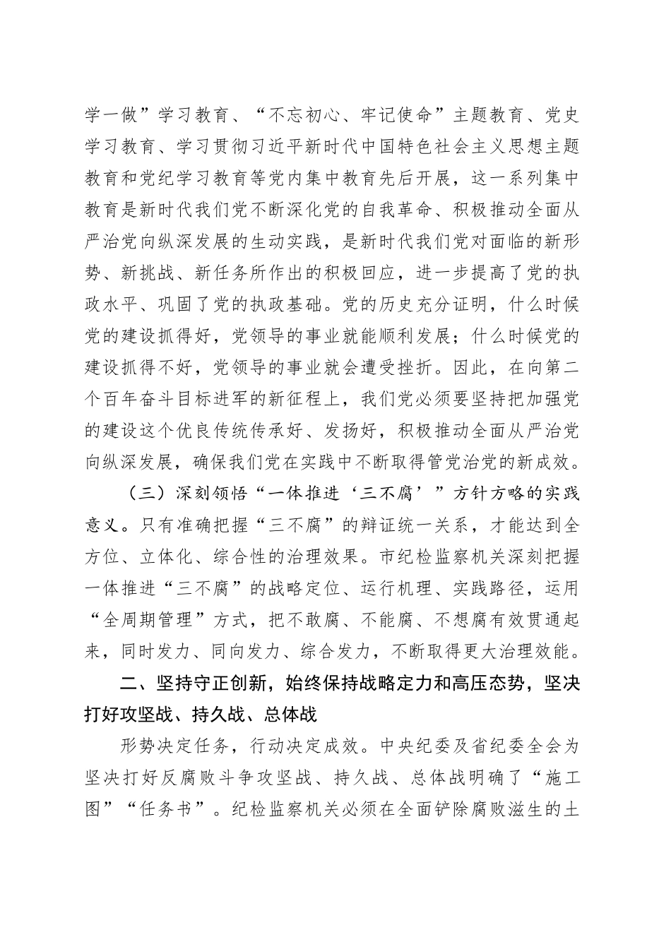 廉政党课讲稿:以自我革命精神深化党风廉政建设,推动党风政风持续向优向好学习教育廉政党课讲稿:以自我革命精神深化党风廉政建设,推动党风政风持续向优向好党中央决定,自全国“两会”结束至7月底,在全党开展深入贯彻中央八项规定精神学习教育。这次学习教育,是习近平总书记亲自点题、亲自部署的一项重要工作,也是今年党建工作的一项重点任务,彰显了以习近平同志为核心的党中央推动全党锲而不舍落实中央八项规定及其实施细则精神、持之以恒推动党风政风向优向好的坚定决心。在二十届中央纪委四次全会上,习近平总书记着眼于实现新时代新征程党的使命任务,深刻阐述纵深推进全面从严治党、正风肃纪反腐一系列根本性方向性全局性重大问题,对深入推进全面从严治党作出战略部署。省纪委十二届五次全会认真学习、深刻领会习近平总书记重要讲话精神,要求一体推进不敢腐、不能腐、不想腐,坚决打好反腐败斗争攻坚战、持久战、总体战。市纪检监察机关坚决落实中央纪委及省纪委全会部署要求,坚定敢打必胜的信念,精准发力、持续发力,以彻底的自我革命精神把反腐败斗争进行到底。一、提高政治站位,运用新时代反腐败斗争的宝贵经验,坚定不移把反腐败斗争向纵深推进旗帜指引方向,使命凝聚力量。市纪委监委学习贯彻习近平总书记关于党的自我革命的重要思想,用新时代党的创新理论蕴含的立场观点方法破解实践难题,将一体推进“三不腐”方针方略贯穿正风肃纪反腐全过程,以永远在路上的坚韧执着把党的自我革命进行到底。(一)深刻领悟习近平总书记关于党的自我革命的重要思想对反腐败斗争的指导意义。腐败是我们党面临的最大威胁,反腐败是最彻底的自我革命。党的十八大以,以习近平同志为核心的党中央以“得罪千百人、不负十四亿”的使命担当,以史无前例的力度反腐肃贪,赢得了确保党不变质、不变色、不变味的历史主动,赢得了党团结带领全体人民为强国建设、民族复兴伟业共同奋斗的历史主动。市纪检监察机关着眼战略全局把握反腐败斗争的极端重要性,始终扛牢职责使命,准确把握形势任务,以更加有力有效的思路举措正风肃纪、反腐惩恶,坚决打赢反腐败斗争这场攻坚战、持久战、总体战。(二)深刻领悟新时代深化党风廉政建设的重要意义。我们党历来高度重视自身建设,从严管党治党是中国共产党在百年发展历程中不断战胜困难、迎接风险挑战进而不断成长壮大的关键所在,也是中国共产党团结带领全国各族人民在中国特色社会主义道路上勇往直前、不断取得伟大成就的根本所在,更是中国共产党领导中国革命、建设发展和改革事业不断向前并取得更大胜利的重要法宝。党的十八大以来,在以习近平同志为核心的党中央领导下,党的“三严三实”专题教育、“两学一做”学习教育、“不忘初心、牢记使命”主题教育、党史学习教育、学习贯彻习近平新时代中国特色社会主义思想主题教育和党纪学习教育等党内集中教育先后开展,这一系列集中教育是新时代我们党不断深化党的自我革命、积极推动全面从严治党向纵深发展的生动实践,是新时代我们党对面临的新形势、新挑战、新任务所作出的积极回应,进一步提高了党的执政水平、巩固了党的执政基础。党的历史充分证明,什么时候党的建设抓得好,党领导的事业就能顺利发展;什么时候党的建设抓得不好,党领导的事业就会遭受挫折。因此,在向第二个百年奋斗目标进军的新征程上,我们党必须要坚持把加强党的建设这个优良传统传承好、发扬好,积极推动全面从严治党向纵深发展,确保我们党在实践中不断取得管党治党的新成效。(三)深刻领悟“一体推进‘三不腐’”方针方略的实践意义。只有准确把握“三不腐”的辩证统一关系,才能达到全方位、立体化、综合性的治理效果。市纪检监察机关深刻把握一体推进“三不腐”的战略定位、运行机理、实践路径,运用“全周期管理”方式,把不敢腐、不能腐、不想腐有效贯通起来,同时发力、同向发力、综合发力,不断取得更大治理效能。二、坚持守正创新,始终保持战略定力和高压态势,坚决打好攻坚战、持久战、总体战形势决定任务,行动决定成效。中央纪委及省纪委全会为坚决打好反腐败斗争攻坚战、持久战、总体战明确了...