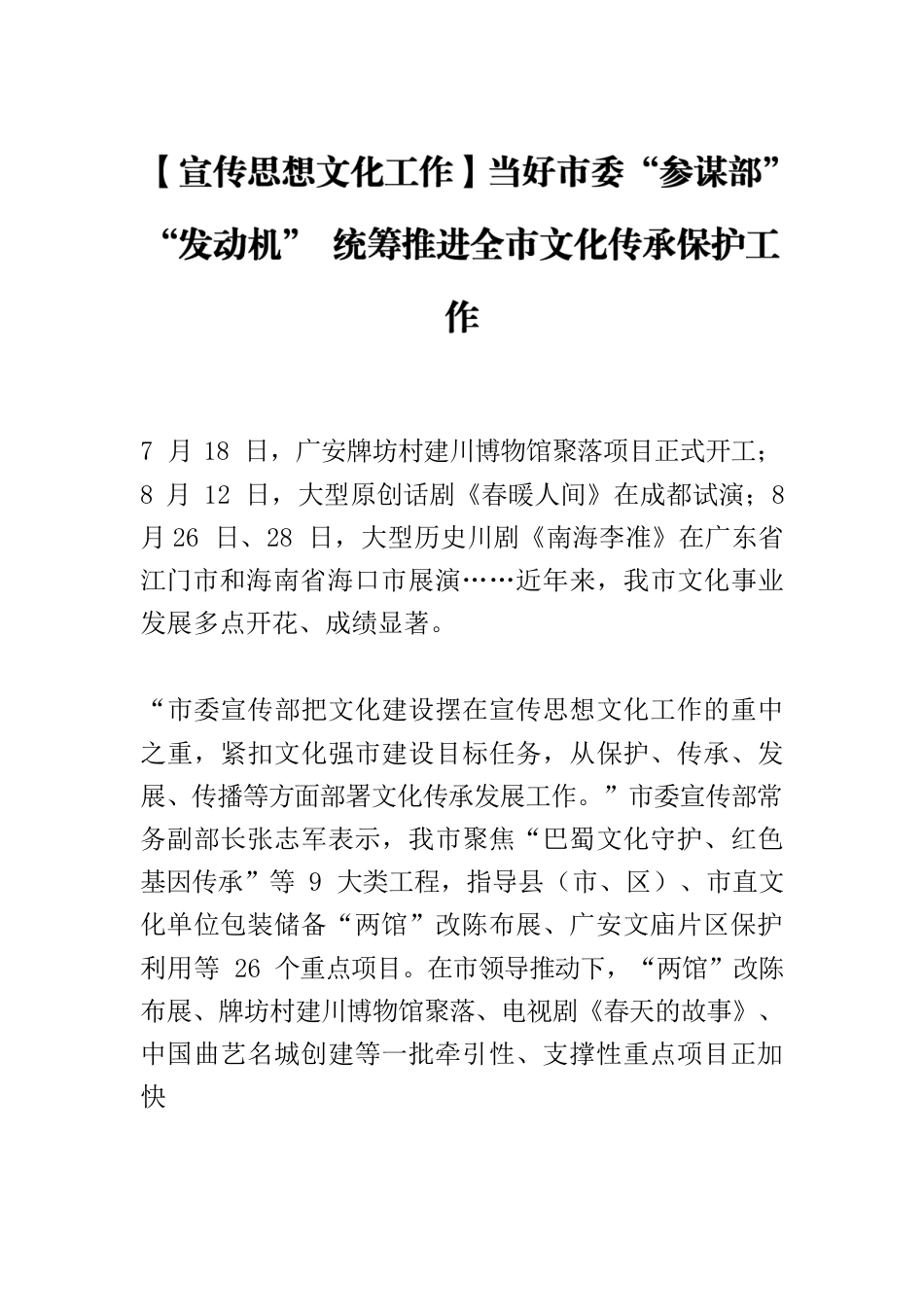7月18日,广安牌坊村建川博物馆聚落项目正式开工;8月12日,大型原创话剧《春暖人间》在成都试演;8月26日、28日,大型历史川剧《南海李准》在广东省江门市和海南省海口市展演……近年来,我市文化事业发展多点开花、成绩显著。“市委宣传部把文化建设摆在宣传思想文化工作的重中之重,紧扣文化强市建设目标任务,从保护、传承、发展、传播等方面部署文化传承发展工作。”市委宣传部常务副部长张志军表示,我市聚焦“巴蜀文化守护、红色基因传承”等9大类工程,指导县(市、区)、市直文化单位包装储备“两馆”改陈布展、广安文庙片区保护利用等26个重点项目。在市领导推动下,“两馆”改陈布展、牌坊村建川博物馆聚落、电视剧《春天的故事》、中国曲艺名城创建等一批牵引性、支撑性重点项目正加快推进。抢抓邓小平同志诞辰120周年等机遇,我市积极向上争取,紧盯年度目标任务持续发力,加快编撰《文话广安——城市文脉》丛书,打磨提升《春暖人间》,筹备巡演。同时,组织31名师生参加全省第二届书画传习大会,深入开展乡村文化振兴魅力竞演活动,打造乡土文化品牌、绽放乡村文化魅力、展示乡村振兴成效。针对下一步工作,张志军表示,市委宣传部将坚决扛起牵头责任、文化使命,当好市委推动文化传承发展的“参谋部”“发动机”,研究制定历史文化遗产综合保护利用专项规划和支持措施,深化广安红色文化、民俗文化、曲艺文化、三线文化等研究阐释和创造性转化,用好巴蜀文化领军人才、青年人才和小平故里培优计划等人才扶持政策,推动形成文化文艺人才争相涌现的良好局面。高频率向上争对外引,我市以抓经济工作的理念抓文化建设,突出争资金争支持、引龙头引业态,重点争取中华优秀传统文化传承发展23项重点工程和巴蜀文化“两创”行动36项任务中的项目资金,跟进落实历史文化遗产综合保护利用“双试点”、文化传承发展“专精特新”工程等重点争取事项,积极争创乡村石窟文化公♘(微景观)、非遗保护传承基地等命名奖补项目。党的二十大报告提出,要大力繁荣发展文化事业和文化产业,通过实施重大文化产业项目带动战略,推动文化产业高质量发展。对此,我市高质量推动重点项目,指导督促县(市、区)、市直文化单位做细做实基础工作,推动一批看得见、摸得着、见实效的项目和工作。同时,大力推进文旅深度融合发展,擦亮“小平故里行·华蓥山上居·嘉陵江畔游”文旅新名片。加快推进文化数字化建设,让更多数字文化产品“出圈”“破界”。深入实施文化惠民工程,办好乡村文化振兴魅力竞演大赛,争创公共文化服务城乡融合发展县域试点,加强优质文化产品和服务供给,不断满足人民群众日益增长的精神文化需要。“迎接邓小平同志诞辰120周年实施的重点事项与加强文化建设密切相关,建成后将对文化强市建设起到良好聚合辐射和示范引领作用。”张志军表示,我市加快推进“两馆”改陈布展、电视剧《春天的故事》开机拍摄、广安牌坊村建川博物馆聚落等重点项目,高质量完成话剧《春暖人间》打磨提升以及赴北京、深圳巡演和落地广安常态演出筹备,持续开展“争做新时代小平家乡种树人”等主题宣传活动,凝聚“共同富裕·共建广安”强大合力。