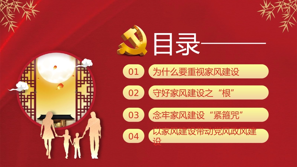 重视家风建设从严治党治家家风建设应成为领导干部“必修课”汇报人:XXX家风建设习近平总书记指出:“家庭是社会的基本细胞,是人生的第一所学校。不论时代发生多大变化,不论生活格局发生多大变化,我们都要重视家庭建设,注重家庭、注重家教、注重家风”。党员领导干部要认真学习领会总书记关于家风建设的重要论述,坚持内外兼修、齐家治政,切实把家风建设摆在重要位置,自觉营造良好家风,真正安好家庭成长摇篮、守好家庭廉洁堤防、建好家庭幸福港湾,着力做到清清白白做人、干干净净干事,以好家风涵养好的党风政风、引领好的社会风气。目录为什么要重视家风建设01守好家风建设之“根”02念牢家风建设“紧箍咒”03以家风建设带动党风政风建设04为什么要重视家风建设第一章为什么要重视家风建设家风建设影响干部作风、关系廉洁从政01领导干部的家风建设,不是个人私事、家庭小事,而是体现领导干部作风、关系廉洁从政的大事,与党风政风也密切相关。剖析一些落马官员的案件,家风不正、对亲属子女失管失教,根子还是出在领导干部自身的思想上。案例一中国南方电网有限责任公司原党组书记、董事长李庆奎“长期对家属失管失教”案例二云南省公安厅治安总队原总队长早明光“不重视家风建设,对配偶失管失教,造成不良社会影响为什么要重视家风建设家风建设是为人做官的重要课题02纪律规矩意识缺失,思想“总开关”没拧紧,出现“跑冒滴漏”有的领导干部觉得自己忙于工作疏于亲情,让亲属子女得一些好处算作补偿;有的认为亲属子女经商办企业只是利用自己的影响力,而非自己直接以权谋私;有的精心设计,将人脉、资源等嫁接到亲属身上,甚至让其充当敛财的“中介”。左传卫庄公宠溺儿子州吁的故事令人警醒:州吁喜好武事,卫庄公不加禁止,卫国大夫石碏劝告其约束州吁的行为,“宠子”不等于“爱子”。但卫庄公不听,导致州吁恃宠而骄,日益骄奢淫逸,最终惹来杀身之祸。为什么要重视家风建设家风建设是我们党的优良传统03重视家风建设,是我们党的优良传统。党内法规已将家风建设上升成为党员领导干部的一项“必修课”。从周恩来的“十条家规”,到焦裕禄的“不能搞特殊”,到杨善洲的“苛刻教育”,这些均为广大党员干部树立了榜样。重视家风建设,对亲属子女的严管严教,不仅仅是道德要求,更是政治要求、纪律要求。从作出进一步规范领导干部配偶、子女及其配偶经商办企业行为的规定,到《中国共产党廉洁自律准则》提出党员要“廉洁齐家,自觉带头树立良好家风”,再到新修订的《中国共产党纪律处分条例》规定了党员领导干部不重视家风建设,对配偶、子女及其配偶失管失教的处分措施。每一名党员领导干部都应从自身做起,修身律己,注重家风家教,管好“身边人”。只有家风正,党风政风才能正,社会风气才能正。守好家风建设之“根”第二章守好家风建设之“根”《中国共产党纪律处分条例》规定党员领导干部不重视家风建设,对配偶、子女及其配偶失管失教,造成不良影响或者严重后果的,给予警告或者严重警告处分;情节严重的,给予撤销党内职务处分首次将不注重家风建设列为纪律处分的一项重要内容。这是对广大领导干部发出的家风建设动员令,为广大党员干部指明了方向,提出了要求守好家风建设之“根”家风正则民风正·民风正则政风清家风是党员干部事业发展的“根基”,家风不正、家风不严,就会“祸起萧墙”“后院失火”,败坏民风社风政风。“欲治其国者,先齐其家”,党员领导干部要用心用情用力抓好家风建设,莫让家风“沦陷”。ABC守住家风建设之根当好家风建设之范负起家风建设之责守好家风建设之“根”守住家风建设之根中华民族的家风文化是千年孕育的美德,传统家风在新时代仍然具有重要的价值。习近平总书记指出:“家风好,就能家道兴盛、和顺美满;家风差,难免殃及子孙、贻害社会。”党员干部要大力弘扬中华民族传统美德,践行社会主义核心价值观,赋予传统家风文化新的实质内涵,守住传统家风文化之“根”,培树践行良好家风。负起家风建设之责经常听说一些领导干部“忙得顾不上家”“子女教育出问题”。“一屋不扫,何以扫天下?”领导干部再忙,对于家庭妻...