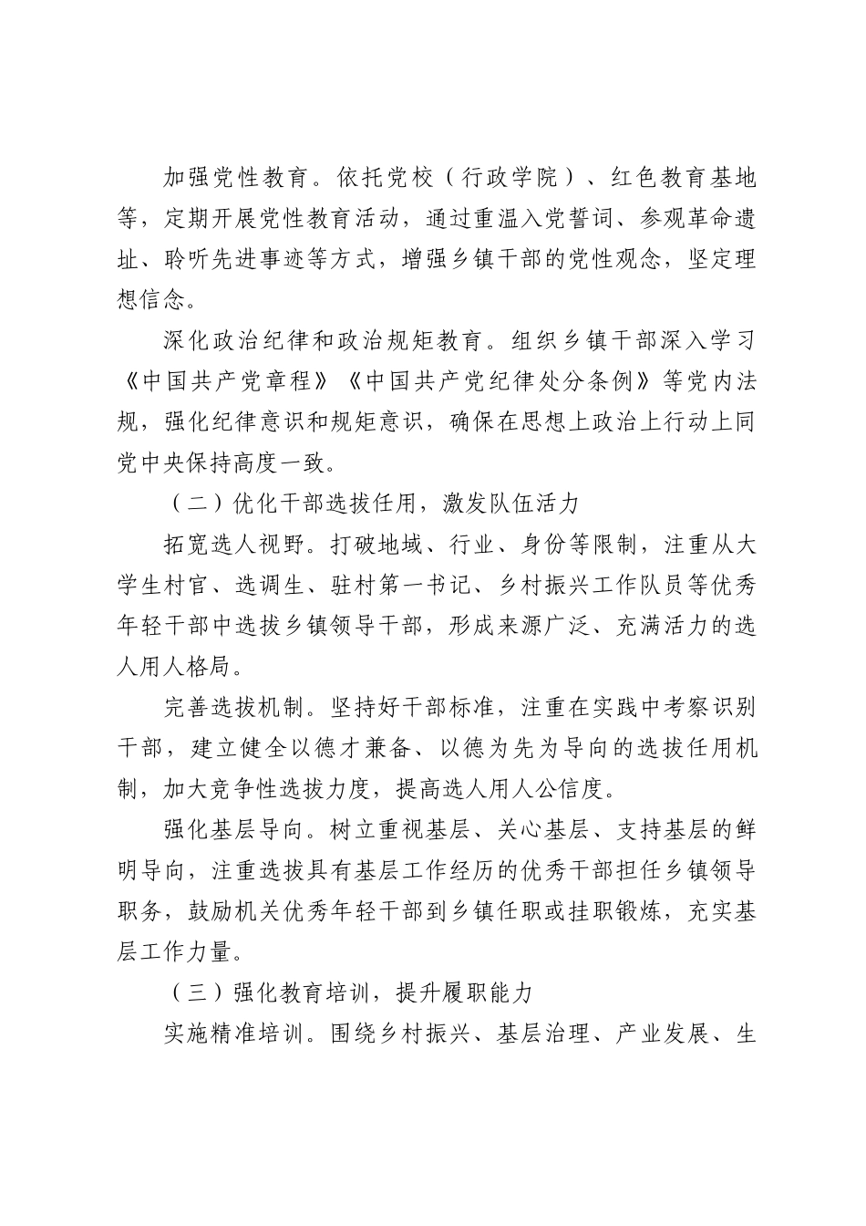 目录关于乡镇干部队伍建设的若干意见贯彻落实《关于加强乡镇干部队伍建设的若干意见》的汇报材料乡镇干部队伍建设论文关于乡镇干部队伍建设的若干意见前言乡镇作为国家治理体系的基础单元,是连接党和政府与人民群众的桥梁纽带,其干部队伍的素质与能力直接关系到党的政策方针能否有效落地、乡村振兴战略能否顺利实施以及人民群众对美好生活的向往能否得到更好满足。当前,随着经济社会快速发展和改革不断深入,乡镇工作面临着新形势、新任务、新挑战,加强乡镇干部队伍建设,打造一支政治过硬、本领高强、作风优良的基层干部队伍,成为推动乡村全面振兴、促进社会和谐稳定的关键所在。为此,特提出以下若干意见。一、总体要求(一)指导思想以习近平新时代中国特色社会主义思想为指导,深入贯彻党的XX大精神,坚持党管干部原则,以提升政治素质、增强履职能力、改进工作作风为重点,全面加强乡镇干部队伍建设,为实施乡村振兴战略、推进基层治理体系和治理能力现代化提供坚强组织保证。(二)基本原则党管干部:坚持党的领导,把政治标准放在首位,确保乡镇干部队伍忠诚干净担当。德才兼备:注重选拔既有政治觉悟又有实际能力,既会干事又能干成事的优秀干部。注重实践:鼓励干部深入基层一线,经受实践锻炼,增长才干。严管厚爱:既严格管理监督,又关心关爱干部,激发干部干事创业热情。(三)总体目标通过一系列措施,力争在三年内,实现乡镇干部队伍结构更加优化、素质明显提高、作风持续好转、能力显著提升,形成一支能够适应新时代乡镇工作要求的高素质专业化干部队伍。二、主要措施(一)加强思想政治建设,提升政治素养强化理论武装。把学习贯彻习近平新时代中国特色社会主义思想作为首要政治任务,建立健全常态化学习机制,通过集中学习、专题研讨、在线学习等多种形式,引导乡镇干部学深悟透、融会贯通,增强“四个意识”、坚定“四个自信”、做到“两个维护”。加强党性教育。依托党校(行政学院)、红色教育基地等,定期开展党性教育活动,通过重温入党誓词、参观革命遗址、聆听先进事迹等方式,增强乡镇干部的党性观念,坚定理想信念。深化政治纪律和政治规矩教育。组织乡镇干部深入学习《中国共产党章程》《中国共产党纪律处分条例》等党内法规,强化纪律意识和规矩意识,确保在思想上政治上行动上同党中央保持高度一致。(二)优化干部选拔任用,激发队伍活力拓宽选人视野。打破地域、行业、身份等限制,注重从大学生村官、选调生、驻村第一书记、乡村振兴工作队员等优秀年轻干部中选拔乡镇领导干部,形成来源广泛、充满活力的选人用人格局。完善选拔机制。坚持好干部标准,注重在实践中考察识别干部,建立健全以德才兼备、以德为先为导向的选拔任用机制,加大竞争性选拔力度,提高选人用人公信度。强化基层导向。树立重视基层、关心基层、支持基层的鲜明导向,注重选拔具有基层工作经历的优秀干部担任乡镇领导职务,鼓励机关优秀年轻干部到乡镇任职或挂职锻炼,充实基层工作力量。(三)强化教育培训,提升履职能力实施精准培训。围绕乡村振兴、基层治理、产业发展、生态环保等重点工作,制定个性化培训计划,采取“走出去”与“请进来”相结合的方式,邀请专家学者、先进典型授课,组织乡镇干部到发达地区学习考察,提升专业素养和业务能力。加强实践锻炼。建立乡镇干部轮岗交流制度,鼓励干部跨岗位、跨部门锻炼,丰富工作经历;选派优秀干部参与重大项目建设、重点任务攻坚,在实践中锤炼本领、增长才干。推动创新创业。鼓励乡镇干部立足本地实际,大胆探索创新,支持有条件的乡镇干部领办创办农民专业合作社、家庭农场等新型农业经营主体,带动农民增收致富。(四)改进工作作风,密切联系群众践行群众路线。深入开展“我为群众办实事”实践活动,引导乡镇干部深入田间地头、农户家中,了解群众所思所盼,解决群众急难愁盼问题,以实际行动密切党群干群关系。强化服务意识。推动乡镇干部转变思想观念,增强服务意识,主动为群众提供便捷高效的服务,优化办事流程,减少审批环节,提高服务效率。加强作风建设。持续深化纠治“四风”特别是形式主义、官僚主义问...