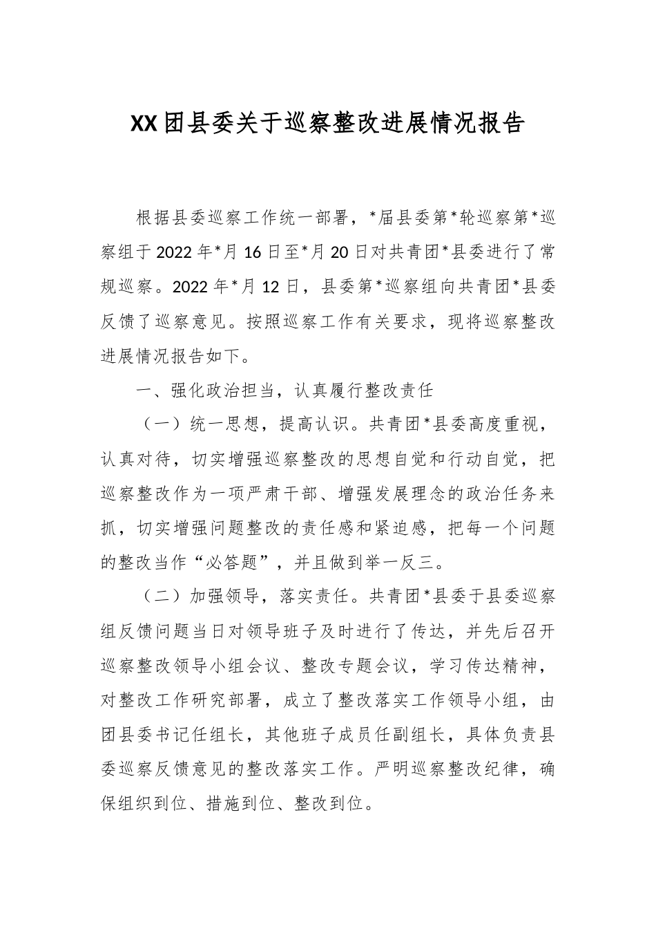 XX团县委关于巡察整改进展情况报告根据县委巡察工作统一部署,*届县委第*轮巡察第*巡察组于2022年*月16日至*月20日对共青团*县委进行了常规巡察。2022年*月12日,县委第*巡察组向共青团*县委反馈了巡察意见。按照巡察工作有关要求,现将巡察整改进展情况报告如下。一、强化政治担当,认真履行整改责任(一)统一思想,提高认识。共青团*县委高度重视,认真对待,切实增强巡察整改的思想自觉和行动自觉,把巡察整改作为一项严肃干部、增强发展理念的政治任务来抓,切实增强问题整改的责任感和紧迫感,把每一个问题的整改当作“必答题”,并且做到举一反三。(二)加强领导,落实责任。共青团*县委于县委巡察组反馈问题当日对领导班子及时进行了传达,并先后召开巡察整改领导小组会议、整改专题会议,学习传达精神,对整改工作研究部署,成立了整改落实工作领导小组,由团县委书记任组长,其他班子成员任副组长,具体负责县委巡察反馈意见的整改落实工作。严明巡察整改纪律,确保组织到位、措施到位、整改到位。(三)统筹谋划,制定方案。坚持问题导向,全面落实整改任务,共青团*县委经过多次研究,并在县纪委监委、县委组织部、县委巡察办的精心指导下,制定了实施方案和整改措施,逐项分解任务清单,对巡察反馈存在的“三个聚焦”,24个具体问题分别落实到责任领导和责任部室,将巡察反馈的问题清单建立整改台账,针对存在的问题逐一对账销号,对需要长期推进解决的问题,深入调查研究制定整改计划,并明确完成时限,切实加以整改到位,确保件件有落实、件件有回音。(四)深化长效机制,强化工作实效。共青团*县委坚持问题导向,对照问题清单,敢于动真碰硬,既拿出“当下改”的举措,又完善“长久立”的机制,以解决点上的具体问题带动面上整体提升。在抓好整改、解决问题的同时,把解决问题和制度建设结合起来,研究制定科学、管用、长效的工作机制,巩固、拓展好整改成果,推动整改工作制度化、长效化、常态化。目前,整改工作有序推进,整改工作已经取得了阶段性成果。针对县委巡察组反馈意见梳理出的24个具体问题阶段性完成整改24个,需长期推进24个。二、坚持问题导向,切实落实整改成效(一)聚焦贯彻落实党的路线方针政策和中央重大决策部署方面问题1.关于“对意识形态工作重要性认识不足,具体工作落实不够到位。一是未将意识形态工作列入年度工作要点,领导班子会议未做到每半年专题研究意识形态工作;二是理论中心组学习不够认真,未制定学习计划,无签到表、照片等资料;三是对互联网等新媒体应用不充分,关键岗位的同志对学习强国app的学习引领作用发挥不够”的问题。此问题整改长期推进。整改措施:一是提高对意识形态工作的重视程度。将意识形态工作作为重中之重,纳入年度工作要点,针对青少年思想道德教育、青少年网络舆情、意识形态安全等方面,结合实际情况定期召开专题研究讨论,领导班子至少半年专题研究一次意识形态工作。二是认真执行党组理论中心组学习制度,结合党的最新理论,制定年度学习计划,规范会务制度,做好会议记录和资料存档工作;三是加强对“学习强国”APP的应用,设置季度积分任务,鼓励干部职工利用好“碎片化时间”进行学习。整改成效:一是我委将青少年意识形态工作纳入年度工作要点,组织全县青少年持续开展“青年大学习”、“红领巾爱学习”等网上学习活动,并先后组织开展“喜迎二十大”“学习二十大”等系列主题活动,教育引导青少年永远跟党走,厚植爱党爱国思想;二是截止目前,我委共组织开展20次理论集中学习,机关干部撰写学习笔记共计130余篇;三是组织动员,我委10月份“学习强国”学习参与率排名位于县直机关事业单位第四。2.关于“不忘初心、牢记使命”主题教育不认真、不严谨。一是民主生活会记录不全,没有把班子成员之间的批评与自我批评进行记录;二是无民主生活会前征求下级团委和团员青年意见建议的内容,无与班子成员及下级团委干部的谈心记录的问题。此问题整改阶段性任务已办结。整改措施:进一步规范民主生活会相关程序,主动征求下级团委和团员青年意见,完善会议记录,坚持以发现问题和解决问题为目的,深化...