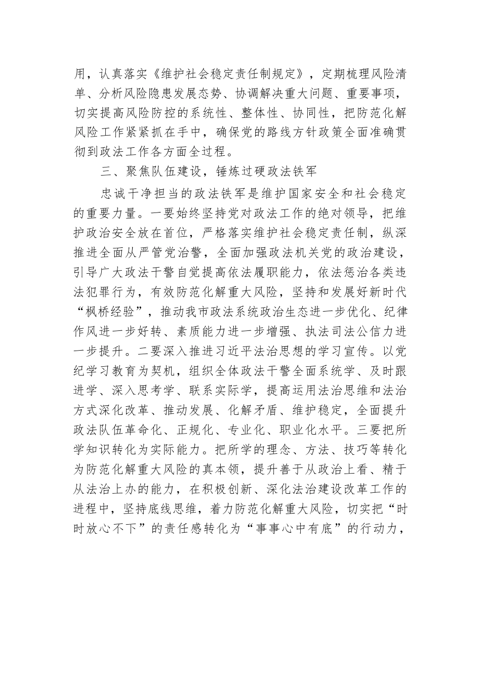 学习贯彻习近平法治思想研讨交流发言提纲法治兴则国兴,法治强则国强。学习贯彻习近平法治思想是依法履职、开展工作的基本功和必修课。作为一名政法系统的党员领导干部,必须坚持以习近平新时代中国特色社会主义思想为指导,深入学习贯彻习近平法治思想和党的二十届三中全会精神,努力把学习研讨成果转化为做好新时代政法工作的强大思想力量和工作实践。一、坚持党的领导,持续强化理论武装坚持党的绝对领导是防范化解重大风险的根本保证,要深刻领悟“两个确立”的决定性意义,增强“四个意识”、坚定“四个自信”、做到“两个维护”,把党的领导贯穿到防范化解重大风险工作各方面全过程,只有在党的集中统一领导下,统筹协调各方面力量资源,依法维护国家安全,防范化解重大风险工作才能攻坚克难、闯关夺隘,不断取得新的突破性进展。作为领导干部,一要带头学习贯彻习近平法治思想、习近平总书记关于防范化解重大风险的重要论述,不断提升运用法治思维和法治方式防范化解风险的能力,把化解风险的责任落实到具体岗位、延伸到终端末梢,切实拧紧责任链条。二要对标对表习近平总书记提出的“八项本领”“七种能力”,切实提升风险感知力、问题处置力、法治运用力、队伍战斗力,善于运用法治思维和法治方式防范风险、化解矛盾、维护稳定,练就防风险、保安全、护稳定的硬功夫。三要加强对风险的调查研究,搞清楚上级部署了哪些风险化解任务、本级如何抓好落实,弄明白其他地区出现了哪些风险,本地有无类似问题,分析透彻哪些应急预案需要进一步完善、哪些人防物防技防短板需要补齐,做到耳聪目明、成竹在胸。二、提高政治站位,坚决扛牢职责使命习近平总书记强调,全面依法治国必须坚持以人民为中心,为了人民、依靠人民、造福人民、保护人民。安全是人民的基本需要,没有人民安全,就没有人民幸福;人民安全是国家安全的深层因素,没有人民安全,也难有国家安全。政法机关要坚持以人为本,问计于民,把群众路线作为国家安全工作的生命线,让群众的聪明才智成为依法防范化解国家安全风险的不竭动力,准确把握防范化解重大风险的使命任务,不断提升应对风险的能力。一要始终坚持从政治上审视风险、从全局上把握风险、从思想上重视风险,常敲警钟、居安思危,不断增强风险洞察力、预见力。认真贯彻总体国家安全观,自觉运用法治思维、法治方式化解敏感问题,依法严惩危害国家安全和社会治安犯罪。二要强化责任担当,督促各部门严格落实维护社会稳定和防范化解风险隐患主体责任,抓好源头防范,不断加强法治建设,通过严格执法解决现实问题,通过公正司法维护社会公平正义,通过法律关系的确定维护社会的稳定,有效防范化解重大风险。三要发挥党委政法委“牵头抓总、统筹协调、督办落实”职能作用,认真落实《维护社会稳定责任制规定》,定期梳理风险清单、分析风险隐患发展态势、协调解决重大问题、重要事项,切实提高风险防控的系统性、整体性、协同性,把防范化解风险工作紧紧抓在手中,确保党的路线方针政策全面准确贯彻到政法工作各方面全过程。三、聚焦队伍建设,锤炼过硬政法铁军忠诚干净担当的政法铁军是维护国家安全和社会稳定的重要力量。一要始终坚持党对政法工作的绝对领导,把维护政治安全放在首位,严格落实维护社会稳定责任制,纵深推进全面从严管党治警,全面加强政法机关党的政治建设,引导广大政法干警自觉提高依法履职能力,依法惩治各类违法犯罪行为,有效防范化解重大风险,坚持和发展好新时代“枫桥经验”,推动我市政法系统政治生态进一步优化、纪律作风进一步好转、素质能力进一步增强、执法司法公信力进一步提升。二要深入推进习近平法治思想的学习宣传。以党纪学习教育为契机,组织全体政法干警全面系统学、及时跟进学、深入思考学、联系实际学,提高运用法治思维和法治方式深化改革、推动发展、化解矛盾、维护稳定,全面提升政法队伍革命化、正规化、专业化、职业化水平。三要把所学知识转化为实际能力。把所学的理念、方法、技巧等转化为防范化解重大风险的真本领,提升善于从政治上看、精于从法治上办的能力,在积极创新、深化法治建设改革工作的进程中,...