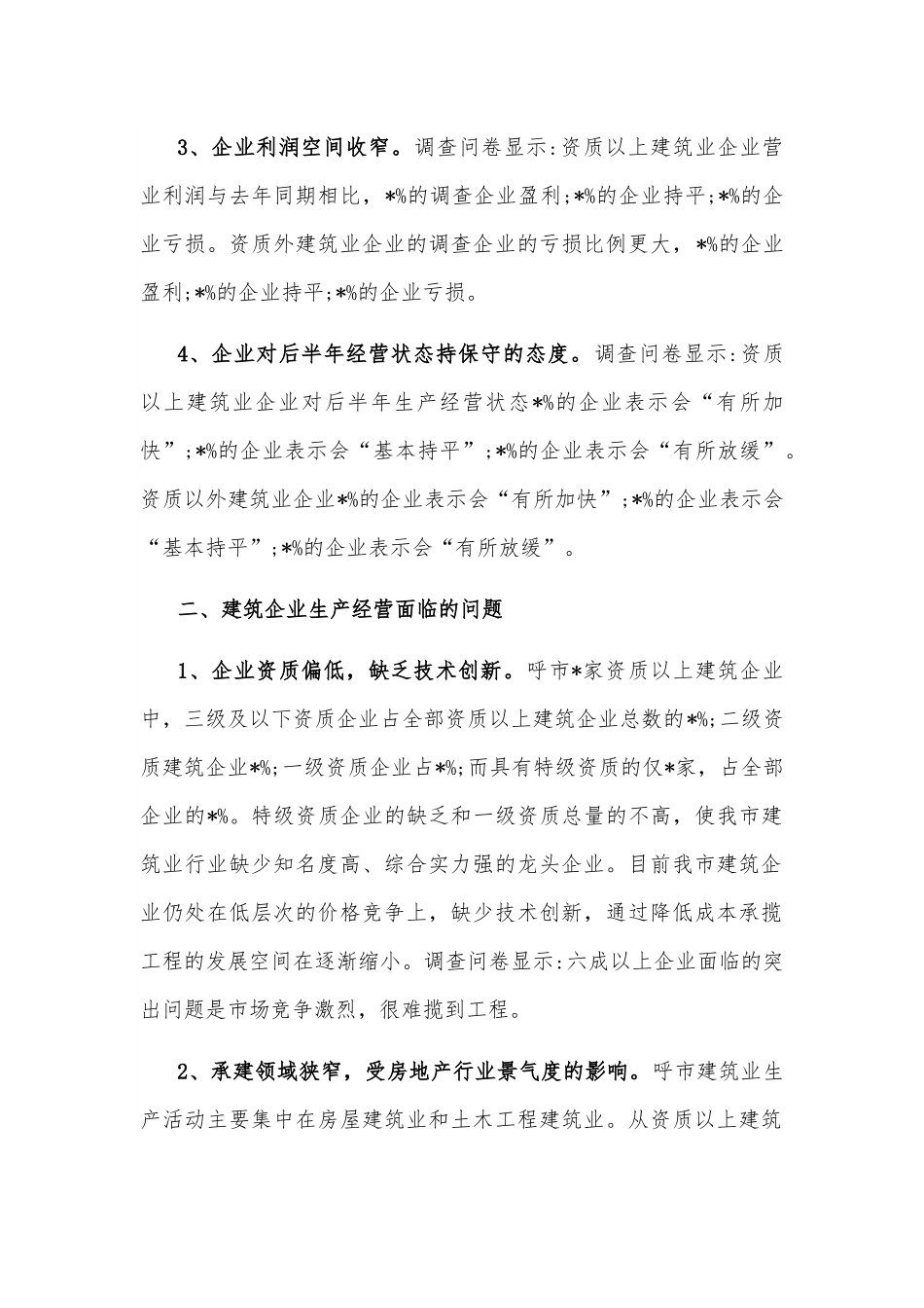 市建筑业企业生产经营情况调研报告为更好的了解*市建筑业企业生产经营情况,近期,市统计局对*家资质以上建筑业企业和*家资质外建筑业企业采取实地走访、问卷调查等方式开展专题调研。调研结果显示:疫情过后,呼市建筑业市场正在有序恢复,企业生产经营平稳,但盈利能力有所下降。一、调研企业基本情况1、2022年1-6月建筑企业生产经营情况不容乐观。资质以上建筑业企业调查问卷显示:*%的企业经营状况好于去年同期;*%的企业与去年同期相差不多;*%的企业经营情况差于去年同期。资质外建筑业企业调查问卷显示:*%的企业经营状况好于去年同期;*%的企业与去年同期相差不多;*%的企业经营情况差于去年同期。2、新签顶合同额和新开工进度减少。资质以上建筑业企业调查问卷显示:*%的调查企业1-6月份新签订的合同额“高于正常水平”;*%的调查企业新签订的合同额“处于正常水平”;*%的调查企业新签订的合同额“低于正常水平”。*%的调查企业新开工进度与去年同期相比“处于正常水平”;*%的调查企业新开工进度与去年相比“低于正常水平”。资质外建筑业企业调查问卷显示:*%的调查企业1-6月份新签订的合同额“高于正常水平”;*%的调查企业新签订的合同额“处于正常水平”;*%的调查企业新签订的合同额“低于正常水平”。*%的调查企业新开工进度与去年同期相比“处于正常水平”;*%的调查企业新开工进度与去年相比“低于正常水平”。3、企业利润空间收窄。调查问卷显示:资质以上建筑业企业营业利润与去年同期相比,*%的调查企业盈利;*%的企业持平;*%的企业亏损。资质外建筑业企业的调查企业的亏损比例更大,*%的企业盈利;*%的企业持平;*%的企业亏损。4、企业对后半年经营状态持保守的态度。调查问卷显示:资质以上建筑业企业对后半年生产经营状态*%的企业表示会“有所加快”;*%的企业表示会“基本持平”;*%的企业表示会“有所放缓”。资质以外建筑业企业*%的企业表示会“有所加快”;*%的企业表示会“基本持平”;*%的企业表示会“有所放缓”。二、建筑企业生产经营面临的问题1、企业资质偏低,缺乏技术创新。呼市*家资质以上建筑企业中,三级及以下资质企业占全部资质以上建筑企业总数的*%;二级资质建筑企业*%;一级资质企业占*%;而具有特级资质的仅*家,占全部企业的*%。特级资质企业的缺乏和一级资质总量的不高,使我市建筑业行业缺少知名度高、综合实力强的龙头企业。目前我市建筑企业仍处在低层次的价格竞争上,缺少技术创新,通过降低成本承揽工程的发展空间在逐渐缩小。调查问卷显示:六成以上企业面临的突出问题是市场竞争激烈,很难揽到工程。2、承建领域狭窄,受房地产行业景气度的影响。呼市建筑业生产活动主要集中在房屋建筑业和土木工程建筑业。从资质以上建筑业企业数量来看,房屋建筑业占*%,土木工程建筑业占*%,建筑安装业、建筑装饰装修及其他建筑业分别占*%、*%。超七成企业集中在房屋建筑业和土木工程建筑业,受房地产项目投资建设进度放缓的影响较大,在桥梁、水利、电力、化工等领域企业较少,承建能力大大较低,承建领域相对狭窄。3、企业负担较重,盈利能力下降。一是企业周转资金压力大。建筑企业垫资承揽工程较为普遍,工程款回收周期长,行业资产负债率持续偏高。调查问卷显示:在资金紧张的企业里*%的资质内建筑企业和*%的资质外建筑企业货款回笼慢。二是工程成本不断提高,如用工成本、原材料成本的不断上涨,是制约小微企业发展的只要因素。部分小微企业反映,由于工程成本的上涨,承接工程将面临亏损,不主动承接工程又难以维持运营,面临两难境地。三是融资成本不断加大,受房地产企业信用风险的传导影响,建筑施工企业的融资缺口不断扩大,融资成本逐渐提高。4、企业管理模式落后,员工整理素质不高。我市低等级资质企业偏多,企业管理模式比较落后,从业人员素质普遍偏低,导致企业运营效率不高,施工力量薄弱,很难在大项目竞标中与外省建筑业企业相抗衡。三、为企业纾难解困的几点建议1、加快产业结构调整,实施大企业战略。加速建筑企业改革,突破以房屋建筑业为主的局限,横向拓宽产业领域,向市政、交通、水利、电力等工程领域拓展。实施大企业战略,以优势企业为依...