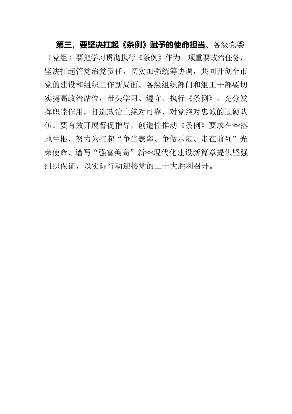《中国共产党组织工作条例》中心组研讨发言同志们:刚才,***教授围绕《中国共产党组织工作条例》作了专题辅导,详细介绍了《条例》的制定背景和重大意义,系统解读了新时代党的组织工作的根本任务、基本原则、领导体制、基本格局,深刻阐释了组织体系、干部、人才等各方面工作的核心要求和重点问题,对贯彻落实《条例》精神提出了建议。报告既结合历史、又针对现实,既有理论思考、又有个人体悟,内容丰富,通俗易懂,听了很有收获、很受启发,对于贯彻落实好《条例》精神、全面提高组织工作质量,具有很强的针对性、指导性。我们要深入学习贯彻习近平总书记关于党的建设和组织工作重要思想,准确把握党中央对做好新时代党的组织工作的制度安排和规范要求,不断开创我市党的建设和组织工作新局面。第一,要深刻认识《条例》颁布的重要意义。《中国共产党组织工作条例》是我们党历史上第一部关于组织工作的统领性、综合性基础主干法规,是习近平总书记关于党的建设和组织工作重要思想的集中体现。各地各部门要切实提高政治站位,把学习贯彻《条例》精神,与深入学习贯彻习近平新时代中国特色社会主义思想紧密结合起来,与贯彻落实习近平总书记重要指示批示精神和党中央决策部署联系起来,与深入学习贯彻党内法规制度体系贯通起来,认真执行《条例》明确的党对组织工作的领导体制和职责,坚决拥护“两个确立”,增强“四个意识”、坚定“四个自信”、做到“两个维护”,切实增强学习贯彻《条例》的政治自觉、思想自觉、行动自觉,推动党中央和省委、市委各项部署落地见效。第二,要准确把握《条例》蕴含的实践要求。党的组织工作是党的全部工作的基础,要紧紧围绕《条例》要求谋划推进组织工作各项任务,始终坚持组织路线服务保证政治路线的基本定位,着力找差距、补短板、强弱项,真正把组织优势转化为推动事业发展的致胜优势。要严密组织体系,全面加强各层级各领域党组织建设,充分发挥各级党组织战斗堡垒作用和党员先锋模范作用,不断增强党的政治领导力、思想引领力、群众组织力、社会号召力。要加强干部队伍建设,坚持党管干部原则,树牢正确用人导向,着力打造堪当现代化建设重任的高素质骨干队伍。要打造人才集聚高地,落实新时代人才强国、人才强省战略,以打造高水平人才平台、全面建设人才发展现代化强市为引领,持续打响“人到**才有为”工作品牌,真正“聚天下英才而用之”。第三,要坚决扛起《条例》赋予的使命担当。各级党委(党组)要把学习贯彻执行《条例》作为一项重要政治任务,坚决扛起管党治党责任,切实加强统筹协调,共同开创全市党的建设和组织工作新局面。各级组织部门和组工干部要切实提高政治站位,带头学习、遵守、执行《条例》,充分发挥职能作用,打造政治上绝对可靠、对党绝对忠诚的过硬队伍。要有效开展督促指导,创造性推动《条例》要求在**落地生根,努力为扛起“争当表率、争做示范、走在前列”光荣使命、谱写“强富美高”新**现代化建设新篇章提供坚强组织保证,以实际行动迎接党的二十大胜利召开。