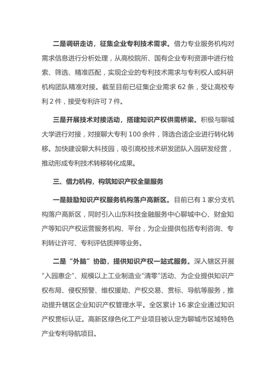 高新区专利技术转移转化试点工作情况汇报近年来,高新区以被确定为全省第一批专利技术转移转化试点园区为契机,深入实施“创新兴区”发展战略,强化专利技术运用,健全专利转移转化工作体系,激发市场主体知识产权创造活力,助推企业科技创新发展。近期,相关做法得到省市场监督管理局发文推广。一、完善机制,形成工作合力一是健全配套措施。制定高新区专利技术转移转化试点方案及绩效目标,选取5家优质企业作为试点企业给予资金扶持,开展专利技术转移转化工作。二是健全部门协作机制。实行“部门+专班”工作模式,部门与专班协作配合,优势互补,双管齐下。发展环境保障部、投资促进部、科技创新发展部、金融发展服务部等部门建立合作交流机制,实现资源互通,合力推进。三是加强督导调度。列入高新区重点工作,实行月调度、季考核,定期通报进展情况和考核成绩,切实保障工作落到实处。二、鼓励创新,促进供需对接一是精准培训,提升知识产权创造质量。聚焦高价值专利挖掘、专利布局,针对科技型中小企业、“专精特新”企业、拟上市企业等开展专题培训10余次。二是调研走访,征集企业专利技术需求。借力专业服务机构对需求信息进行分析处理,从高校院所、国有企业专利资源中进行检索、筛选、精准匹配,实现企业的专利技术需求与专利权人或科研机构团队精准对接。截至目前已征集企业需求62条,受让高校专利2件,接受专利许可7件。三是开展技术对接活动,搭建知识产权供需桥梁。积极与聊城大学进行对接,对接聊大专利100余件,筛选合适企业进行转化转移。加快建设聊大科技园,吸引高校技术研发团队入园研发经营,推动形成专利技术转移转化成果。三、借力机构,构筑知识产权全量服务一是鼓励知识产权服务机构落户高新区。目前已有1家分支机构落户高新区,同时引入山东科技金融服务中心聊城中心、财金知产等知识产权运营服务机构、平台,为企业提供包括专利咨询、专利转让许可、专利评估质押等业务。二是“外脑”协助,提供知识产权一站式服务。深入辖区开展“入园惠企”、规模以上工业制造业“清零”活动、为企业提供知识产权布局、侵权预警、维权援助、产权交易、贯标、导航等服务,推动提升辖区企业知识产权管理水平。全区累计16家企业通过知识产权贯标认证。高新区绿色化工产业项目被认定为聊城市区域特色产业专利导航项目。四、金融赋能,助力企业创新发展一是开展知识产权质押融资“入园惠企”活动。组织知识产权质押融资产品推介和银企对接,通过金融产品筛选、企银行推介、综合授信等活动,帮助解决中小企业融资问题。二是持续开展政银对接活动。建立健全与金融机构的合作协商机制,与中国银行高新区支行、邮政储蓄银行郊区支行等开展战略合作,充分发挥开发性、政策性和商业金融机构服务科技创新和成果转化的重要作用。三是政策宣传,引导企业开展知识产权质押融资。加强《聊城市质量发展和专利奖励办法》等相关惠企政策的宣传讲解,制作了知识产权质押融资政策解读课件和知识产权质押融资明白纸,入园宣讲。试点工作开展以来,共组织知识产权“入园惠企”活动7次,指导企业办理知识产权质押融资6笔,帮助企业融资4700余万元。