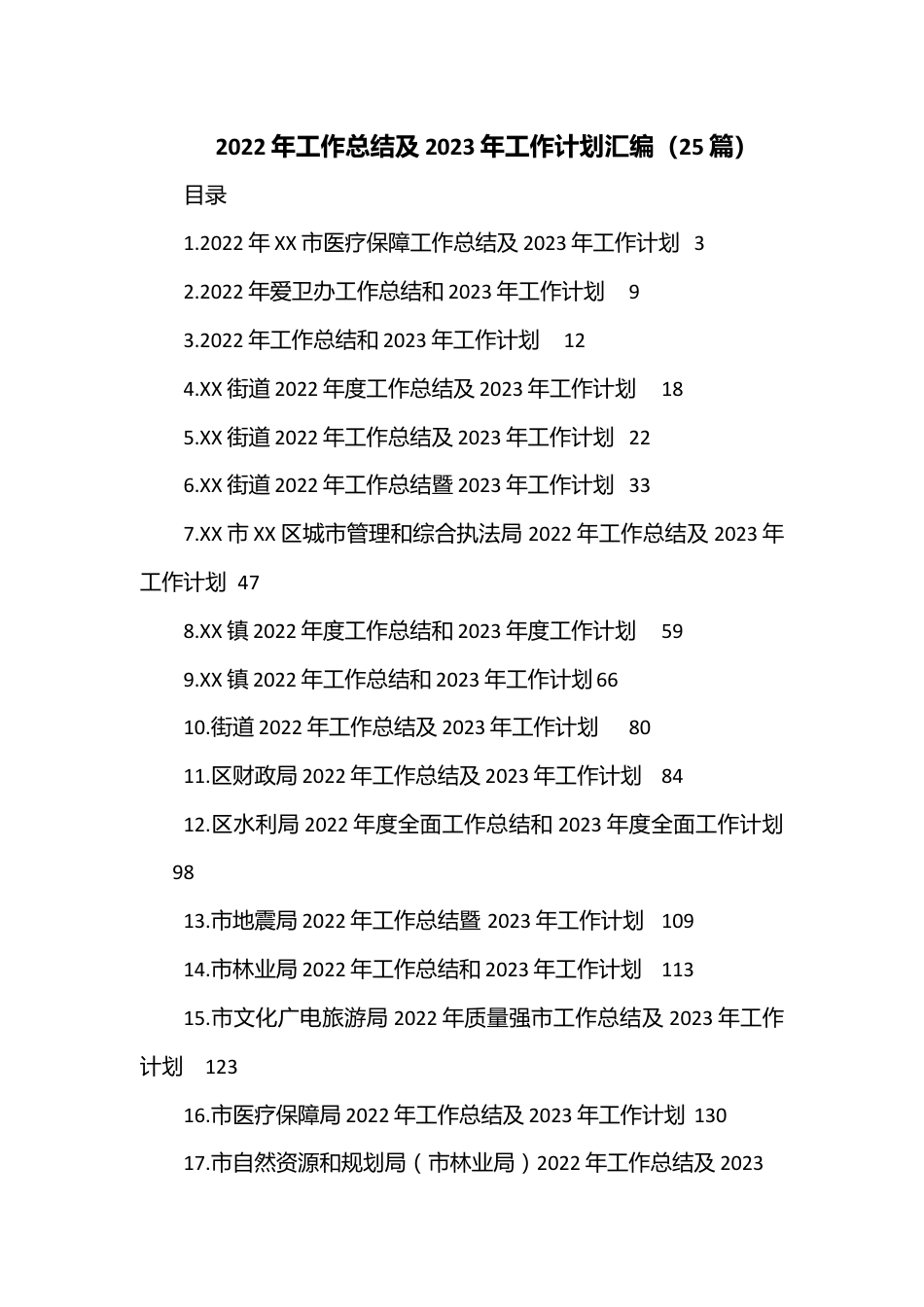 2022年工作总结及2023年工作计划汇编(25篇)目录1.2022年XX市医疗保障工作总结及2023年工作计划32.2022年爱卫办工作总结和2023年工作计划93.2022年工作总结和2023年工作计划124.XX街道2022年度工作总结及2023年工作计划185.XX街道2022年工作总结及2023年工作计划226.XX街道2022年工作总结暨2023年工作计划337.XX市XX区城市管理和综合执法局2022年工作总结及2023年工作计划478.XX镇2022年度工作总结和2023年度工作计划599.XX镇2022年工作总结和2023年工作计划6610.街道2022年工作总结及2023年工作计划8011.区财政局2022年工作总结及2023年工作计划8412.区水利局2022年度全面工作总结和2023年度全面工作计划9813.市地震局2022年工作总结暨2023年工作计划10914.市林业局2022年工作总结和2023年工作计划11315.市文化广电旅游局2022年质量强市工作总结及2023年工作计划12316.市医疗保障局2022年工作总结及2023年工作计划13017.市自然资源和规划局(市林业局)2022年工作总结及2023年工作计划14518.卫健体局2022年工作总结及2023年工作计划15419.县交通运输局2022年工作总结及2023年工作计划15920.县林业局2022年工作总结和2023工作计划17321.县民政局2022年工作总结及2023年工作计划17922.县水利局2022年工作总结及2023年工作计划18923.县退役军人事务局2022年工作总结和2023年工作计划19724.县文化旅游体育局2022年工作总结及2023年工作计划20425.镇人社所2022年工作总结及2023年工作计划2132022年XX市医疗保障工作总结及2023年工作计划2022年,在XX市委、市政府和省局的坚强领导下,我市医保部门坚持以习近平新时代中国特色社会主义思想为指导,认真落实全国、全省医疗保障工作会议精神,紧紧围绕医疗保障领域重点工作任务,统筹疫情防控和医保发展,深化“三医联动”,持续深化医保领域改革,各项工作稳中求进,为全方位保障XX高质量发展超越提供有力医疗保障服务。现将我市2022年医保工作总结及2023年工作计划报告如下:一、主要工作情况(一)压实全面从严治党主体责任。全市医保系统不断加强机关党的建设,切实推动全面从严治党工作向纵深发展。严格落实意识形态工作责任制,注重强基固本,推动党建业务不断融合。严肃党内政治生活,精细化推进廉政教育,常态化开展谈心谈话,长效化推动作风建设,持续正风肃纪,不断充盈清正廉洁的新风正气。坚守政治机关定位,聚焦主责主业,扎实推动全面从严治党各项工作取得新成效、开创新局面。同时,坚持全系统一盘棋意识,举全系统之力做好行风建设专项评价迎检工作,确保行风建设专项评价工作落细落实落到位。(二)稳步提升医疗保障水平。一是巩固基本医保参保覆盖面。全市基本医保参保人数达327.89万人,其中:职工医保参保49.78万人,城乡居民医保参保278.11万人。按常住人口计算,参保率达104.09%。截至第三季度,职工医保统筹基金收入11.60亿元,支出6.73亿元,当期结余4.87亿元;城乡居民医保基金收入22.69亿元,支出17.41亿元,当期结余约5.28亿元,全市医保基金整体运行平稳。二是扩大医保基金支付范围。将职工医保普通门诊费用纳入医保基金统筹,规范职工医保门诊特殊病种,提升职工医保基金使用质效。三是提高城乡居民医保待遇。提高县级、市级及市外定点医疗机构基本医保住院报销比例各5个百分点。四是落实省市为民办实事项目。将困难群众高血压、糖尿病特殊病种门诊指定用药报销比例提高到100%。(三)深化“药价保”集成改革。一是扎实推进医保支付方式改革。依托《DRG/DIP支付方式改革三年行动计划》,完善DIP付费改革核心要素管理,提前完成医疗机构、病种、统筹基金三个全覆盖(截至11月,覆盖率分别为100%、94%、91.3%),在提高医保基金使用效率,促进医疗机构健康发展,保障参保人员权益等方面取得了一定实效。二是建立医疗服务价格动态调整机制。自成立以来,我局在实行药品零差率销售价格平移的基础上,调整全市医疗服务价格8次,计1193项,通过医疗服务价格动态调整,促进医院收入结构优化。三是常态化落实药耗集采政策。落实国家、省组织集中带量采购中选药品、医用耗材。我市医疗机构共落实国家、省组织集中带量...