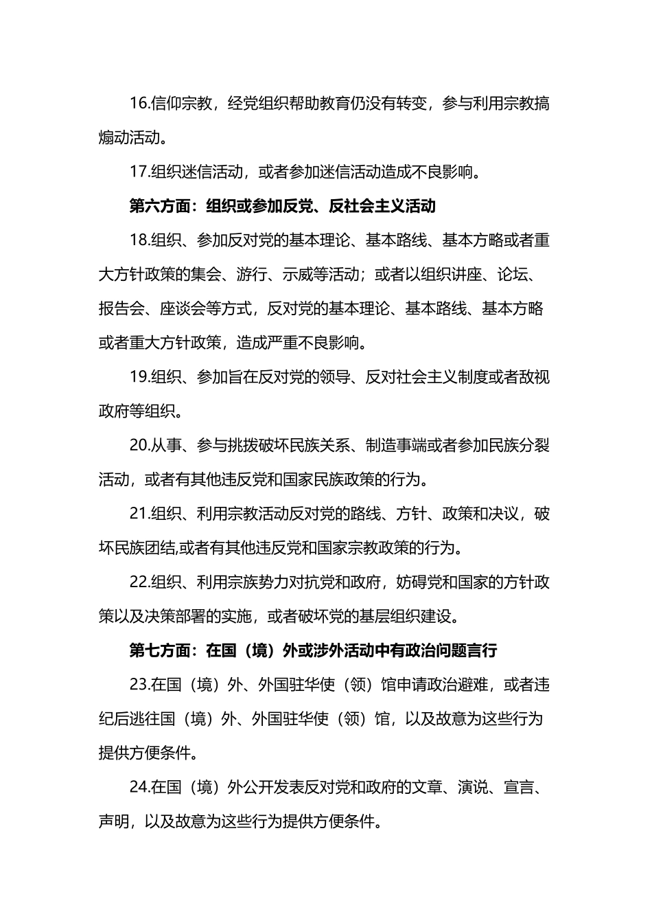 《中国共产党纪律处分条例》149条负面清单一、政治纪律负面清单:9个方面28条第一方面:“四个意识”不强、落实“两个维护”不到位1.在重大原则问题上不同党中央保持一致且有实际言论、行为或者造成不良后果。2.在党内组织秘密集团或者组织其他分裂党的活动,参加秘密集团或者参加其他分裂党的活动。3.党员领导干部在本人主政的地方或者分管的部门自行其是,搞山头主义,拒不执行党中央确定的大政方针,甚至背着党中央另搞一套。4.落实党中央决策部署不坚决,打折扣、搞变通,在政治上造成不良影响或者严重后果。5.擅自对应当由党中央决定的重大政策问题作出决定、对外发表主张。第二方面:发表、传播有严重政治问题的言论6.通过网络、广播、电视、报刊、传单、书籍等,或者利用讲座、论坛、报告会、座谈会等方式,公开发表坚持资产阶级自由化立场,反对、违背四项基本原则,反对、违背、歪曲党的改革开放决策或者其他有严重政治问题的文章、演说、宣言、声明等行为;妄议党中央大政方针,破坏党的集中统一;丑化党和国家形象,或者诋毁、诬蔑党和国家领导人、英雄模范,或者歪曲党的历史、中华人民共和国历史、人民军队历史,以及为这些行为提供方便条件。7.制作、贩卖、传播坚持资产阶级自由化立场、反对四项基本原则、反对改革开放决策、有严重政治问题的书刊、音像制品、电子读物、网络音视频资料等。8.私自携带、寄递坚持资产阶级自由化立场、反对四项基本原则、反对改革开放决策、有严重政治问题的资料入出境。第三方面:破坏党的团结统一9.在党内搞团团伙伙、结党营私、拉帮结派、培植个人势力等非组织活动,或者通过搞利益交换、为自己营造声势等活动捞取政治资本。10.制造、散布、传播政治谣言,破坏党的团结统一;政治品行恶劣,匿名诬告,有意陷害或者制造其他谣言,造成损害或者不良影响。第四方面:对组织不忠诚、不老实11.对党不忠诚不老实,表里不一,阳奉阴违,欺上瞒下,搞两面派,做两面人。12.不按照有关规定向组织请示、报告重大事项。13.干扰巡视巡察工作或者不落实巡视巡察整改要求。14.对抗组织审查,包括串供或者伪造、销毁、转移、隐匿证据,阻止他人揭发检举、提供证据材料,包庇同案人员,向组织提供虚假情况、掩盖事实等行为。第五方面:组织或参加宗教、迷信活动15.组织、参加会道门或者邪教组织。16.信仰宗教,经党组织帮助教育仍没有转变,参与利用宗教搞煽动活动。17.组织迷信活动,或者参加迷信活动造成不良影响。第六方面:组织或参加反党、反社会主义活动18.组织、参加反对党的基本理论、基本路线、基本方略或者重大方针政策的集会、游行、示威等活动;或者以组织讲座、论坛、报告会、座谈会等方式,反对党的基本理论、基本路线、基本方略或者重大方针政策,造成严重不良影响。19.组织、参加旨在反对党的领导、反对社会主义制度或者敌视政府等组织。20.从事、参与挑拨破坏民族关系、制造事端或者参加民族分裂活动,或者有其他违反党和国家民族政策的行为。21.组织、利用宗教活动反对党的路线、方针、政策和决议,破坏民族团结,或者有其他违反党和国家宗教政策的行为。22.组织、利用宗族势力对抗党和政府,妨碍党和国家的方针政策以及决策部署的实施,或者破坏党的基层组织建设。第七方面:在国(境)外或涉外活动中有政治问题言行23.在国(境)外、外国驻华使(领)馆申请政治避难,或者违纪后逃往国(境)外、外国驻华使(领)馆,以及故意为这些行为提供方便条件。24.在国(境)外公开发表反对党和政府的文章、演说、宣言、声明,以及故意为这些行为提供方便条件。25.在涉外活动中,其言行在政治上造成恶劣影响,损害党和国家尊严、利益。第八方面:履行全面从严治党“两个责任”失职失责26.不履行全面从严治党主体责任、监督责任或者履行全面从严治党主体责任、监督责任不力,给党组织造成严重损害或者严重不良影响。第九方面:违反党的政治规矩27.党员领导干部对违反政治纪律和政治规矩等错误思想和行为不报告、不抵制、不斗争,放任不管,搞无原则一团和气,造成不良影响。28.违反党的优良传统和工作惯例等党的规矩,在政治上造成不良影响...