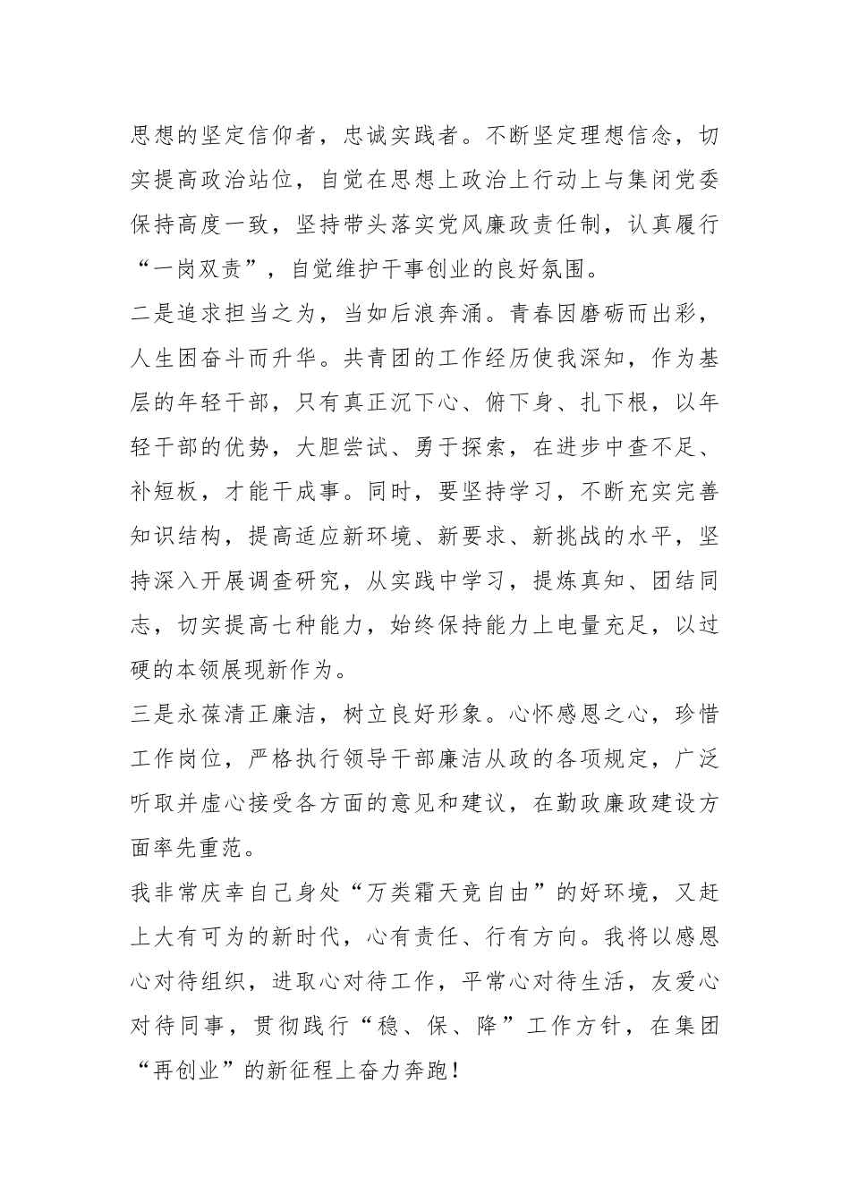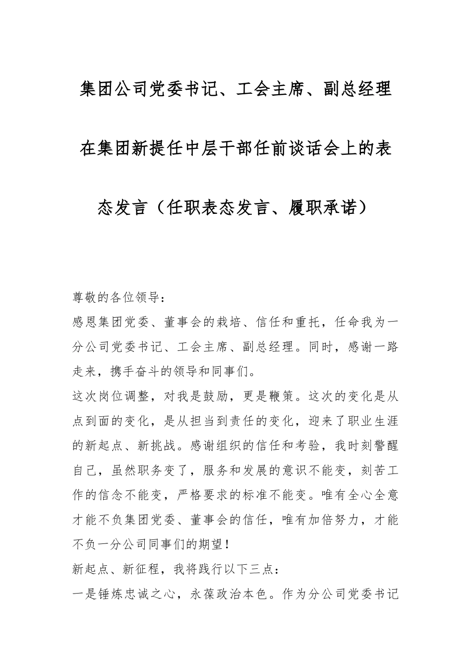 集团公司党委书记、工会主席、副总经理在集团新提任中层干部任前谈话会上的表态发言(任职表态发言、履职承诺)尊敬的各位领导:感恩集团党委、董事会的栽培、信任和重托,任命我为一分公司党委书记、工会主席、副总经理。同时,感谢一路走来,携手奋斗的领导和同事们。这次岗位调整,对我是鼓励,更是鞭策。这次的变化是从点到面的变化,是从担当到责任的变化,迎来了职业生涯的新起点、新挑战。感谢组织的信任和考验,我时刻警醒自己,虽然职务变了,服务和发展的意识不能变,刻苦工作的信念不能变,严格要求的标准不能变。唯有全心全意才能不负集团党委、董事会的信任,唯有加倍努力,才能不负一分公司同事们的期望!新起点、新征程,我将践行以下三点:一是锤炼忠诚之心,永葆政治本色。作为分公司党委书记工会主席,我一定做到上连党心、下连民心,不忘初心永远跟党走,做习近平新时代中国特色社会主义思想的坚定信仰者,忠诚实践者。不断坚定理想信念,切实提高政治站位,自觉在思想上政治上行动上与集闭党委保持高度一致,坚持带头落实党风廉政责任制,认真履行“一岗双责”,自觉维护干事创业的良好氛围。二是追求担当之为,当如后浪奔涌。青春因磨砺而出彩,人生困奋斗而升华。共青团的工作经历使我深知,作为基层的年轻干部,只有真正沉下心、俯下身、扎下根,以年轻干部的优势,大胆尝试、勇于探索,在进步中查不足、补短板,才能干成事。同时,要坚持学习,不断充实完善知识结构,提高适应新环境、新要求、新挑战的水平,坚持深入开展调查研究,从实践中学习,提炼真知、团结同志,切实提高七种能力,始终保持能力上电量充足,以过硬的本领展现新作为。三是永葆清正廉洁,树立良好形象。心怀感恩之心,珍惜工作岗位,严格执行领导干部廉洁从政的各项规定,广泛听取并虚心接受各方面的意见和建议,在勤政廉政建设方面率先重范。我非常庆幸自己身处“万类霜天竞自由”的好环境,又赶上大有可为的新时代,心有责任、行有方向。我将以感恩心对待组织,进取心对待工作,平常心对待生活,友爱心对待同事,贯彻践行“稳、保、降”工作方针,在集团“再创业”的新征程上奋力奔跑!免责声明:文稿来源网络整理,版权归原作者所有。若侵犯了您的合法权益,请作者持权属证明与本站联系,我们将及时更正、删除!谢谢!文稿发布平台:www.gongwentang.com(公文堂)