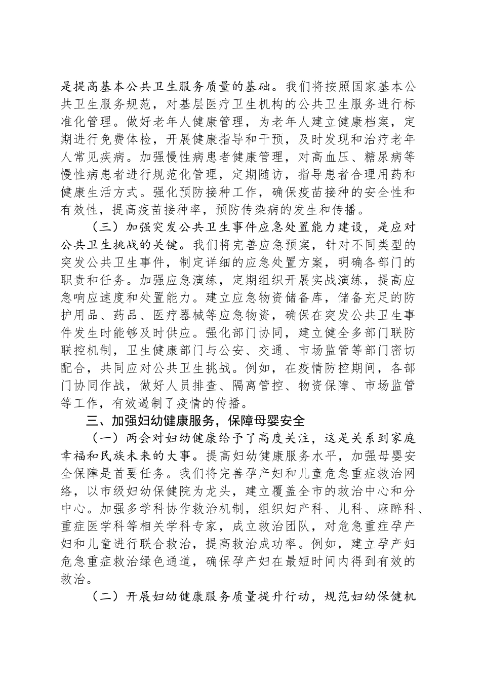 市卫健局党组书记学习2025年全国两会精神中心组研讨发言材料尊敬的各位领导、同志们:2025年全国两会在万众瞩目中胜利召开,这是在我国发展关键时期召开的重要会议,为我们各项工作指明了方向。两会期间,医疗卫生领域的相关政策和指示,体现了党和国家对人民健康的高度重视,也为我们卫健系统的工作提供了根本遵循。作为市卫健局党组书记,通过深入学习两会精神,结合我市卫生健康工作实际,我有以下几点深刻的体会和思考。一、优化医疗服务体系,提升医疗服务质量(一)全国两会高度关注医疗服务质量的提升,这是关乎人民群众切身利益的大事。推进分级诊疗制度建设是优化医疗服务体系的关键举措。我们将进一步加强医联体建设,以市级三甲医院为龙头,联合县级医院、基层医疗卫生机构,形成紧密型医联体。通过远程医疗,让市级专家能够实时为基层患者提供诊断和治疗建议,打破地域限制,使优质医疗资源能够惠及更多群众。例如,我们将建立远程会诊中心,配备先进的视频通讯设备和医疗信息系统,实现基层医疗机构与上级医院的互联互通。同时,安排市级专家定期到基层医疗机构坐诊,不仅能够直接为患者提供医疗服务,还能对基层医务人员进行传帮带,提升他们的诊疗能力。通过这些措施,引导患者合理就医,缓解大医院人满为患、基层医疗机构门可罗雀的不合理现象。(二)开展医疗服务质量提升行动,是保障患者安全、提高患者满意度的必然要求。我们将加强医疗质量安全管理,完善医疗质量控制体系。建立健全医疗质量管理制度,明确各级各类医疗机构的质量控制标准和规范。加强对医疗过程的全程监控,从门诊接诊、住院治疗到出院随访,每一个环节都严格把关。定期组织医疗质量检查和评估,对发现的问题及时整改,对存在严重医疗质量问题的医疗机构和医务人员进行严肃处理。规范医疗行为,加强对医务人员的培训和教育,提高他们的职业道德和业务水平,杜绝过度医疗、不合理用药等现象,减少医疗差错事故的发生。(三)优化就医流程,推进“互联网+医疗健康”服务,是提高就医效率、改善患者就医体验的重要手段。我们将大力开展线上预约挂号,患者可以通过手机APP、微信公众号等平台,提前预约心仪的专家和就诊时间,避免长时间排队等候。实现检查检验结果查询的信息化,患者在检查检验完成后,可以通过手机或医院自助查询设备,随时查看自己的检查检验报告,无需再到医院领取纸质报告。开展在线问诊服务,对于一些常见疾病和慢性病复诊,患者可以通过视频与医生进行沟通,医生根据患者的病情开具处方,药品可以通过快递直接送到患者家中。加强医疗机构信息化建设,实现医疗信息互联互通,不同医疗机构之间可以共享患者的病历、检查检验结果等信息,避免患者重复检查,提高医疗服务的协同性。二、强化公共卫生体系建设,筑牢健康防线(一)两会对公共卫生体系建设提出了明确要求,这是保障人民群众健康的重要防线。加强疾病预防控制机构能力建设,是提升公共卫生服务水平的核心。我们将加大对疾病预防控制机构的投入,优化实验室设备配置,引进先进的检测技术和设备,提高疾病监测预警、流行病学调查、检验检测等核心能力。例如,配备高通量基因测序仪、全自动生化分析仪等先进设备,能够快速准确地检测出各种病原体。加强专业人才培养,通过招聘高层次专业人才、选派人员到上级机构进修学习、开展内部培训等方式,提高疾病预防控制人员的业务素质和专业能力。(二)推进基层医疗卫生机构公共卫生服务标准化建设,是提高基本公共卫生服务质量的基础。我们将按照国家基本公共卫生服务规范,对基层医疗卫生机构的公共卫生服务进行标准化管理。做好老年人健康管理,为老年人建立健康档案,定期进行免费体检,开展健康指导和干预,及时发现和治疗老年人常见疾病。加强慢性病患者健康管理,对高血压、糖尿病等慢性病患者进行规范化管理,定期随访,指导患者合理用药和健康生活方式。强化预防接种工作,确保疫苗接种的安全性和有效性,提高疫苗接种率,预防传染病的发生和传播。(三)加强突发公共卫生事件应急处置能力建设,是应对公共卫生挑战的关键。我们将完善应急预案,针对不同类型的突...