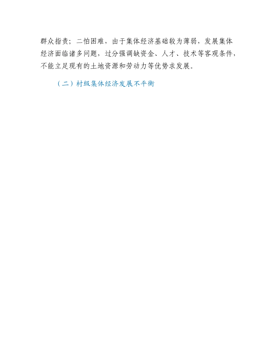 发展壮大新型农村集体经济调研报告党的XX大报告明确指出,发展新型农村集体经济。正确认识农村集体经济,推动新型农村集体经济发展壮大,不仅关系到农业农村经济发展,还关系到农村改革和乡村治理的成效。发展新型农村集体经济,目的是激活农村各类要素潜能,赋予农民更多财产权利,实现强村与富民相结合,盘活用好农村资源资产,补齐农村发展短板。本文以XX省XX市华龙区为例,分析了华龙区农村集体经济现状以及制约因素,提出了相关对策建议,以期为其他地区发展壮大新型农村集体经济提供借鉴。一、XX市华龙区农村集体经济现状华龙区地处XX省东北部,是XX市唯一市辖行政区,是XX市委、市政府和中原油田总部所在地,总面积119平方公里,耕地6.1万亩。辖1乡1镇9个街道办事处,59个行政村,既有城中村,又有城郊村,区情较为复杂。从2017年起,华龙区全面推行农村集体产权制度改革。近年来,每年对全区59个行政村进行资产核查,2022年共核查村集体经济组织总资产超过18亿元,其中集体经营性资产占总资产近两成。从集体经营性资产的存量来看,有集体经营性资产的村占近七成。从集体经营性收入(含经营收入、发包及上交收入、投资收益)状况来看,有集体经营性收入的村48个,无集体经营性收入的“空壳村”11个,“空壳”现象比较严重。从分红情况来看,2019年至今仅有8个村实现分红,分红比例偏低。从全区集体经营性资产的存量、集体经营性收入的状况以及分红情况来看,农村集体经济基础相对薄弱,产业可持续性、成长性欠缺,收益率偏低,分红较少。因此,发展壮大新型农村集体经济,增加农民收入,应作为华龙区全面推进乡村振兴的切入点。二、XX市华龙区农村集体经济发展壮大的制约因素(一)村级集体经济“造血”功能不足部分村干部缺乏经营意识,眼界不够开阔,思想较为保守,开拓创新精神不够,仅依靠房子、土地收租金,收入来源单一。多数村庄在集体经济发展上远期无规划、近期无项目,发展模式陈旧落后,一等二靠三要,一定程度上制约了村级集体经济的发展。一些村干部抓集体经济发展存在“两怕”:一怕担责任,创办经济实体有风险,怕给集体造成重大损失,遭群众指责;二怕困难,由于集体经济基础较为薄弱,发展集体经济面临诸多问题,过分强调缺资金、人才、技术等客观条件,不能立足现有的土地资源和劳动力等优势求发展。(二)村级集体经济发展不平衡城中村集体经济较为雄厚,发展较快,特别是二、三产业发展较好。如大庆路街道办事处赵村,抓住发展机遇,用足用活政策,大力发展村级集体经济。有些村由于地理位置偏僻、交通不便、信息闭塞等,既无集体经营性资产,也无自然资源优势,集体经济基础相对薄弱。如岳村镇牛村、韩庄,孟轲乡李家村等,既没有集体经营性资产,也没有集体经营性收入。(三)村集体公益性、福利性支出较大有集体经营性收入的村,多承担着群众用水用电、村内打扫卫生人员工资、垃圾清运、公共设施维护等支出。除此之外,还为村民缴纳社保费、发放节庆实物福利等,村内开支普遍较大,甚至有些村集体经营性收入不够支付村内支出。(四)村级集体经济基础相对薄弱二轮土地延包后,土地基本承包给农户,多数村除宅基地,几乎没有可开发利用的集体建设土地。从目前村集体资产状况看,主要是历年固定资产的积累,而固定资产大部分是非经营性资产,如村委会设施、水利设施、学校等,难以形成可用于经营的资本。另外,一些固定资产长期闲置,没有合理开发利用,造成固定资产破损和浪费严重。(五)村级集体经济发展专项资金缺乏现阶段,多数村除了保障正常办公基本开支的财政转移支付资金,没有发展集体经济的专项资金。近几年,政府在农村实施的基础性公益项目较多,用于发展集体经济的经营性项目较少;金融部门对村集体经济组织贷款顾虑较多,不愿放贷。村集体经济组织发展集体经济缺少启动资金,即使有好的项目也缺少本钱。(六)土地性质与规划不符多数村的发展规划和土地密切相关,而土地性质与建设项目不完全匹配。有些村的集体土地为耕地性质,而城中村和城郊村的集体土地基本纳入了市政规划,即使闲置也不能开发利用。另外,涉及城中村改造、棚户区改...