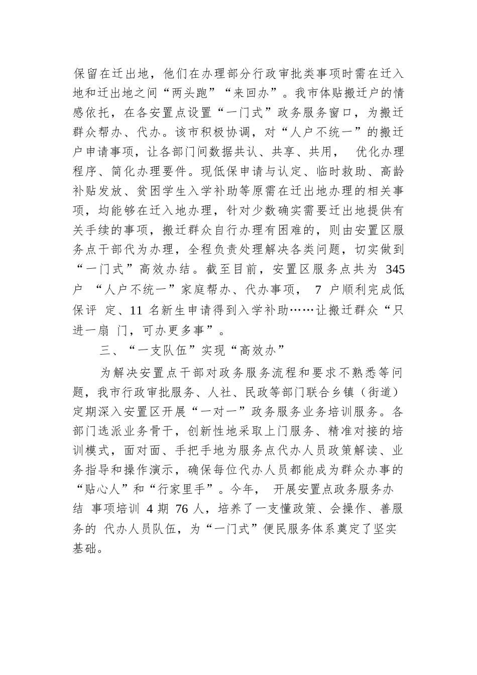 在便民服务易地搬迁群众推进会上的交流发言为落实易地扶贫搬迁群众,尤其是由农村迁入城市集中安置群众的公共教育、医疗卫生、社会保障等权益,向其提供高效便捷政务服务,我市建立“三个一”便民服务机制,对搬迁群众诉求事事有回应,件件有着落,让他们更好融入新环境,享受幸福新生活。一、“一张清单”说清“怎么办”针对行政审批事项内容繁琐等问题,我市多次组织相关职能部门深入乾州街道吉庄社区安置点、峒河街道水畔铭城小区安置点,对群众办理需求大、使用频率高的政务服务事项进行调研,由市行政审批服务局牵头将涉及民政、人社、医保、卫健、教体、公安、残联、退役军人等部门的34项行政审批类事项分类梳理,制定出《市易地搬迁安置点政务服务事项目录清单》,明确均可由搬入地社区(村)及街道统一承办,列出事项办理方式、办理机构(地址)、责任单位、办理时间、咨询电话等。同时在安置点醒目位置摆放清单宣传广告、张贴宣传单,开展政策宣传讲座等,让安置区服务点及社区熟悉掌握办理流程。通过“一张清单”有效解决搬迁群众不知“事在哪办、找谁办、怎么办”的困扰。二、“—门服务”解决“来回办”出于对老家土地的依恋,搬迁入城的大多数家庭把户籍保留在迁出地,他们在办理部分行政审批类事项时需在迁入地和迁出地之间“两头跑”“来回办”。我市体贴搬迁户的情感依托,在各安置点设置“一门式”政务服务窗口,为搬迁群众帮办、代办。该市积极协调,对“人户不统一”的搬迁户申请事项,让各部门间数据共认、共享、共用,优化办理程序、简化办理要件。现低保申请与认定、临时救助、高龄补贴发放、贫困学生入学补助等原需在迁出地办理的相关事项,均能够在迁入地办理,针对少数确实需要迁出地提供有关手续的事项,搬迁群众自行办理有困难的,则由安置区服务点干部代为办理,全程负责处理解决各类问题,切实做到“一门式”高效办结。截至目前,安置区服务点共为345户“人户不统一”家庭帮办、代办事项,7户顺利完成低保评定、11名新生申请得到入学补助……让搬迁群众“只进一扇门,可办更多事”。三、“一支队伍”实现“高效办”为解决安置点干部对政务服务流程和要求不熟悉等问题,我市行政审批服务、人社、民政等部门联合乡镇(街道)定期深入安置区开展“一对一”政务服务业务培训服务。各部门选派业务骨干,创新性地采取上门服务、精准对接的培训模式,面对面、手把手地为服务点代办人员政策解读、业务指导和操作演示,确保每位代办人员都能成为群众办事的“贴心人”和“行家里手”。今年,开展安置点政务服务办结事项培训4期76人,培养了一支懂政策、会操作、善服务的代办人员队伍,为“一门式”便民服务体系奠定了坚实基础。