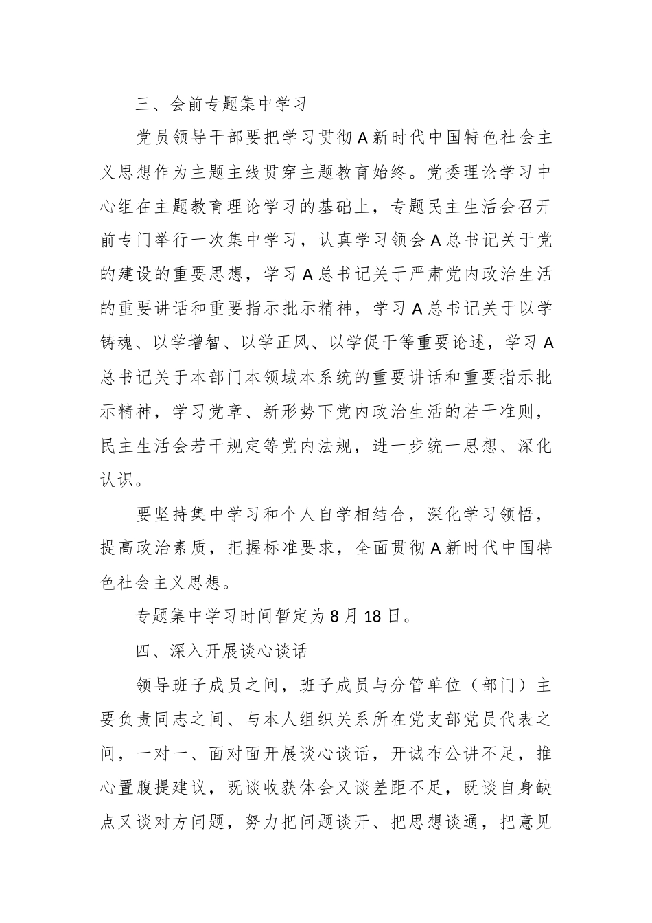 某国企党委在2023年主题教育专题民主生活会方案根据XX党委《关于转发〈中共中央纪委机关中共中央组织部中央学习贯彻A新时代中国特色社会主义思想主题教育领导小组关于在学习贯彻A新时代中国特色社会主义思想主题教育中开好专题民主生活会的通知〉的通知》有关要求,制定如下实施方案。一、会议主题紧紧围绕学习贯彻A新时代中国特色社会主义思想主题召开专题民主生活会,聚焦学思想、强党性、重实践、建新功总要求,对照凝心铸魂筑牢根本、锤炼品格强化忠诚、实干担当促进发展、践行宗旨为民造福、廉洁奉公树立新风的具体目标,深入学习领悟以学铸魂、以学增智、以学正风、以学促干的丰富内涵和实践要求,检视问题、深刻剖析,着力从思想根源上解决问题。要精准把握发扬党内民主、加强党内监督、依靠领导班子自身力量解决矛盾和问题的功能定位,检视差距不足,进行党性分析,开展批评和自我批评,抓好问题整改,推动全党进一步统一思想、统一意志、统一行动,坚定拥护“两个确立”,坚决做到“两个维护”。二、会议时间拟于2023年8月21日召开。三、会前专题集中学习党员领导干部要把学习贯彻A新时代中国特色社会主义思想作为主题主线贯穿主题教育始终。党委理论学习中心组在主题教育理论学习的基础上,专题民主生活会召开前专门举行一次集中学习,认真学习领会A总书记关于党的建设的重要思想,学习A总书记关于严肃党内政治生活的重要讲话和重要指示批示精神,学习A总书记关于以学铸魂、以学增智、以学正风、以学促干等重要论述,学习A总书记关于本部门本领域本系统的重要讲话和重要指示批示精神,学习党章、新形势下党内政治生活的若干准则,民主生活会若干规定等党内法规,进一步统一思想、深化认识。要坚持集中学习和个人自学相结合,深化学习领悟,提高政治素质,把握标准要求,全面贯彻A新时代中国特色社会主义思想。专题集中学习时间暂定为8月18日。四、深入开展谈心谈话领导班子成员之间,班子成员与分管单位(部门)主要负责同志之间、与本人组织关系所在党支部党员代表之间,一对一、面对面开展谈心谈话,开诚布公讲不足,推心置腹提建议,既谈收获体会又谈差距不足,既谈自身缺点又谈对方问题,努力把问题谈开、把思想谈通,把意见谈实、把改进方向谈明白,消除隔阂、加深了解、增进信任。谈心谈话贵在一个“诚”字,要谈到位、真交心,防止泛泛而谈,防止只谈工作不触及思想,防止把谈心谈话变成简单交换会上批评意见。XX第五巡回指导组将与公司领导班子成员逐一谈话,传达上级要求,交流学习体会,提出意见建议。谈话时间初步计划8月21日上午。五、全面梳理存在问题这次专题民主生活会会前,原则上可不再专门征求意见。领导班子和党员领导干部要对照《意见》明确的理论学习、政治素质、能力本领、担当作为、工作作风、廉洁自律等6个方面突出问题,特别是对照A总书记关于以学铸魂、以学增智、以学正风、以学促干的12条具体要求,把自己摆进去、把职责摆进去把工作摆进去,深挖问题症结深刻进行党性分析,找准思想根源,有针对性地提出改进措施。要全面梳理认真盘点主题教育调查研究、整改整治问题清单,把清单中尚未销号的问题,与上一年度民主生活会、巡视巡察整改和审计整改等专题民主生活会尚未完成整改的问题,谈心谈话过程中提出的问题,一并作为这次专题民主生活会检视整改的问题。六、结合典型案例进行剖析领导班子要结合典型案例的解剖式调研中确定的至少1个反面案例,特别是公共安全事件、群体性事件、网络舆情事件等,举一反三进行剖析。选定的反面典型案例将报指导组同意。班子成员要围绕案例,联系个人思想学习和工作实际,深刻查摆自身存在的差距不足,关键是要见人见事见思想,注重从主观上思想上进行深刻检视,深挖思想根源,不能轻描淡写、隔靴搔痒,不能停留在表面、归结于客观。典型案例剖析的内容要在班子的对照检查材料和班子成员的个人发言提纲中单列一块进行阐述。在全面梳理问题和结合典型案例剖析的基础上,领导班子主要负责同志主持起草班子对照检查材料。班子成员自己动手撰写个人发言提纲,并报主要负责同志审阅把关班子对照检查材料和个人发...
