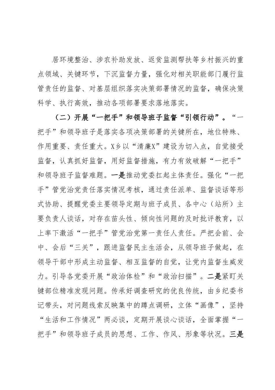 X乡关于持续深入推进“清廉X”建设十大行动工作情况报告一、工作开展情况(一)扎实开展政治监督“护航行动”。X乡始终聚焦贯彻落实习近平总书记重要讲话特别是对云南工作重要指示批示精神、党中央决策部署强化政治监督,严格按照“清廉X”建设要求,开展整治监督,为X乡乡村振兴保驾护航。一是强化政治监督,坚决站稳群众立场。乡纪委准确把握新时代对纪检监察工作的新要求始终站稳以人民为中心的根本政治立场,秉持“只要是老百姓的事,再小的事都是大事”的信念,把让老百姓过上好日子作为纪检工作的出发点和落脚点,将思想根植于群众之中,深刻认识实施乡村振兴战略的特殊意义,牢记纪检监察机关的职责使命,把专责监督践行到乡村振兴战线最前沿。二是强化政治监督,持续净化政治生态。乡纪委坚决扛起全面从严治党政治责任,充分利用乡、村两级纵向贯通、横向协同的基层纪检监察监督网络,督促各级党组织和党员领导干部坚决做到“两个维护”。要严肃查处工作中存在的“不作为、慢作为、乱作为”等形式主义、官僚主义及群众身边的微腐败问题,以强有力的监督执纪问责推动基层党员干部行权规范、纪律严明、作风正派、积极作为,为全面推进乡村振兴提供坚实纪律保障。三是强化政治监督,聚力聚焦工作重点。“党中央重大决策部署到哪里,监督检查就跟进到哪里”。乡纪委聚焦基层卫生体系建设、项目工程建设、人居环境整治、涉农补助发放、返贫监测帮扶等乡村振兴的重点领域、关键环节,下沉监督力量,强化对相关职能部门履行监管责任的监督、对基层组织落实决策部署情况的监督,确保决策科学、执行高效,推动各项部署要求落地落实。(二)开展“一把手”和领导班子监督“引领行动”。“一把手”和领导班子是落实各项决策部署的关键所在,地位特殊、作用重要、责任重大。X乡以“清廉X”建设为切入点,自觉接受监督,认真抓好监督,用好监督措施,有力有效破解“一把手”和领导班子监督难题。一是推动党委扛起主体责任。强化“一把手”管党治党责任落实情况考核,通过责任派单、监督谈话等形式协助、提醒党委主要领导定期与班子成员、各中心(站所)主要负责人谈话,对存在苗头性、倾向性问题的及时批评教育,以上率下激活“一把手”管党治党第一责任人责任。严把会前、会中、会后“三关”,跟进监督民主生活会,从领导班子做起,在领导干部中形成主动监督、相互监督的自觉,让党内监督生威发力。引导各党委开展“政治体检”和“政治扫描”。二是紧盯关键部位精准发现问题。传承好调查研究的优良传统,由乡纪委书记带头,对问题线索反映集中的蹲点调研,立体“画像”,坚持“生活和工作情况”两必谈,定期开展谈心谈话,全面掌握“一把手”和领导班子成员的思想、工作、作风、形象等状况。三是畅通协调机制拓宽监督渠道。加强上下联动,发现同级“一把手”和领导班子落实主体责任、执行民主集中制、廉洁自律等重大问题时,主动向上级纪委报告。通过民主监督、社会监督、群众监督等机制,进一步扩大社会各界参与党内监督的范围和途径提升精准发现和处置问题、遏制“八小时以外”乱象的能力和水平。四是用好案例资源强化治本效能。剖析近年来领导干部,特别是单位“一把手”违纪违法典型案例,通过警示教育、家庭助廉等形式,筑牢领导干部拒腐防变思想防线。(三)积极开展以“小”见严纠“四风”“固堤行动”。今年以来,X乡纪委监委深化落实以“小”见严纠“四风”,坚持聚焦小切口,做实监督大文章,围绕党的XX大对锲而不舍落实中央八项规定精神作出的部署,在纠“四风”树新风上驰而不息、久久为功,深入推进“固堤行动”,不断释放严的信号、巩固严的氛围。一是加强廉政教育。围绕“重点问题表现清单“开展廉政教育,引导广大党员干部树立法纪观念和廉洁从政意识,使廉洁从政意识入耳、入脑、入心,将厉行勤俭节约、反对铺张浪费变成自觉行动,进一步提高全体党员干部思想政治觉悟和拒腐防变能力,筑牢廉政意识。二是突出抓好关键环节。坚决刹住各种不正之风,聚焦违规收送“小礼品”、“小红包”等行为,每到节前都开展廉政提醒谈话。严格执行公车使用规定,严禁用公车接送子女、...