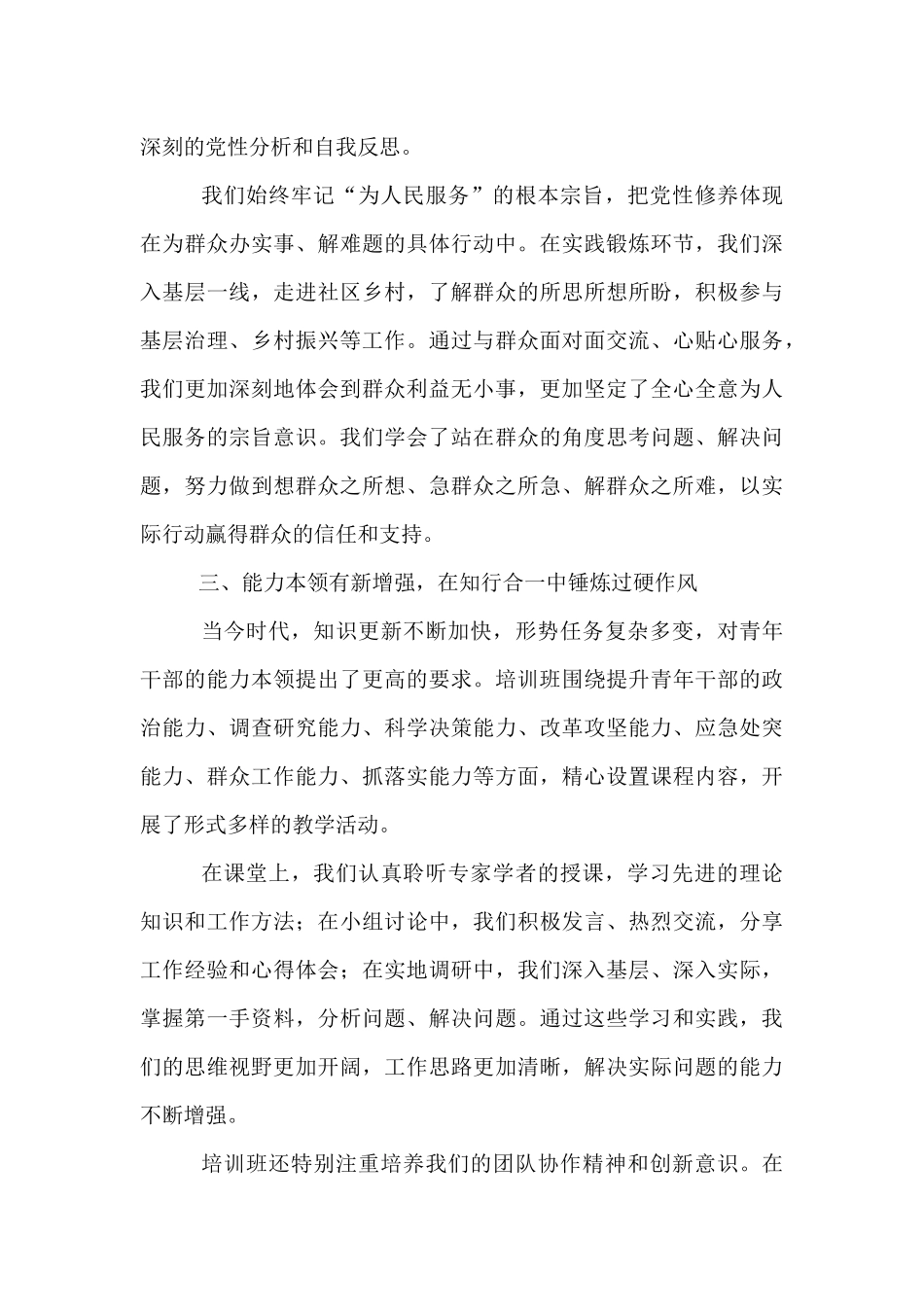 在青年干部培训班上的发言尊敬的各位领导、亲爱的老师、学员们:大家好!非常荣幸能够作为优秀学员代表在这里发言。首先,请允许我代表全体学员,向为我们精心搭建学习平台的各级领导、悉心教导我们的各位老师,以及在学习生活中相互帮助的同学们,表示最衷心的感谢!时光荏苒,为期*个月的青年干部培训班即将画上圆满的句号。这段充实而难忘的学习时光,是我们人生道路上一次重要的成长与蜕变。在这里,我们聆听了专家学者的精彩授课,感受了革命先辈的崇高精神,经历了实践锻炼的磨砺考验,收获了知识、友谊和力量。接下来,我将结合自身学习体会,向大家汇报三个方面的感悟。一、理论学习有新高度,在学思践悟中坚定理想信念理论是行动的先导,思想是前进的旗帜。此次培训班为我们提供了系统学习党的创新理论的宝贵机会。我们深入学习了习近平新时代中国特色社会主义思想,全面领会其核心要义、精神实质、丰富内涵和实践要求。通过原原本本读原著、学原文、悟原理,我们深刻认识到这一伟大思想是当代中国马克思主义、二十一世纪马克思主义,是中华文化和中国精神的时代精华,实现了马克思主义中国化时代化新的飞跃。在学习党的历史专题课程时,我们沿着历史的脉络,重温了中国共产党百年奋斗的光辉历程。从南湖红船的开天辟地,到新中国成立的改天换地,从改革开放的翻天覆地,到新时代取得的历史性成就、发生的历史性变革,我们深刻体会到中国共产党为什么能、马克思主义为什么行、中国特色社会主义为什么好。每一段历史、每一个故事,都让我们更加坚定了对马克思主义的信仰、对共产主义和中国特色社会主义的信念,更加深刻地认识到“两个确立”的决定性意义,进一步增强了“四个意识”、坚定了“四个自信”、做到了“两个维护”。理论的价值在于指导实践。我们将所学理论与实际工作相结合,积极开展交流研讨、撰写学习心得,努力做到学思用贯通、知信行统一。通过学习,我们更加明确了青年干部的使命担当,那就是要以习近平新时代中国特色社会主义思想为指引,在新时代新征程上找准定位、勇挑重担,为党和人民的事业不懈奋斗。二、党性修养有新提升,在对标对表中坚守初心使命党性是党员干部立身、立业、立言、立德的基石。培训班始终把党性教育作为重点内容,通过专题讲座、现场教学、党性分析等多种形式,引导我们加强党性锻炼、提高党性修养。在现场教学中,我们走进革命纪念馆、烈士陵园,面对珍贵的历史文物、感人的革命事迹,仿佛回到了那个战火纷飞、激情燃烧的年代。我们深刻感受到革命先辈们为了民族独立、人民解放,不惜抛头颅、洒热血的崇高精神和坚定信念。他们用生命诠释了共产党人的初心和使命,为我们树立了光辉的榜样。在与先辈们的“对话”中,我们对照自身思想和行为,深入查找差距不足,进行深刻的党性分析和自我反思。我们始终牢记“为人民服务”的根本宗旨,把党性修养体现在为群众办实事、解难题的具体行动中。在实践锻炼环节,我们深入基层一线,走进社区乡村,了解群众的所思所想所盼,积极参与基层治理、乡村振兴等工作。通过与群众面对面交流、心贴心服务,我们更加深刻地体会到群众利益无小事,更加坚定了全心全意为人民服务的宗旨意识。我们学会了站在群众的角度思考问题、解决问题,努力做到想群众之所想、急群众之所急、解群众之所难,以实际行动赢得群众的信任和支持。三、能力本领有新增强,在知行合一中锤炼过硬作风当今时代,知识更新不断加快,形势任务复杂多变,对青年干部的能力本领提出了更高的要求。培训班围绕提升青年干部的政治能力、调查研究能力、科学决策能力、改革攻坚能力、应急处突能力、群众工作能力、抓落实能力等方面,精心设置课程内容,开展了形式多样的教学活动。在课堂上,我们认真聆听专家学者的授课,学习先进的理论知识和工作方法;在小组讨论中,我们积极发言、热烈交流,分享工作经验和心得体会;在实地调研中,我们深入基层、深入实际,掌握第一手资料,分析问题、解决问题。通过这些学习和实践,我们的思维视野更加开阔,工作思路更加清晰,解决实际问题的能力不断增强。培训班还特别注重培养我们的团队协作精...
