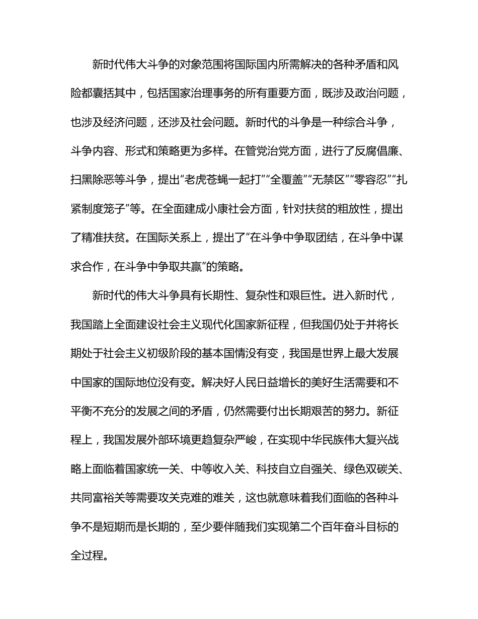 专题党课提纲:坚持敢于斗争走好新的赶考之路同志们:党的十八大以来,以习近平同志为核心的党中央从实现中华民族伟大复兴的战略高度,反复强调要“进行具有许多新的历史特点的伟大斗争”,并对增强斗争精神、提高斗争本领提出了许多具体要求。党的十九届六中全会审议通过的《中共中央关于党的百年奋斗重大成就和历史经验的决议》指出,“敢于斗争、敢于胜利,是党和人民不可战胜的强大精神力量”,并将“坚持敢于斗争”作为中国共产党百年奋斗的历史经验之一。在新时代新征程上,准确把握“坚持敢于斗争”具有十分重要的意义。下面,我从以下几个方面与大家共同学习交流。一、要准确把握新时代斗争精神的新内涵在党的十九大报告中,习近平总书记用“四个伟大”来阐述新时代中国共产党的历史使命。伟大梦想就是“中华民族伟大复兴的中国梦”,实现这一梦想,不是一蹴而就、轻松可得的。因此,习近平总书记指出,实现伟大梦想,必须进行伟大斗争。社会是在矛盾运动中前进的,有矛盾就会有斗争。我们党要团结带领人民有效应对重大挑战、抵御重大风险、克服重大阻力、解决重大矛盾,必须进行具有许多新的历史特点的伟大斗争,任何贪图享受、消极懈怠、回避矛盾的思想和行为都是错误的。新时代党开展斗争的具体方向体现在党的十九大报告中总结的“五个坚决”:一是坚决反对一切削弱、歪曲、否定党的领导和我国社会主义制度的言行;二是坚决反对一切损害人民利益、脱离群众的行为;三是坚决破除一切顽瘴痼疾;四是坚决反对一切分裂祖国、破坏民族团结和社会和谐稳定的行为;五是坚决战胜一切在政治、经济、文化、社会等领域和自然界出现的困难和挑战。新时代伟大斗争的对象范围将国际国内所需解决的各种矛盾和风险都囊括其中,包括国家治理事务的所有重要方面,既涉及政治问题,也涉及经济问题,还涉及社会问题。新时代的斗争是一种综合斗争,斗争内容、形式和策略更为多样。在管党治党方面,进行了反腐倡廉、扫黑除恶等斗争,提出“老虎苍蝇一起打”“全覆盖”“无禁区”“零容忍”“扎紧制度笼子”等。在全面建成小康社会方面,针对扶贫的粗放性,提出了精准扶贫。在国际关系上,提出了“在斗争中争取团结,在斗争中谋求合作,在斗争中争取共赢”的策略。新时代的伟大斗争具有长期性、复杂性和艰巨性。进入新时代,我国踏上全面建设社会主义现代化国家新征程,但我国仍处于并将长期处于社会主义初级阶段的基本国情没有变,我国是世界上最大发展中国家的国际地位没有变。解决好人民日益增长的美好生活需要和不平衡不充分的发展之间的矛盾,仍然需要付出长期艰苦的努力。新征程上,我国发展外部环境更趋复杂严峻,在实现中华民族伟大复兴战略上面临着国家统一关、中等收入关、科技自立自强关、绿色双碳关、共同富裕关等需要攻关克难的难关,这也就意味着我们面临的各种斗争不是短期而是长期的,至少要伴随我们实现第二个百年奋斗目标的全过程。二、要准确把握新时代坚持敢于斗争的客观要求(一)坚持敢于斗争是无产阶级政党与生俱来的精神特质。马克思指出:“辩证法不崇拜任何东西,按其本质来说,它是批判的和革命的。”从轰轰烈烈的巴黎公社运动到俄国十月革命,从中国共产党的创立到如今的大国屹立,在每一次的斗争中都彰显着马克思主义政党一以贯之的批判性、承袭性和创新性,都体现出无产阶级政党为追求共产主义远大理想所具有宏大格局和英勇奋斗的斗争精神。百余年来,中国共产党在革命、建设和改革中所体现出的斗争精神的实质是对马克思主义理论的继承发展,是以马克思主义的批判性与革命性为根本内核的精神系统。中国共产党在马克思主义的指导下,在共产党执政规律、社会主义建设规律以及人类社会发展规律的指引下,带领全体人民在追求美好幸福生活的过程中以足履实地的实践证明:敢于斗争、敢于胜利,是中国共产党不可战胜的强大精神力量。(二)坚持敢于斗争是对世界斗争新形势的科学判断与准确把握。习近平总书记指出:“当前,世界百年未有之大变局加速演进,中华民族伟大复兴进入关键时期,我们面临的风险挑战明显增多,总想过太平日子、不想斗争是不切实际的。”我国已进...