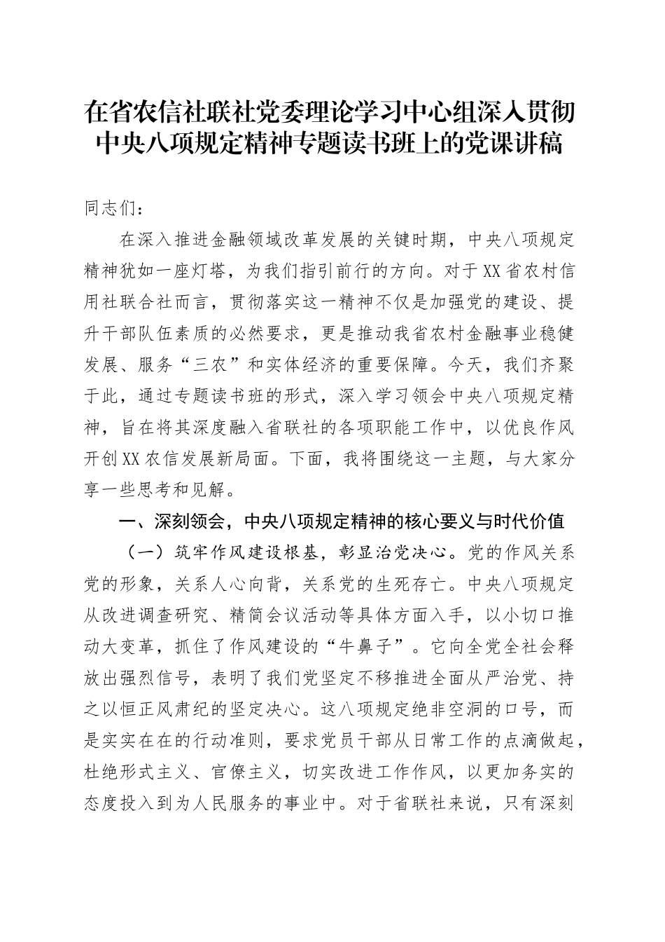 在省农信社联社党委理论学习中心组深入贯彻xxx精神专题读书班上的党课讲稿同志们:在深入推进金融领域改革发展的关键时期,xxx精神犹如一座灯塔,为我们指引前行的方向。对于XX省农村信用社联合社而言,贯彻落实这一精神不仅是加强党的建设、提升干部队伍素质的必然要求,更是推动我省农村金融事业稳健发展、服务“三农”和实体经济的重要保障。今天,我们齐聚于此,通过专题读书班的形式,深入学习领会xxx精神,旨在将其深度融入省联社的各项职能工作中,以优良作风开创XX农信发展新局面。下面,我将围绕这一主题,与大家分享一些思考和见解。一、深刻领会,xxx精神的核心要义与时代价值(一)筑牢作风建设根基,彰显治党决心。党的作风关系党的形象,关系人心向背,关系党的生死存亡。xxx从改进调查研究、精简会议活动等具体方面入手,以小切口推动大变革,抓住了作风建设的“牛鼻子”。它向全党全社会释放出强烈信号,表明了我们党坚定不移推进全面从严治党、持之以恒正风肃纪的坚定决心。这八项规定绝非空洞的口号,而是实实在在的行动准则,要求党员干部从日常工作的点滴做起,杜绝形式主义、官僚主义,切实改进工作作风,以更加务实的态度投入到为人民服务的事业中。对于省联社来说,只有深刻领悟这一精神,才能在工作中树立正确导向,营造风清气正的良好氛围,为履行各项职能奠定坚实基础。(二)顺应人民群众期盼,践行初心使命。全心全意为人民服务是我们党的根本宗旨,xxx的出台正是对这一宗旨的生动践行。长期以来,一些不良作风问题严重损害了党在人民群众心中的形象,疏远了党群干群关系。八项规定着力解决人民群众反映强烈的突出问题,如整治公款吃喝、铺张浪费等现象,让人民群众切实感受到了党的作风转变带来的实惠。在省联社的工作中,我们肩负着服务“三农”和地方经济发展的重任,更应时刻牢记初心使命,以xxx精神为指引,深入基层、贴近群众,了解农民、农村企业的金融需求,为他们提供优质、高效、便捷的金融服务,以实际行动回应人民群众对美好生活的向往和对金融服务的期盼。(三)护航事业长远发展,激发奋进动力。在当前复杂多变的经济金融形势下,XX省农村信用社联合社面临着诸多机遇与挑战。xxx精神为我们应对挑战、把握机遇提供了有力保障。一方面,良好的作风能够提升工作效率,增强团队凝聚力和执行力,使省联社在落实支农工作、协调资金融通、推动电子化建设等各项职能时更加顺畅高效。另一方面,严守八项规定有助于树立省联社的良好形象,赢得社会各界的信任和支持,为业务拓展和创新发展创造有利条件。它激励着全体干部职工以更加饱满的热情、昂扬的斗志投身于农村金融事业,汇聚起推动XX农信高质量发展的强大动力,助力我们在新时代的征程中不断迈出坚实步伐。二、对标自省,省联社在贯彻八项规定精神中的差距与不足(一)调查研究方面:深度广度待拓展,成果转化有差距一是调研覆盖局限。在开展关于农村信用社支农工作落实情况的调研时,部分人员仅集中于经济发展较好、交通便利的乡镇,对偏远山区及经济相对落后地区的关注不足,导致调研结果无法全面反映全省农村金融需求的真实状况,难以制定出更具针对性和普适性的支农政策。二是调研方法单一。多依赖听取汇报、召开座谈会等传统形式,实地走访、蹲点调研较少。在了解社员社业务经营情况时,不能深入一线掌握第一手资料,对实际操作中存在的问题发现不及时、不精准,影响了对业务指导的有效性。三是成果转化滞后。虽进行了大量调研,但对调研成果的分析、提炼和转化工作重视不够。如在电子化建设调研中提出的一些优化建议,未能及时转化为具体的实施方案和行动,导致调研成果束之高阁,未能充分发挥对工作的推动作用。(二)会议活动方面:精简程度需提升,实效导向应强化一是会议数量偏多。各类工作会议、培训会议安排频繁,部分会议内容重复,参会人员疲于应付,不仅浪费了大量时间和精力,也增加了基层行社的负担,影响了实际工作的开展进度。二是会议质量不高。部分会议准备不充分,议题不明确,讨论不深入,...
