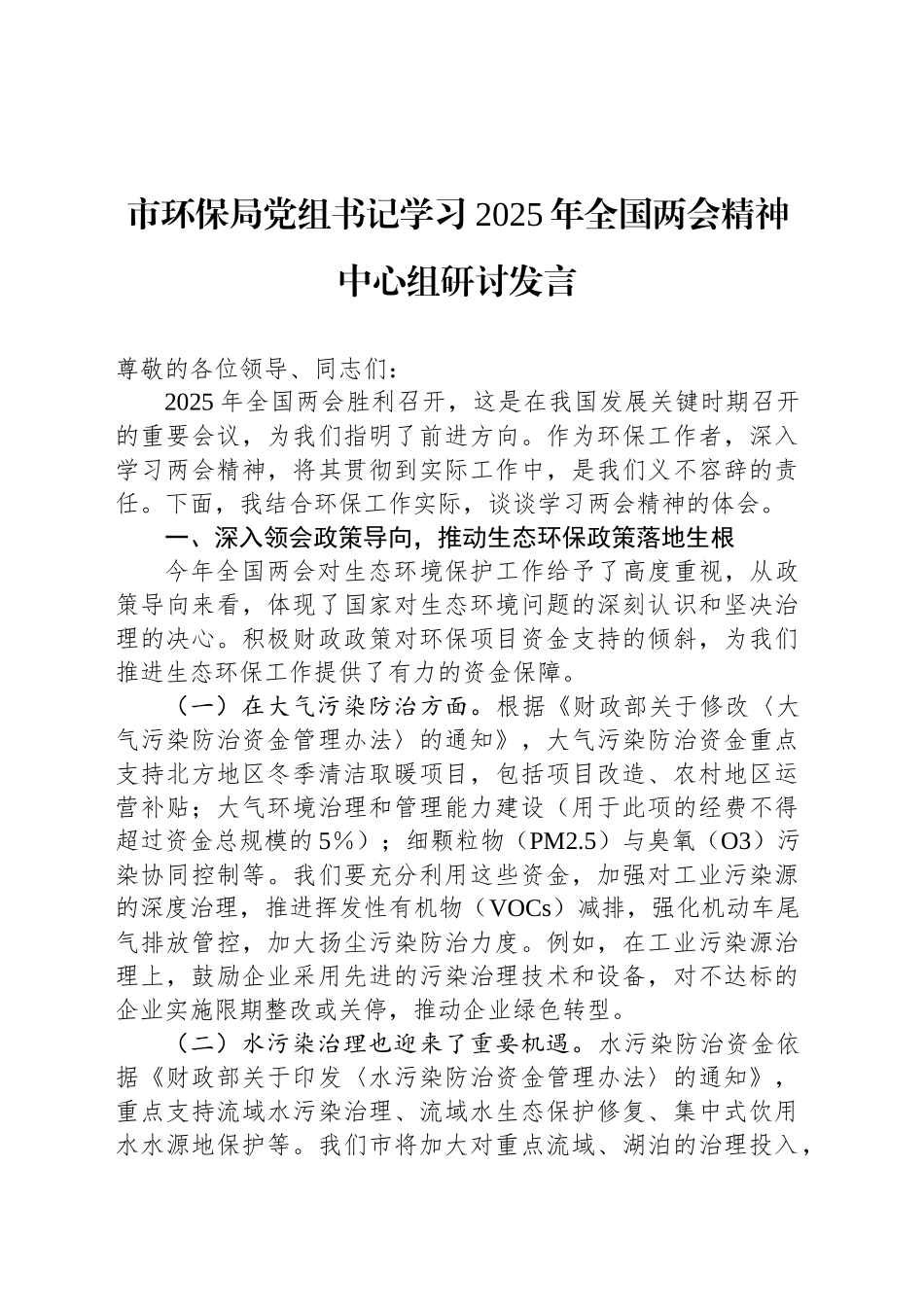 市环保局党组书记学习2025年全国两会精神中心组研讨发言尊敬的各位领导、同志们:2025年全国两会胜利召开,这是在我国发展关键时期召开的重要会议,为我们指明了前进方向。作为环保工作者,深入学习两会精神,将其贯彻到实际工作中,是我们义不容辞的责任。下面,我结合环保工作实际,谈谈学习两会精神的体会。一、深入领会政策导向,推动生态环保政策落地生根今年全国两会对生态环境保护工作给予了高度重视,从政策导向来看,体现了国家对生态环境问题的深刻认识和坚决治理的决心。积极财政政策对环保项目资金支持的倾斜,为我们推进生态环保工作提供了有力的资金保障。(一)在大气污染防治方面。根据《财政部关于修改〈大气污染防治资金管理办法〉的通知》,大气污染防治资金重点支持北方地区冬季清洁取暖项目,包括项目改造、农村地区运营补贴;大气环境治理和管理能力建设(用于此项的经费不得超过资金总规模的5%);细颗粒物(PM2.5)与臭氧(O3)污染协同控制等。我们要充分利用这些资金,加强对工业污染源的深度治理,推进挥发性有机物(VOCs)减排,强化机动车尾气排放管控,加大扬尘污染防治力度。例如,在工业污染源治理上,鼓励企业采用先进的污染治理技术和设备,对不达标的企业实施限期整改或关停,推动企业绿色转型。(二)水污染治理也迎来了重要机遇。水污染防治资金依据《财政部关于印发〈水污染防治资金管理办法〉的通知》,重点支持流域水污染治理、流域水生态保护修复、集中式饮用水水源地保护等。我们市将加大对重点流域、湖泊的治理投入,推进城市黑臭水体治理,加强饮用水水源地保护。比如,对城市内河进行综合整治,通过清淤、截污、生态修复等措施,改善内河水质,提升城市水环境质量。(三)土壤污染修复同样得到了政策支持。按照《财政部生态环境部关于印发〈土壤污染防治资金管理办法〉的通知》,土壤污染防治资金用于土壤污染源头防控、风险管控、修复治理等。我们要开展土壤污染状况详查,建立土壤污染数据库,针对受污染耕地和建设用地,采取科学的修复措施,确保土地安全利用。(四)适度宽松货币政策对环保企业融资也有着积极影响环保行业过去存在“融资贵”“融资难”的问题,随着货币政策的调整,环保企业的融资环境将得到改善,有利于企业扩大生产规模、提升环保技术水平。我们要积极引导金融机构加大对环保企业的信贷支持,鼓励金融创新,开发绿色金融产品,如绿色信贷、绿色债券等,为环保企业提供多元化的融资渠道。二、聚焦污染防治攻坚,持续改善生态环境质量(一)深化大气污染治理。京津冀及周边地区等重点区域的大气污染治理是我们工作的重中之重。严格落实大气污染治理强化措施,加强工业污染源治理,督促企业安装高效的污染治理设施,确保污染物达标排放。对于火电、钢铁等重污染行业,加快推进超低排放改造。加强机动车尾气排放管控,提高机动车尾气排放标准,加大对老旧车辆的淘汰力度,推广新能源汽车。加强对机动车检测机构的监管,确保检测数据真实有效。强化扬尘污染防治,对建筑工地、道路、物料堆场等采取有效的防尘降尘措施。要求建筑工地设置围挡、洒水降尘、物料覆盖等,对道路进行定期清扫和洒水,对物料堆场进行密闭或覆盖。(二)加大水污染防治力度。重点流域、湖泊的治理是改善水环境质量的关键。加大对河流、湖泊的生态修复力度,恢复水生态系统的功能。例如,在河流治理中,通过种植水生植物、投放水生动物等方式,提高水体的自净能力。推进城市黑臭水体治理,建立黑臭水体治理长效机制,防止黑臭水体反弹。加强饮用水水源地保护,划定饮用水水源保护区,设立警示标识,加强对保护区内的巡查和监管,确保饮用水水源安全。(三)强化土壤污染防治。开展土壤污染状况详查,全面掌握土壤污染的类型、程度和分布情况。建立土壤污染风险管控和修复名录,对列入名录的地块进行严格管理。推进受污染耕地的安全利用,通过调整种植结构、土壤改良等措施,降低农产品超标风险。对建设用地进行土壤污染风险评估,不符合要求的不得开发利用。加强对土壤污染防治的宣传教育,提高公众的土壤污染防治意识。三、加强生态保护与...