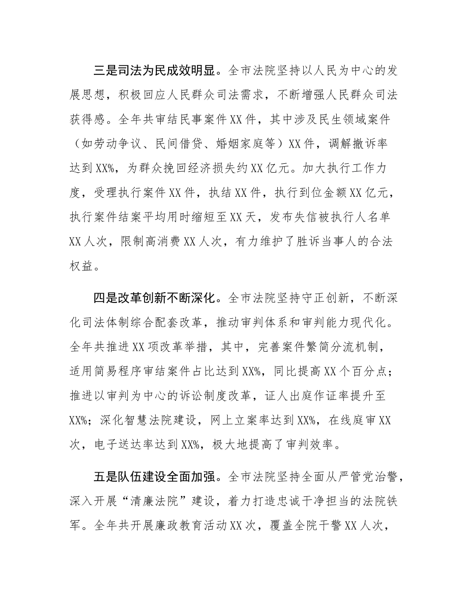 在2024年全市第四季度审判执行工作分析研判会上的讲话同志们:今天,我们召开全市法院审判执行工作分析研判会,主要任务是深入学习贯彻党的二十届三中全会精神,认真贯彻落实总书记关于政法工作的重要指示精神,全面落实中央、省委、市委政法工作会议和全国、全省法院院长会议精神,总结工作,分析形势,研究部署当前和今后一个时期全市法院审判执行工作,推动全市法院工作高质量发展。刚才,XX同志通报了全市法院审判执行工作情况,XX同志对全市法院审判执行工作进行了分析研判,XX同志对全市法院审判执行工作进行了安排部署,讲得都很好,我都同意。下面,我再讲几点意见。一、充分肯定成绩,切实增强做好全市法院审判执行工作的责任感和使命感今年以来,全市法院在市委的坚强领导下,在省法院的有力指导下,坚持以新时代中国特色社会主义思想为指导,深入学习贯彻党的二十届三中全会精神,全面贯彻法治思想,认真落实中央、省委、市委政法工作会议和全国、全省法院院长会议精神,紧紧围绕“努力让人民群众在每一个司法案件中感受到公平正义”目标,坚持服务大局、司法为民、公正司法,忠实履行宪法法律赋予的职责,各项工作取得新的进展。一是政治建设持续加强。全市法院始终把政治建设摆在首位,坚持党对法院工作的绝对领导,深刻领悟“两个确立”的决定性意义,增强“四个意识”、坚定“四个自信”、做到“两个维护”。全年共组织政治理论学习共XX次,覆盖全院干警XX人次,开展专题研讨XX次,撰写心得体会XX篇,通过多种形式不断提高政治判断力、政治领悟力、政治执行力,始终在思想上政治上行动上同以同志为核心的党中央保持高度一致。二是服务大局有力有效。全市法院紧紧围绕市委中心工作,充分发挥审判职能作用,为全市经济社会高质量发展提供了有力的司法服务和保障。全年共受理各类案件XX件,审结XX件,结案率达到XX%。其中,审结涉企案件XX件,帮助企业挽回经济损失约XX亿元;审结涉及重点项目建设案件XX件,保障了XX个重点项目的顺利推进;积极参与优化营商环境工作,在XX营商环境评价中相关指标得分提升了XX分。三是司法为民成效明显。全市法院坚持以人民为中心的发展思想,积极回应人民群众司法需求,不断增强人民群众司法获得感。全年共审结民事案件XX件,其中涉及民生领域案件(如劳动争议、民间借贷、婚姻家庭等)XX件,调解撤诉率达到XX%,为群众挽回经济损失约XX亿元。加大执行工作力度,受理执行案件XX件,执结XX件,执行到位金额XX亿元,执行案件结案平均用时缩短至XX天,发布失信被执行人名单XX人次,限制高消费XX人次,有力维护了胜诉当事人的合法权益。四是改革创新不断深化。全市法院坚持守正创新,不断深化司法体制综合配套改革,推动审判体系和审判能力现代化。全年共推进XX项改革举措,其中,完善案件繁简分流机制,适用简易程序审结案件占比达到XX%,同比提高XX个百分点;推进以审判为中心的诉讼制度改革,证人出庭作证率提升至XX%;深化智慧法院建设,网上立案率达到XX%,在线庭审XX次,电子送达率达到XX%,极大地提高了审判效率。五是队伍建设全面加强。全市法院坚持全面从严管党治警,深入开展“清廉法院”建设,着力打造忠诚干净担当的法院铁军。全年共开展廉政教育活动XX次,覆盖全院干警XX人次,查处违纪违法干警XX人,同比下降XX%。加强业务培训,举办各类业务培训班XX期,培训干警XX人次,干警队伍的整体素质和业务能力得到显著提升。在充分肯定成绩的同时,我们也要清醒地看到,全市法院工作还存在一些问题和不足。一是审判执行质效有待提升。全市法院审判执行工作还存在一些短板弱项,部分审判执行质效指标排名靠后。二是司法服务保障能力有待增强。全市法院服务保障经济社会高质量发展的精准度、实效性有待提升。三是司法为民水平有待提高。全市法院在司法为民方面还存在一些薄弱环节,人民群众司法获得感有待增强。四是队伍建设有待加强。全市法院队伍建设还存在一些短板弱项,司法作风、司法能力有待提升。对于这些问题和不足,我们要高度重视,采取有力措施,切实加以解决。二、提高政治站位,切实增强做好全市法院审判执行工作的责任...