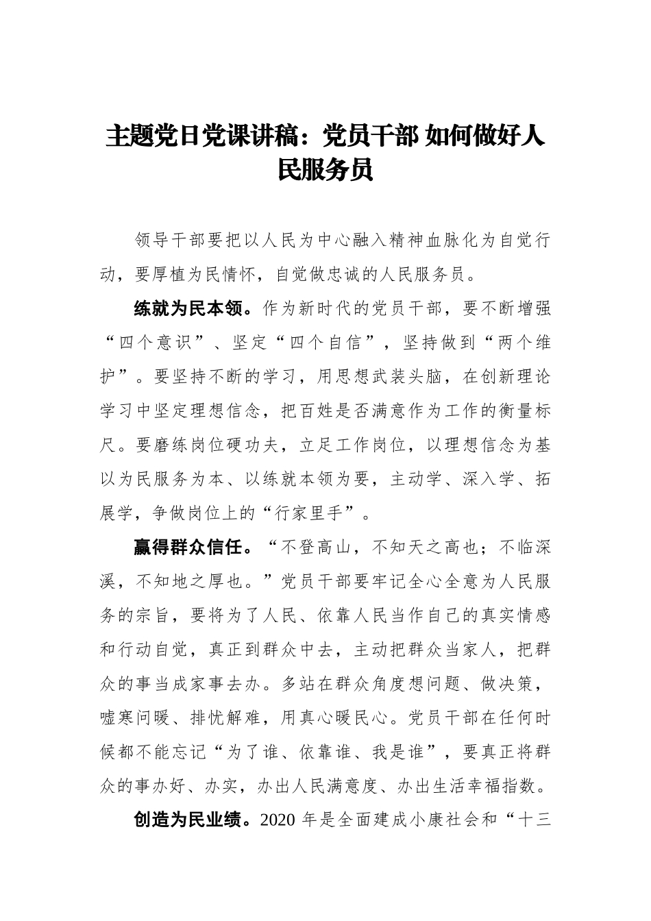 主题党日党课讲稿:党员干部如何做好人民服务员领导干部要把以人民为中心融入精神血脉化为自觉行动,要厚植为民情怀,自觉做忠诚的人民服务员。练就为民本领。作为新时代的党员干部,要不断增强“四个意识”、坚定“四个自信”,坚持做到“两个维护”。要坚持不断的学习,用思想武装头脑,在创新理论学习中坚定理想信念,把百姓是否满意作为工作的衡量标尺。要磨练岗位硬功夫,立足工作岗位,以理想信念为基以为民服务为本、以练就本领为要,主动学、深入学、拓展学,争做岗位上的“行家里手”。赢得群众信任。“不登高山,不知天之高也;不临深溪,不知地之厚也。”党员干部要牢记全心全意为人民服务的宗旨,要将为了人民、依靠人民当作自己的真实情感和行动自觉,真正到群众中去,主动把群众当家人,把群众的事当成家事去办。多站在群众角度想问题、做决策,嘘寒问暖、排忧解难,用真心暖民心。党员干部在任何时候都不能忘记“为了谁、依靠谁、我是谁”,要真正将群众的事办好、办实,办出人民满意度、办出生活幸福指数。创造为民业绩。2020年是全面建成小康社会和“十三五”规划收官之年,决战决胜脱贫攻坚离不开每一个党员干部的担当奉献。要有“善始善终、善作善成”的实干精神,以行动为号令、以实干为准绳,要把困难当作垫脚石把干劲当作催征鼓。在工作中要沉下心、俯下身、用足力做身先士卒的表率,做服务于民的公仆,在干事创业中提升执行力,在攻坚克难中增强突破力,在负责带头中提高影响力。发扬密切联系群众的作风,坚决反对形式主义、官僚主义,保持艰苦朴素、清正廉洁的本色,用实干履行对群众的承诺,用实效检验为民造福的政绩。