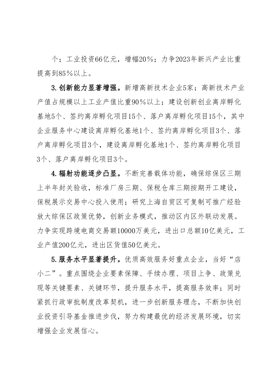 在全区经济工作务虚会上的交流发言2023年是实施“十四五”规划第三个年头,也是我区加快打造特色产业、推动经济转型发展的关键之年。根据会议通知要求现将全年经济工作思路、目标、措施汇报如下:一、工作思路深入贯彻党的XX大、中央经济工作会议精神,全面落实省、市、区相关要求,坚持以质量和效益为中心,以创新和转型为重点,不断提升产业层次、做优产业特色、做大经济总量,加快实现千亿级产业园区发展目标,为全区领先发展、率先发展作出新贡献。二、工作目标1.经济总量稳步提升。力争实现规模以上工业产值500亿元,增幅20%;规模以上工业增加值100亿元;规模以上工业主营业务收入450亿元,增幅20%;工业利税40亿元,增幅20%;工业利润30亿元,增幅20%;净增规模以上工业企业5家(新增规模以上工业企业6家);工业企业所属期一般纳税人开票销售25-亿元,增幅20%;实现进出口总额10亿美元,增幅20%。2.产业集聚明显加快。紧紧围绕电子信息和高端装备制造业做大做强新兴产业。新签约亿元以上产业项目10个;新开工亿元以上产业项目30个;新竣工亿元以上产业项目15个;工业投资66亿元,增幅20%;力争2023年新兴产业比重提高到85%以上。3.创新能力显著增强。新增高新技术企业5家;高新技术产业产值占规模以上工业产值比重90%以上;建设创新创业离岸孵化基地5个、签约离岸孵化项目15个、落户离岸孵化项目15个,其中企业服务中心建设离岸孵化基地1个、签约离岸孵化项目3个、落户离岸孵化项目3个,建设离岸孵化基地1个、签约离岸孵化项目3个、落户离岸孵化项目3个。4.辐射功能逐步凸显。不断完善载体功能,确保综保区三期上半年封关验收,标准厂房三期、保税仓库三期按期开工建设,保税展示交易中心投入使用;研究上海自贸区可复制可推广经验放大综保区政策优势,创新业务模式,推动区内区外联动发展。力争实现跨境电商交易额10000万美元,进出口总额10亿美元,工业产值200亿元,进出区货值50亿美元。5.服务水平显著提升。优质高效服务好重点企业,当好“店小二”。重点围绕企业要素保障、手续办理、项目上争、政策兑现等关键要素、关键环节,提升服务水平,提高服务效率;同时紧抓行政审批制度改革契机,进一步创新服务理念,不断加快创业投资引导基金推进步伐,努力构建最优的经济发展环境,切实增强企业发展信心。三、工作措施1.聚焦“两大特色产业”,全力推进重大项目建设。坚定不移把项目大突破作为工作的头版头条,一手抓落地开工一手抓竣工达产。一是突出一批签约项目抓开工。重点推进供电公司总部经济项目、南厂区项目开工建设,按序时完成形象进度,确保春节前主体开工建设;同时重点抓好无人靶机项目、高端连接器产业化项目等一批产业提升项目,加快推进建设进度,促进项目能够尽快启动实施。二是突出一批开工项目抓竣工。重点抓好重大项目推进,确保上半年所有厂房全面竣工并投入使用促进项目产能全面释放;同时加快推进XX项目建设进度,确保年底主体全面竣工,明年一季度前竣工达产。三是突出一批中小项目抓规模。认真梳理现有入驻标准厂房的生产企业,想方设法帮助企业开拓市场,解决企业资金瓶颈,及时强化统计指导,促进企业扩大产能,快速发展上规模。2.坚持“三个不相信”,全力提升企业服务水平。重点突出关键要素、关键环节抓服务,努力构建最优的经济发展环境。一是围绕土地保障抓服务。全面梳理项目开工需求,及早争取土地指标,按照时间要求,保障重大项目用地需要。二是围绕手续办理抓服务。随着重大项目投产进入倒计时,工作重点将从“项目现场问题和矛盾的协调”及时转移到“相关规划、建设许可证及消防、环保、质监验收”上面来,确保重大项目在投产前完成所有审批手续,保证重大项目顺利竣工、按期投产。三是围绕创新创业抓服务。坚持“走出去、请进来”,主动加强与科技、商务等部门衔接,与省内外高校、科研院所联系,充分利用高校、科研院所研发平台、重点实验室,结合我区产业特色大力推进科技孵化合作和产学研合作,提升我区产业层次,解决企业技术难题;积极引导区内企业与国内同行业前沿企业进行高位嫁接,同时加快实施企业“互联网+...
