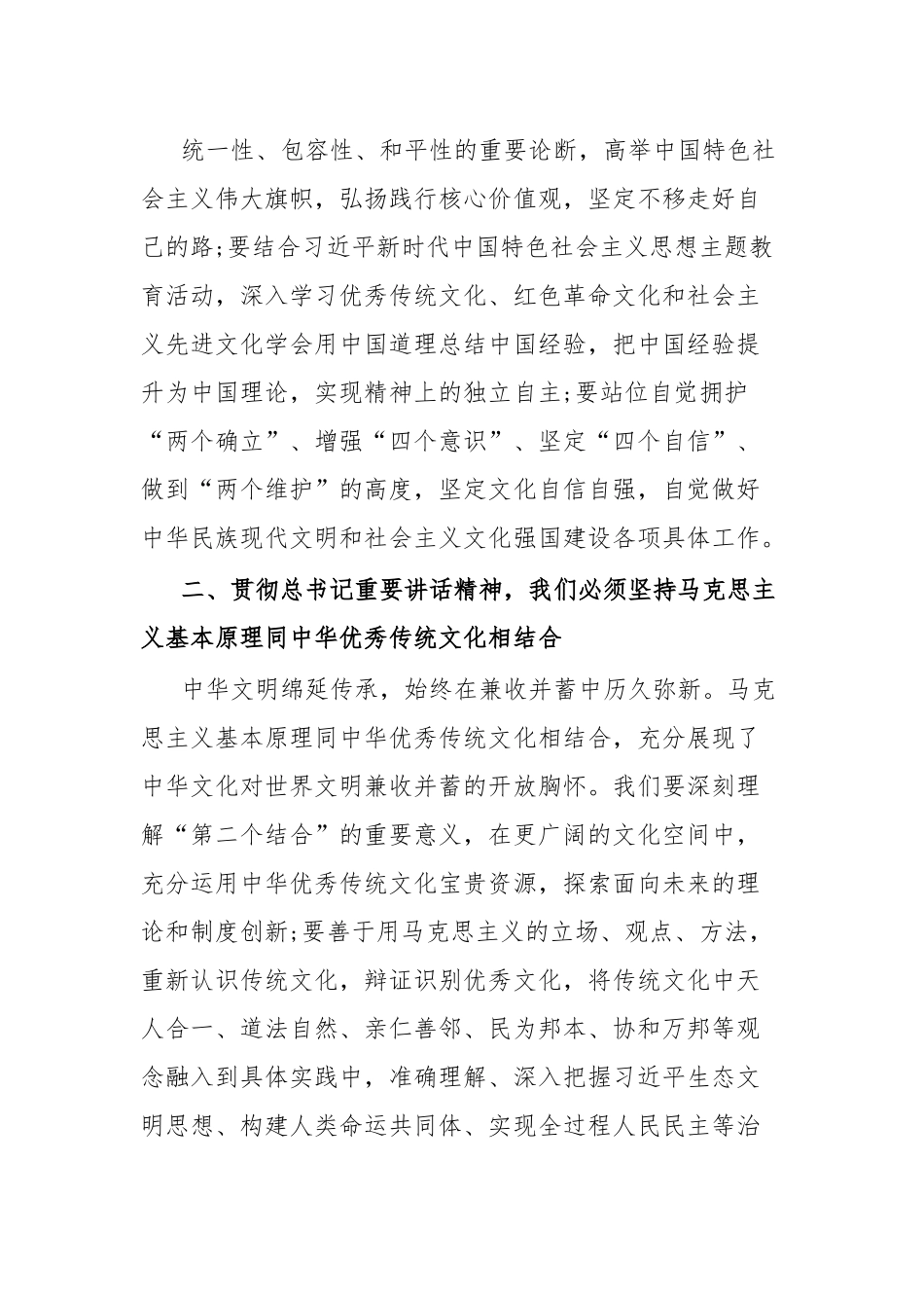 县长围绕习近平总书记在文化传承发展座谈会上的重要讲话精神研讨发言刚才,XX书记传达了习近平总书记在文化传承发展座谈会上的重要讲话精神。通过这次学习,从中深刻感悟到习近平总书记深厚的文化情怀、高度的文化自觉、强烈的文化担当和宽广的文明胸襟。总书记重要讲话是习近平新时代中国特色社会主义思想的重要组成部分,是对中华文化和中华文明的继承弘扬和创新发展讲话中提出的新观点、新论断,创造性地丰富和发展了文化建设思想,为我们自觉担负起新的文化使命、努力建设中华民族现代文明提供了思想和行动指南。围绕贯彻落实总书记重要讲话精神,传承发展我县文化事业,有几点体会和思考,在这里与大家交流一下,一、贯彻总书记重要讲话精神,我们首先要坚定文化自信,增强思想自觉文化自信是凝聚和引领民族奋进的强大精神力量。党的十八大以来,总书记高度重视文化自信,多次强调“文化兴国运兴,文化强民族强”,在党的XX大报告中更是提出要“推进文化自信自强,铸就社会主义文化新辉煌”。作为党中央战略部署的基层践行者、推动者,我们要自觉从源远流长的历史角度认识中华文化,积极从现实发展角度继承发展中华文化,深刻领悟中华文明具有突出的连续性、创新性、统一性、包容性、和平性的重要论断,高举中国特色社会主义伟大旗帜,弘扬践行核心价值观,坚定不移走好自己的路;要结合习近平新时代中国特色社会主义思想主题教育活动,深入学习优秀传统文化、红色革命文化和社会主义先进文化学会用中国道理总结中国经验,把中国经验提升为中国理论,实现精神上的独立自主;要站位自觉拥护“两个确立”、增强“四个意识”、坚定“四个自信”、做到“两个维护”的高度,坚定文化自信自强,自觉做好中华民族现代文明和社会主义文化强国建设各项具体工作。二、贯彻总书记重要讲话精神,我们必须坚持马克思主义基本原理同中华优秀传统文化相结合中华文明绵延传承,始终在兼收并蓄中历久弥新。马克思主义基本原理同中华优秀传统文化相结合,充分展现了中华文化对世界文明兼收并蓄的开放胸怀。我们要深刻理解“第二个结合”的重要意义,在更广阔的文化空间中,充分运用中华优秀传统文化宝贵资源,探索面向未来的理论和制度创新;要善于用马克思主义的立场、观点、方法,重新认识传统文化,辩证识别优秀文化,将传统文化中天人合一、道法自然、亲仁善邻、民为邦本、协和万邦等观念融入到具体实践中,准确理解、深入把握习近平生态文明思想、构建人类命运共同体、实现全过程人民民主等治国理政重要论述,真正做到思想上高度认同、行动上坚决落实;要积极学习借鉴世界优秀文明成果,在学习中超越,在借鉴中完善,促进外来文化本土化,不断焕发文化强国崭新生命力。三、贯彻总书记重要讲话精神,我们要在传承历史文化和加快文化事业发展上展现新担当新作为坚持守正创新,赓续历史文脉。既是总书记的殷切嘱托,也是我们发展的现实需要。这方面要做的工作很多,当前重点应该从四个方面寻求突破。一是结合XX,将XX等元素进一步物化,借旅发平台更好展现XX传统历史文化,提升XX文化知名度和影响力。二是广泛收集征集民间文物资料,规划设计好博物馆展出工作,组织力量编每件文物历史故事,让文物活起来,诉说椒乡文化故事,传承XX历史血脉。三是搜集整理民间历史地情资料,组织各方面、各层次力量,结合村史编纂工作,推出一批文艺、史志精品,让更多XX历史文化以文字的形式更好传承下去。四是在做好XX等现有非物质文化遗产抢救保护、合理开发利用的基础上,进一步做好我县非物质文化遗产整理申报工作,争取更多纳入国家省市非物质文化遗产名录,更好弘扬XX传统文化,繁荣县域文化事业。发言完毕。